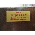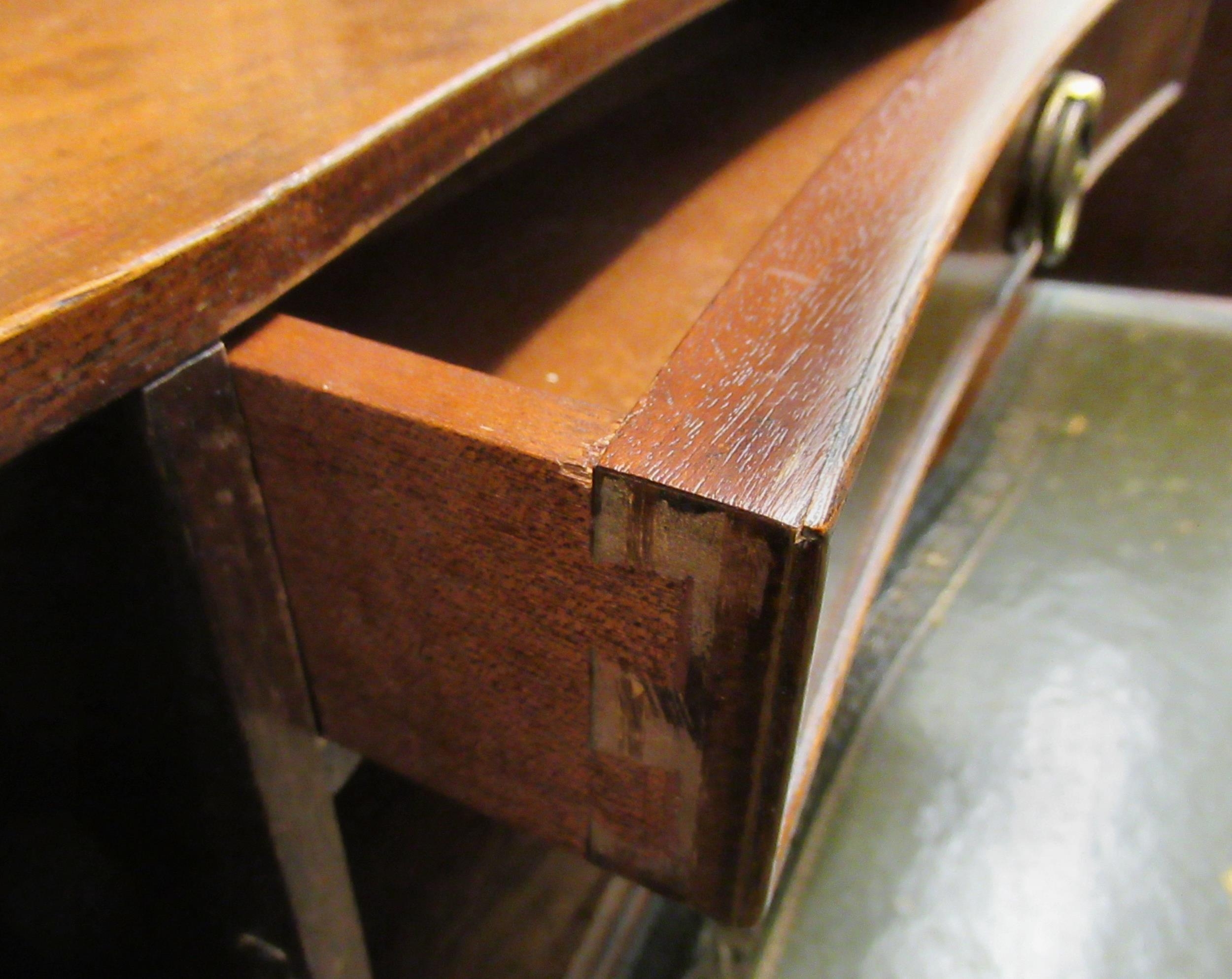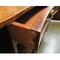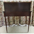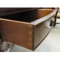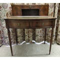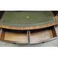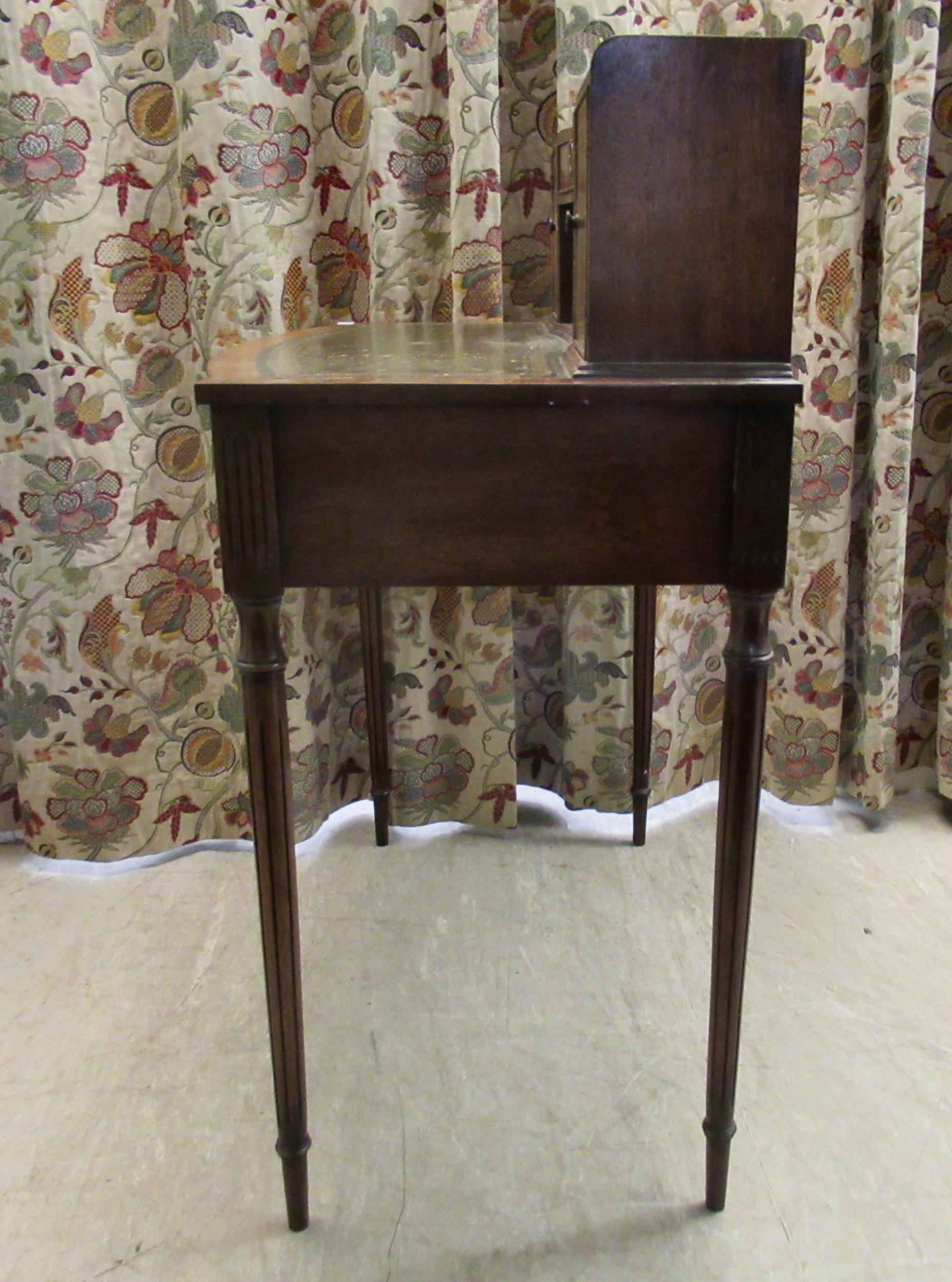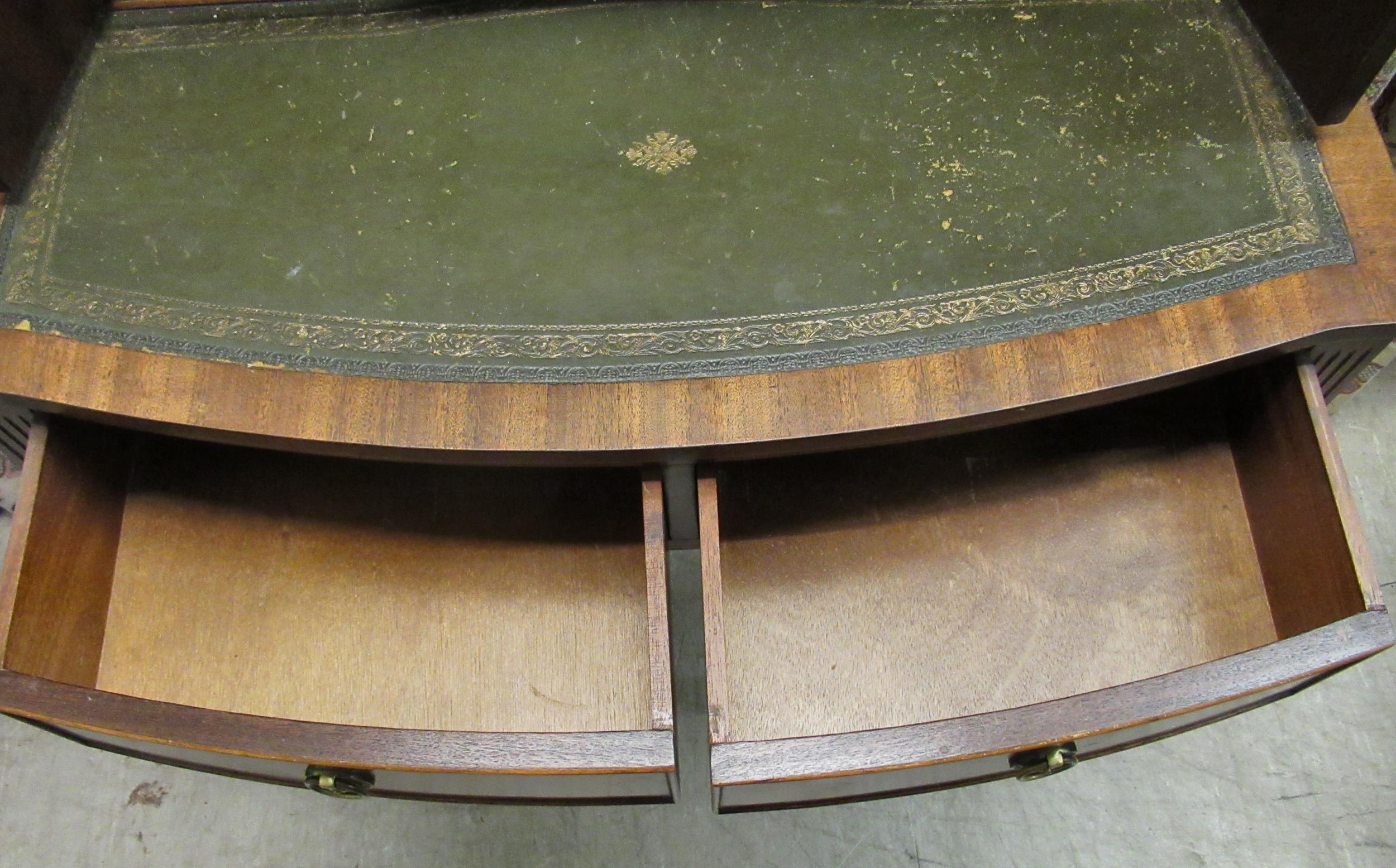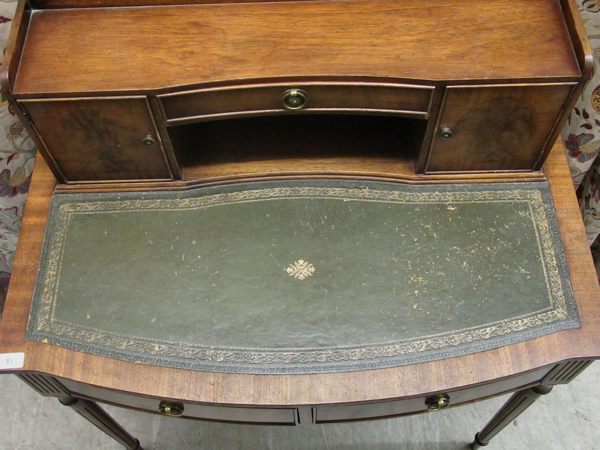 A modern crossbanded mahogany writing desk with an arrangement of drawers/doors/open shelves, the green hide scriber over two bow front frieze drawers, raised on tapered, fluted legs 42"h 34"w