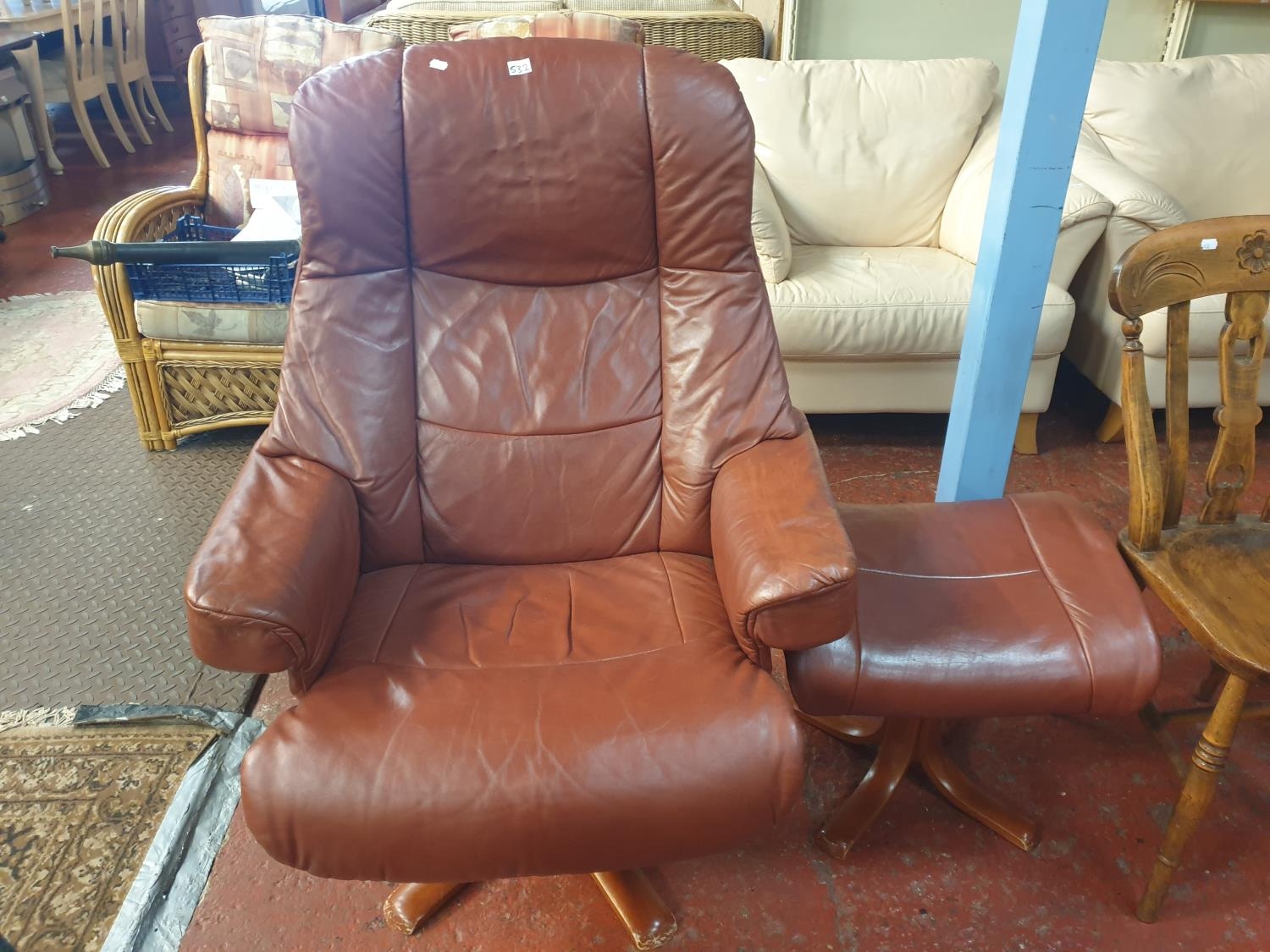 Rust Coloured Leather Effect Swivel & Reclining Chair with Matching Foot Stool.