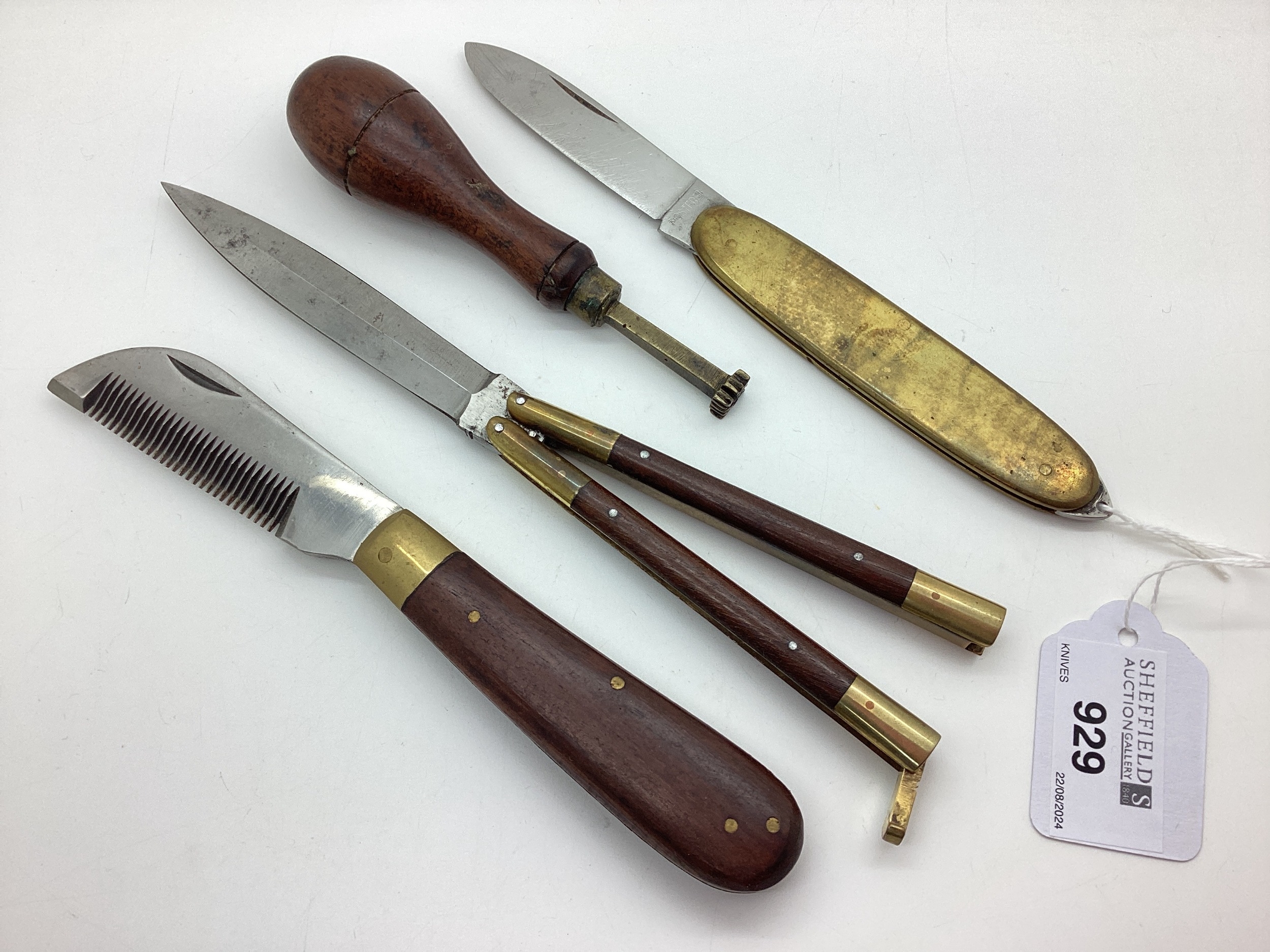 Beard / Moustache Comb, decorative stamp, folding knives.