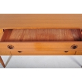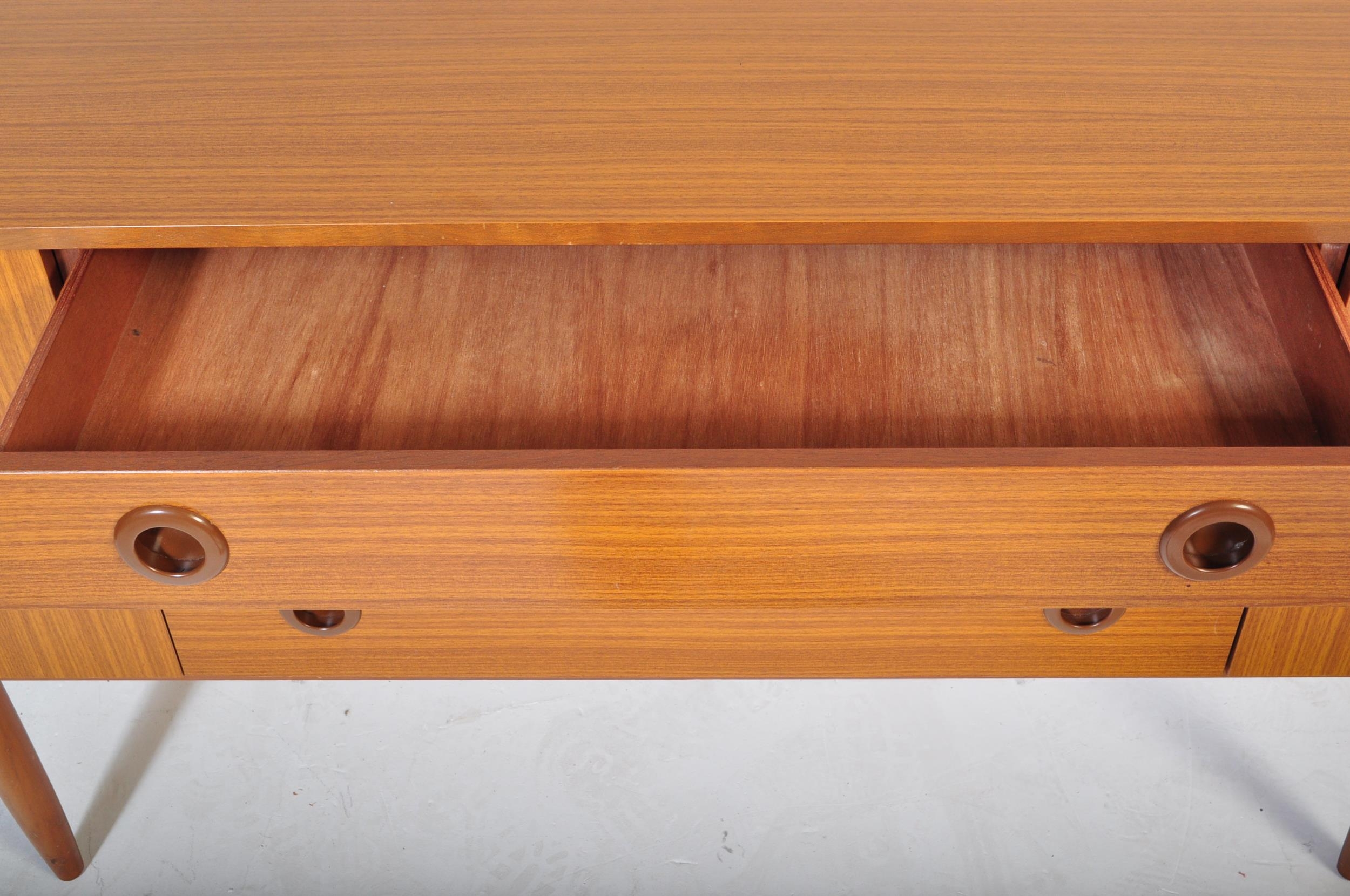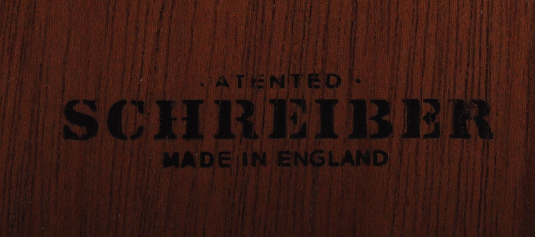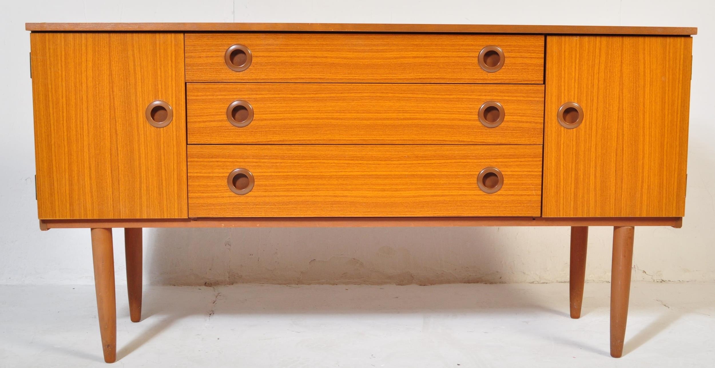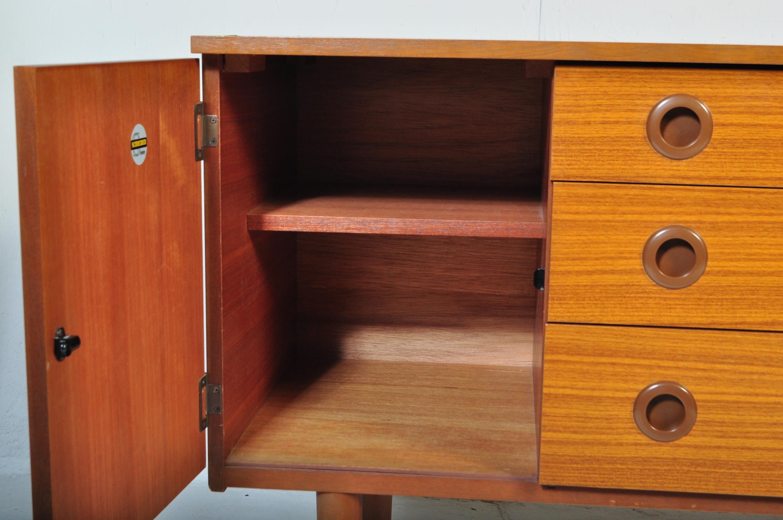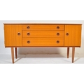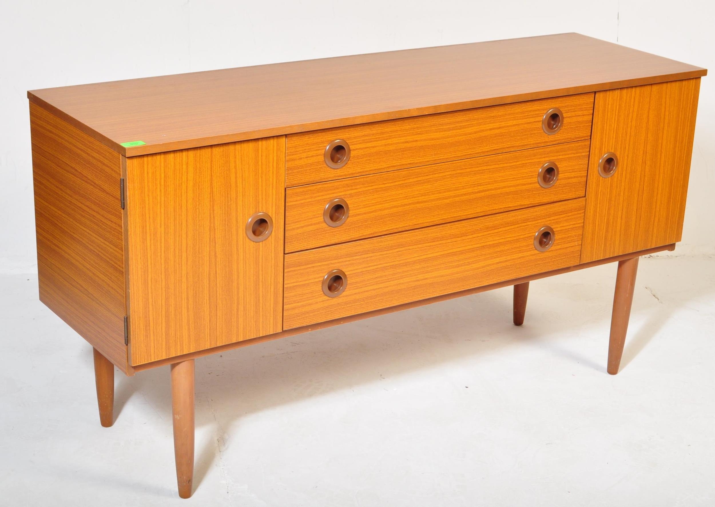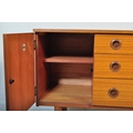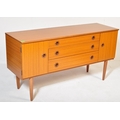 A retro vintage mid 20th Century teak sideboard credenza by Schreiber. Bank of three drawers flanked by two cupboards. Raised on tapering cylindrical legs. Legs unscrew for ease of transport. Measures approx; 73cm x 137cm x 43cm.