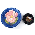 A Moorcroft Pottery Bowl, painted in the 'Magnolia' pattern with pink flowers against a dark blue ground, impressed marks, 19cm diameter; A Moorcroft Ashtray, in the 'Columbine' pattern, impressed marks, 11.5cm diameter. (2)