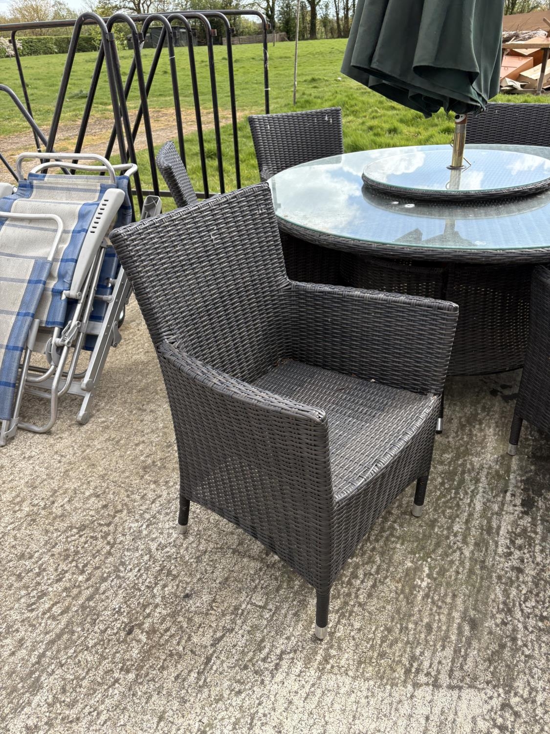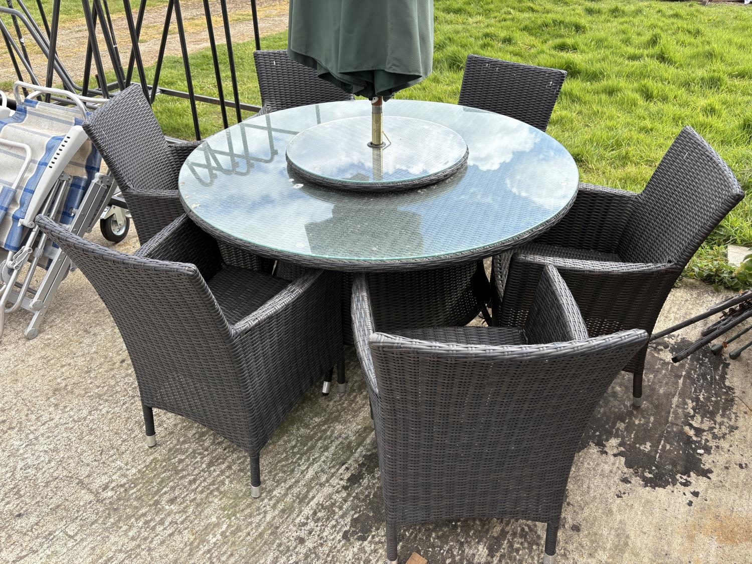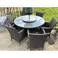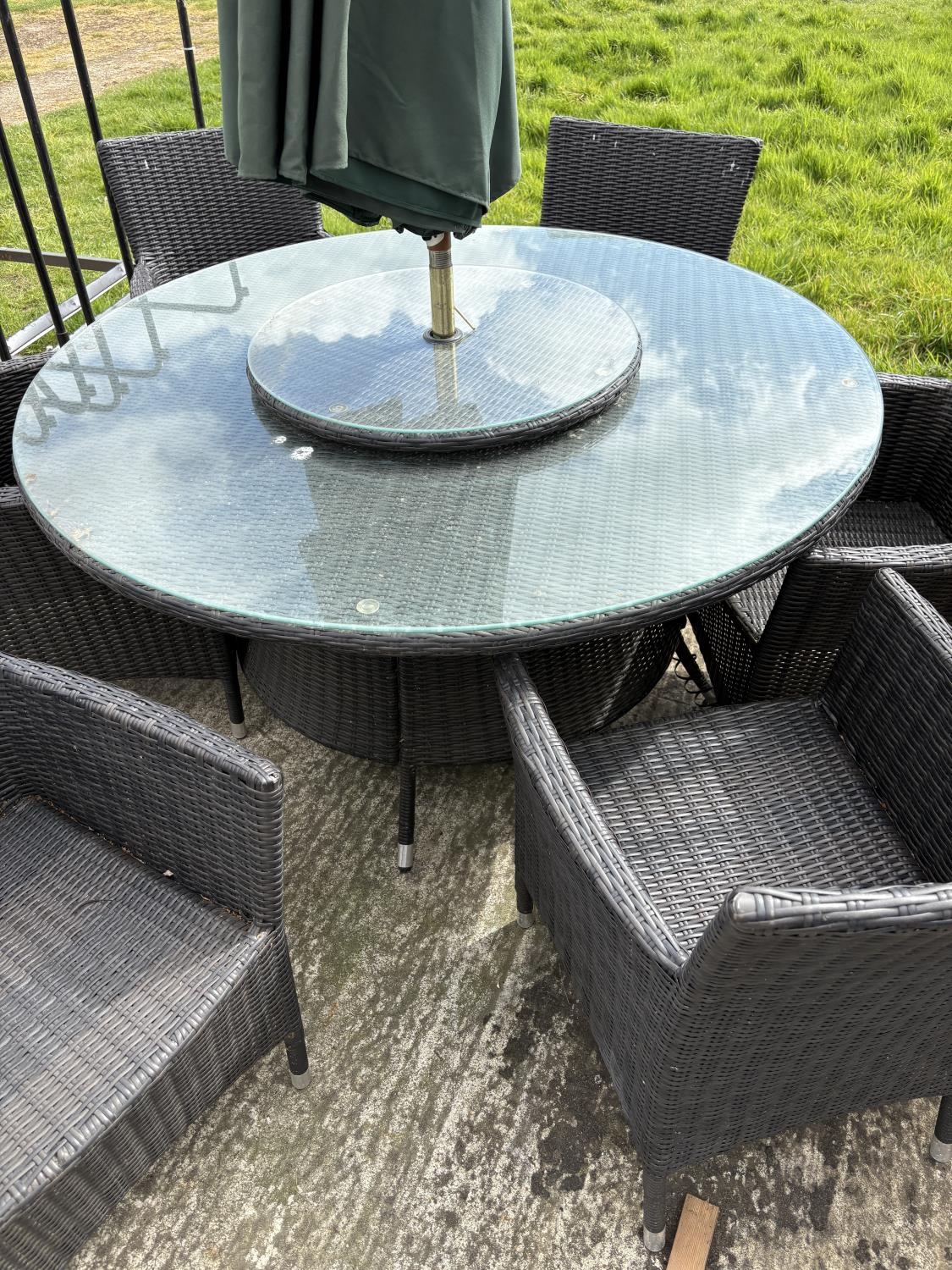A modern black ratan garden table together with six chairs, lazy Susan and parasol 142cm diameter