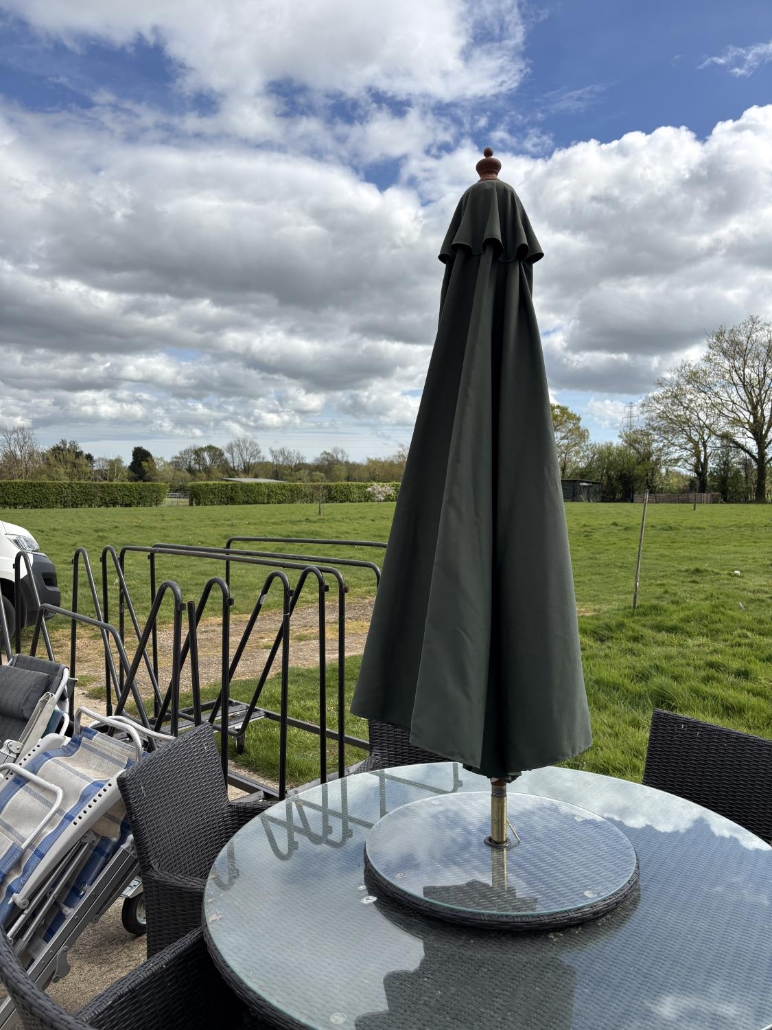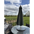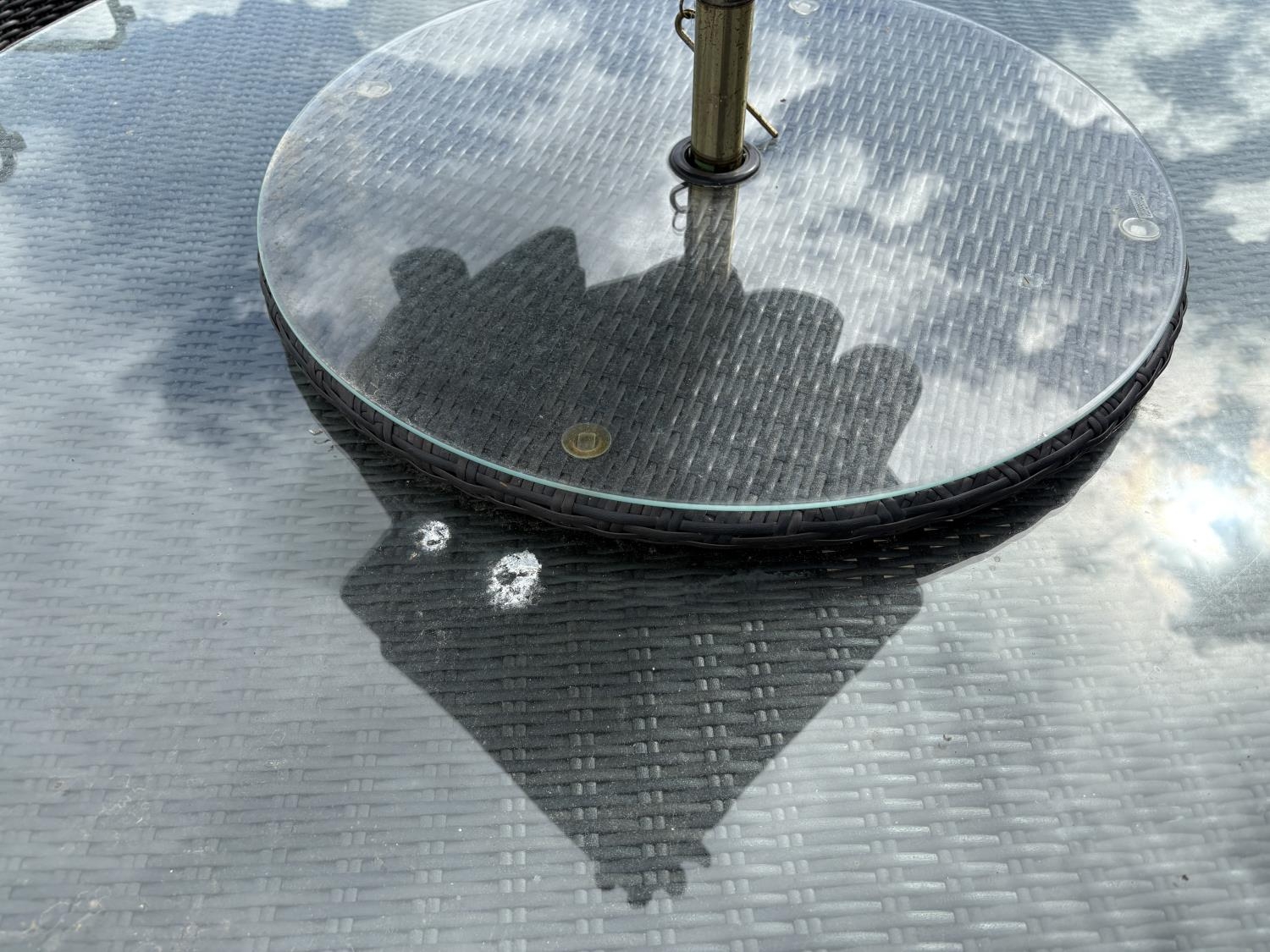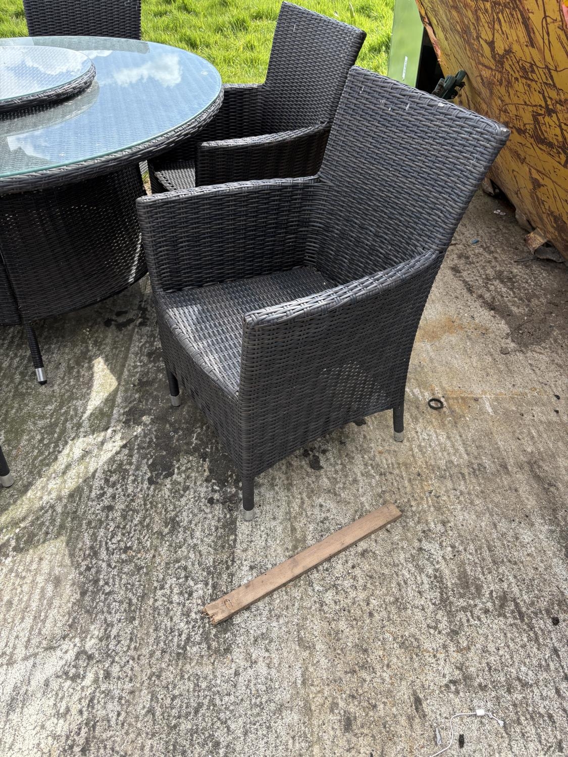 A modern black ratan garden table together with six chairs, lazy Susan and parasol 142cm diameter