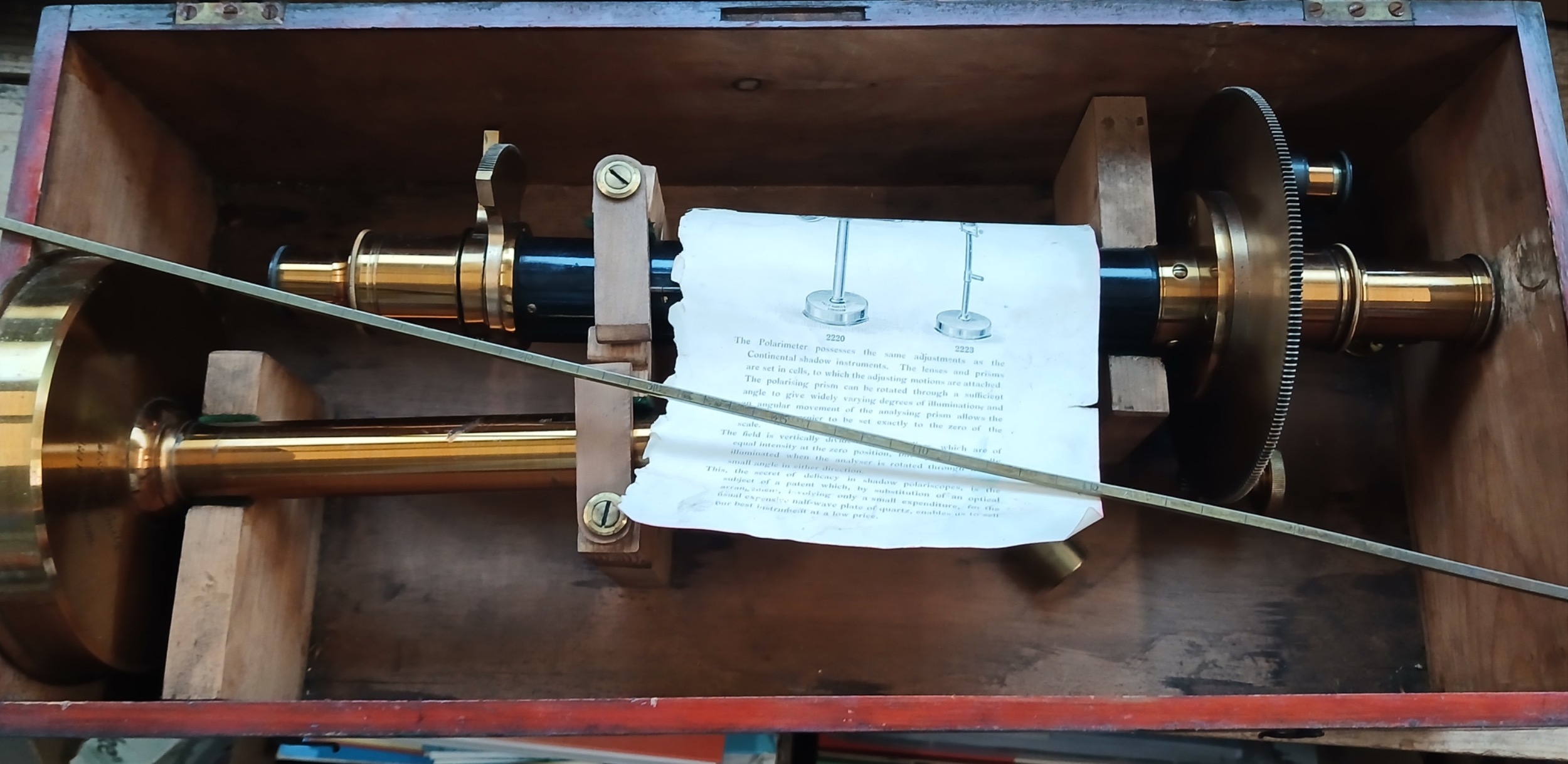 A Philip Harris & Co. Polarimeter and an antique brewer's rule/rod marked in barrels, hogsheads, kilderkins and firkins.