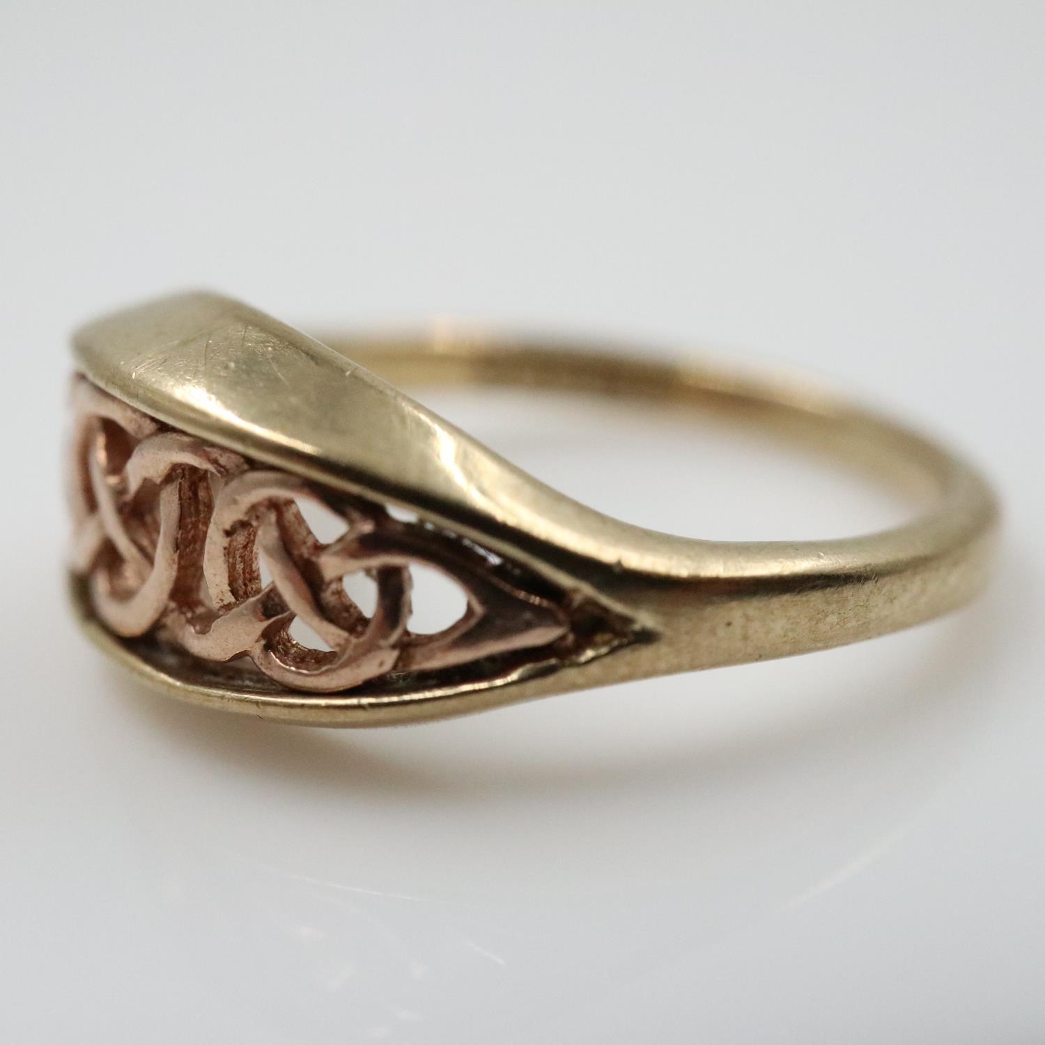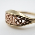CLOGAU 9ct yellow and rose gold band with Celtic style pierced front, size K, 2.6g. UK P&P Group 0 (£7+VAT for the first lot and £1+VAT for subsequent lots)