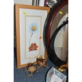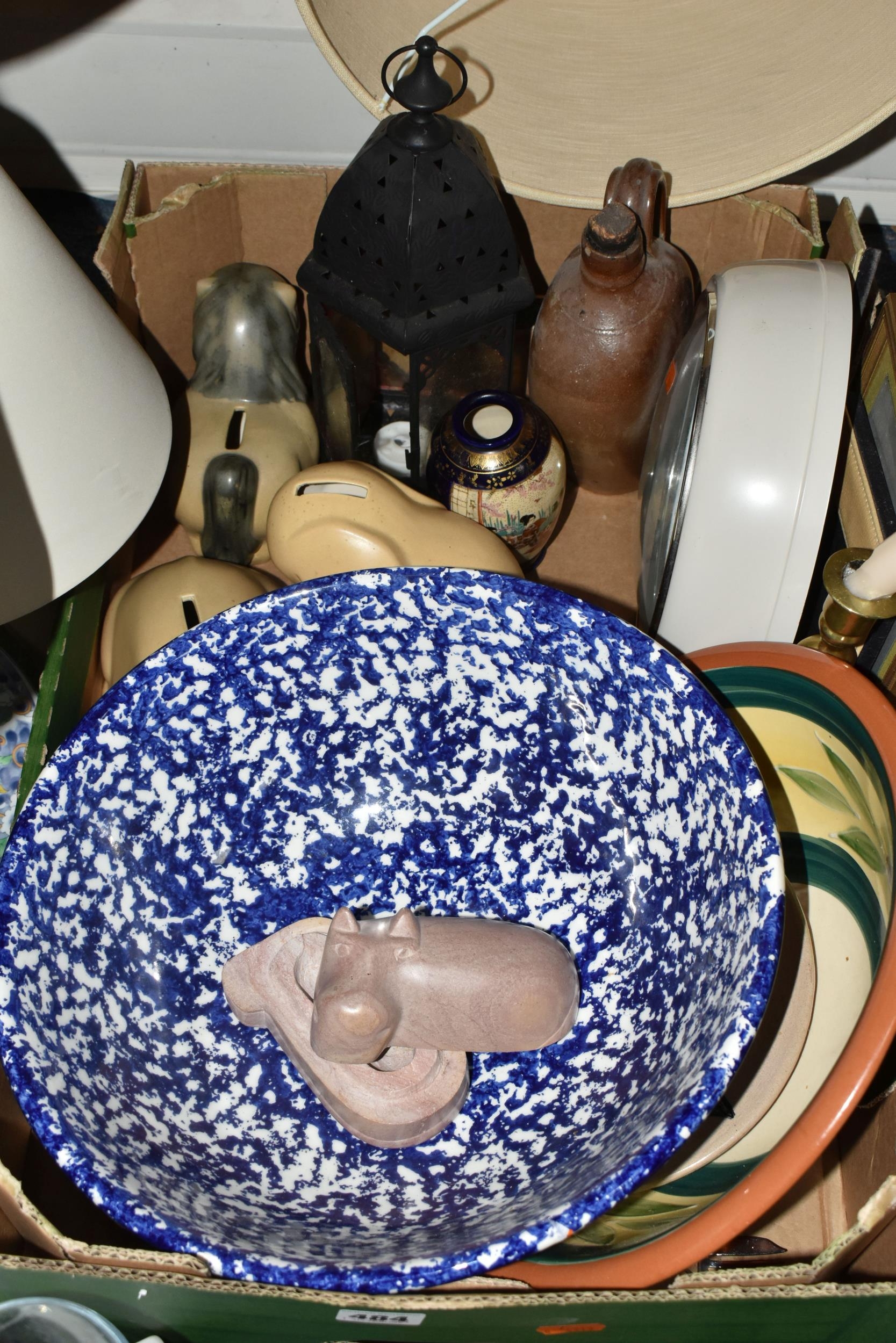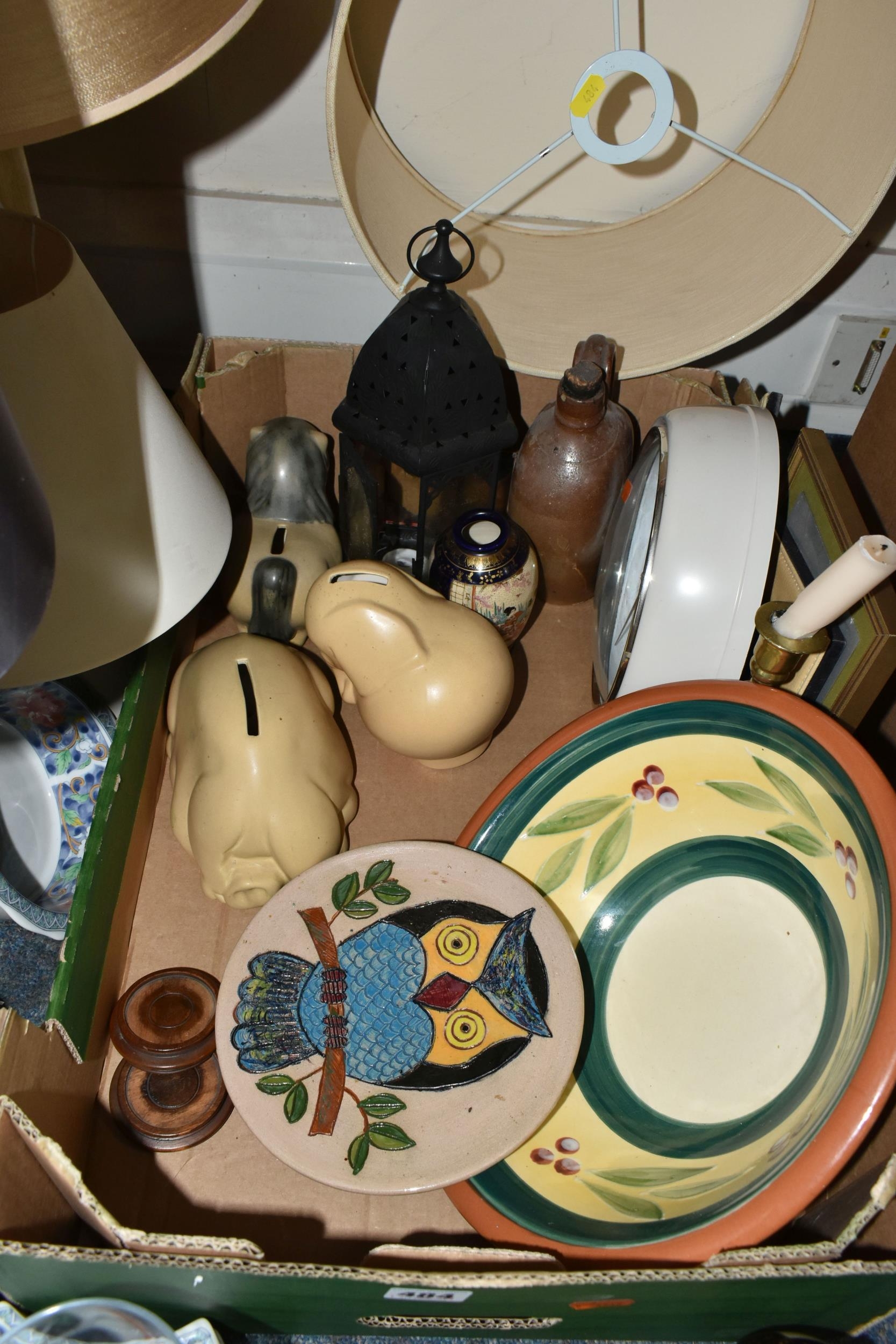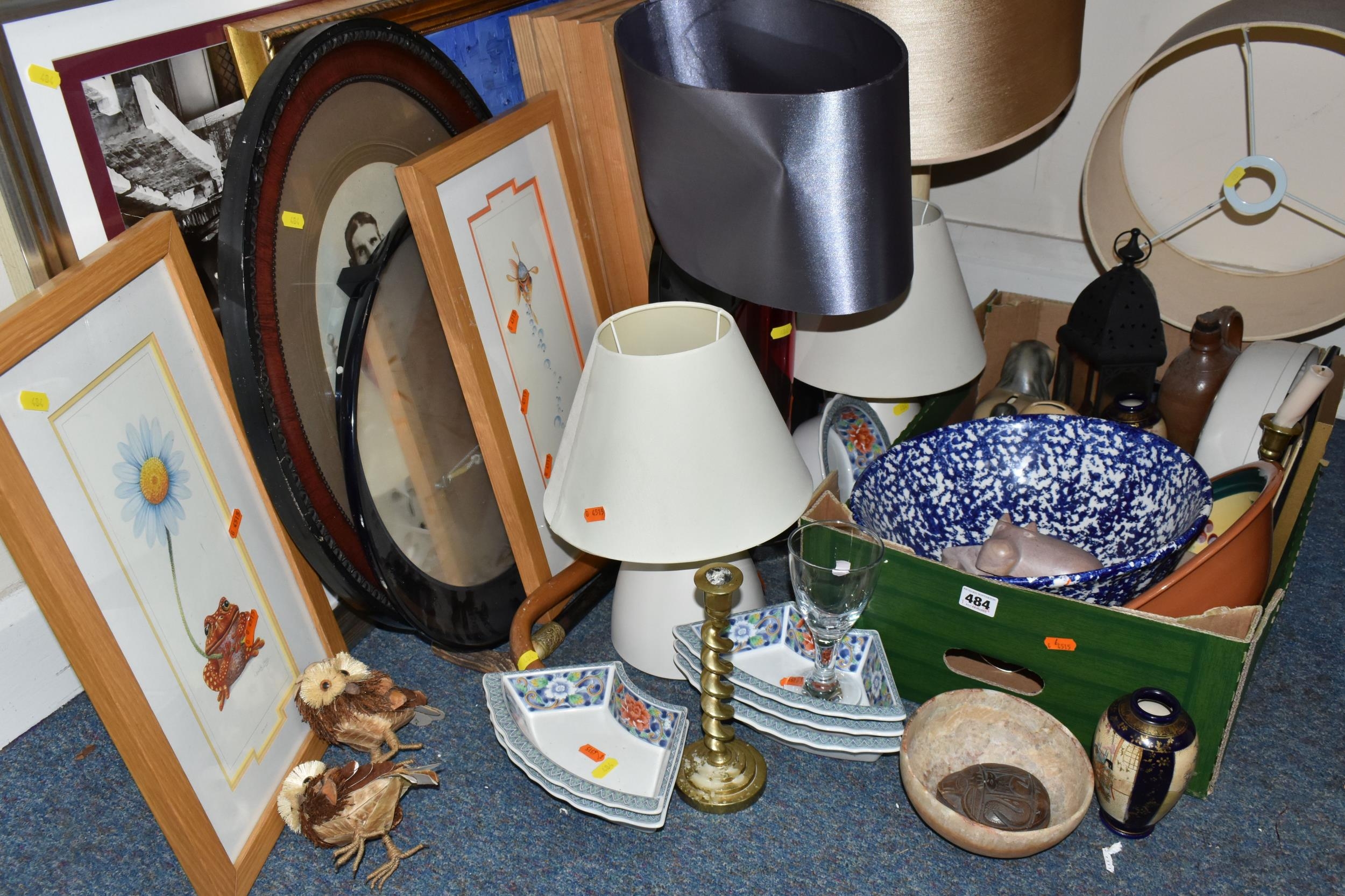 A BOX AND LOOSE CERAMICS, PICTURES, LAMPS AND SUNDRY ITEMS, to include Honiton pottery animal money boxes, a pair of brass candlesticks with twisted stems, a pair of small oriental vases, four table lamps, framed prints, etc (1 box + loose) (sd, lamps untested)