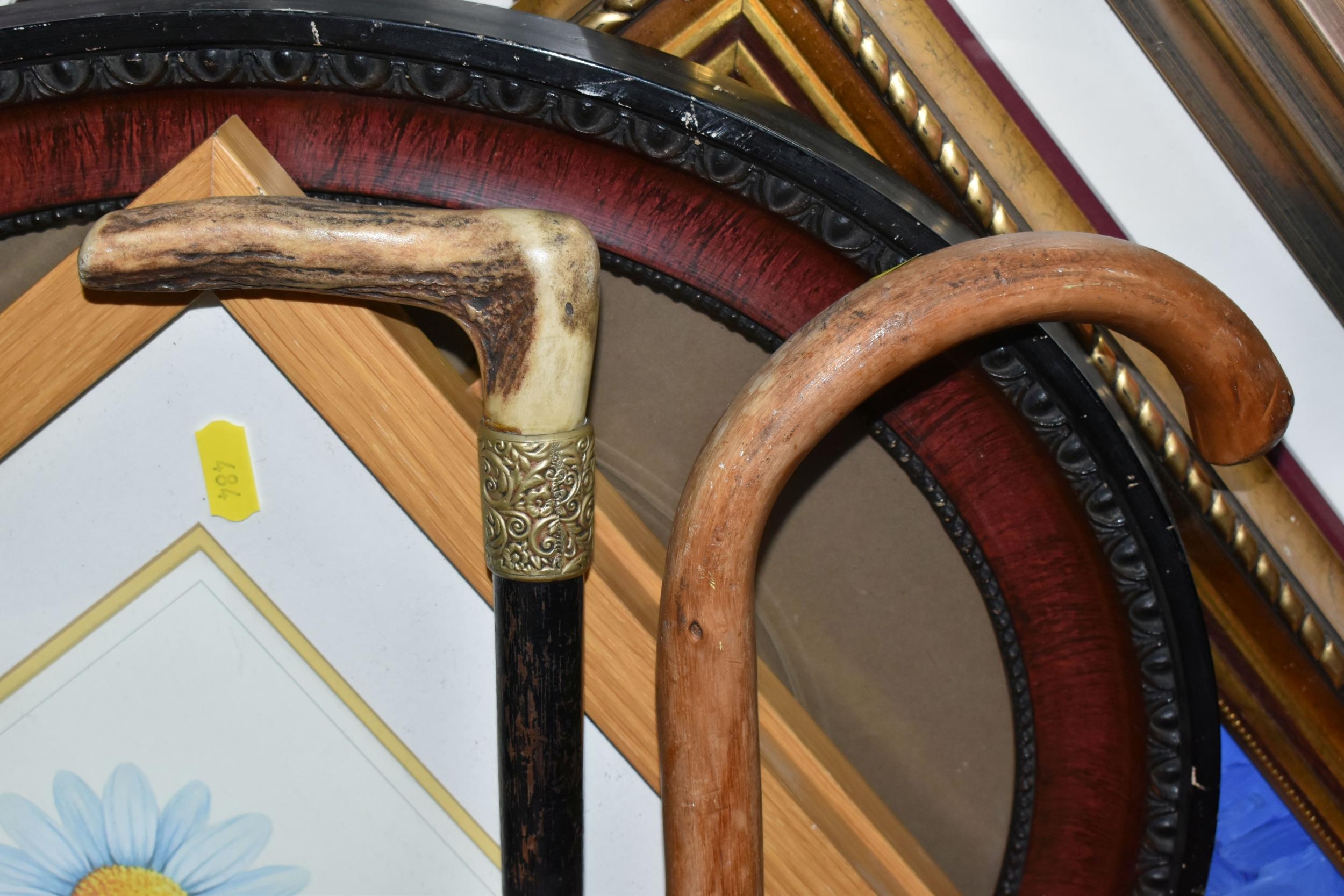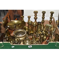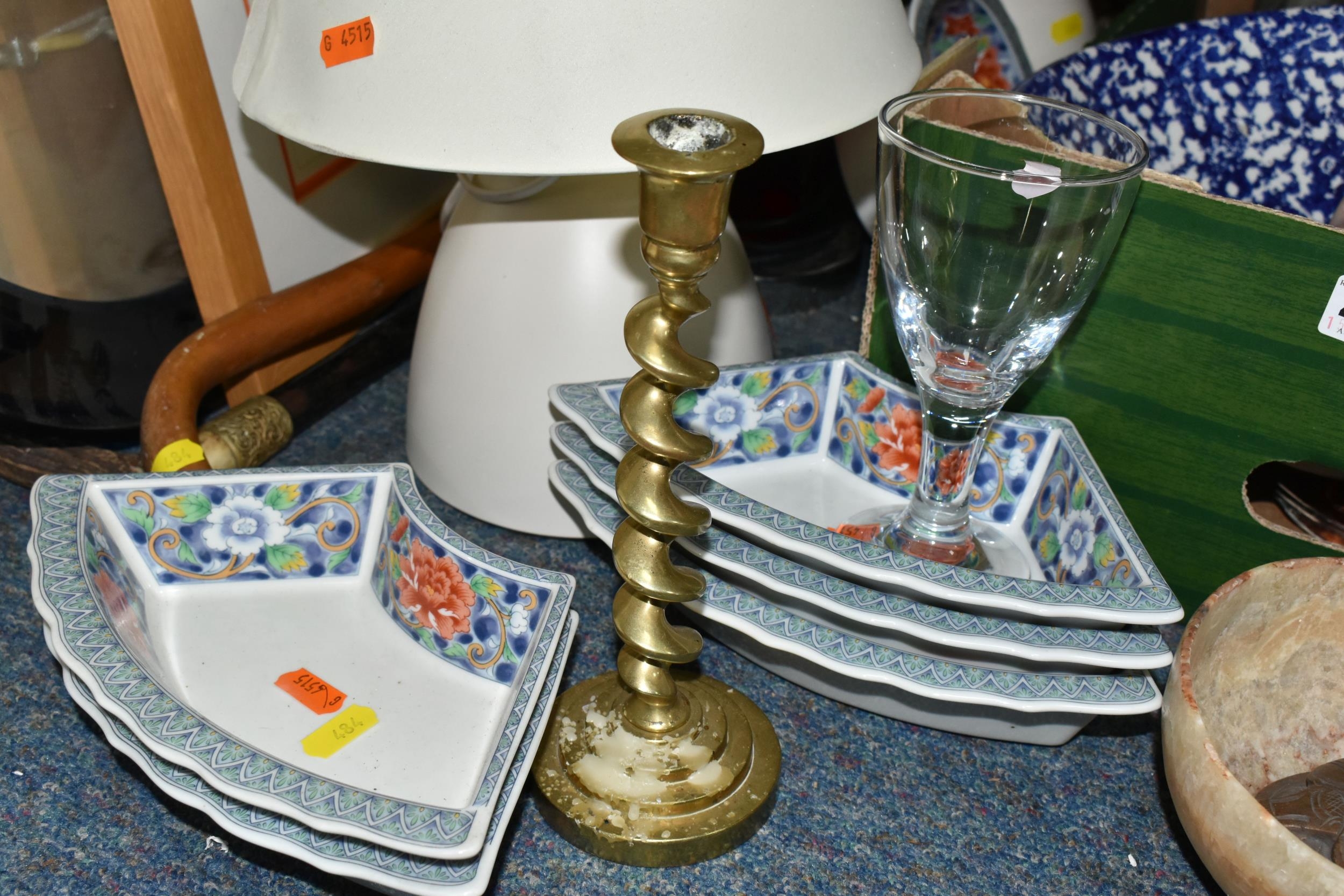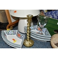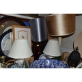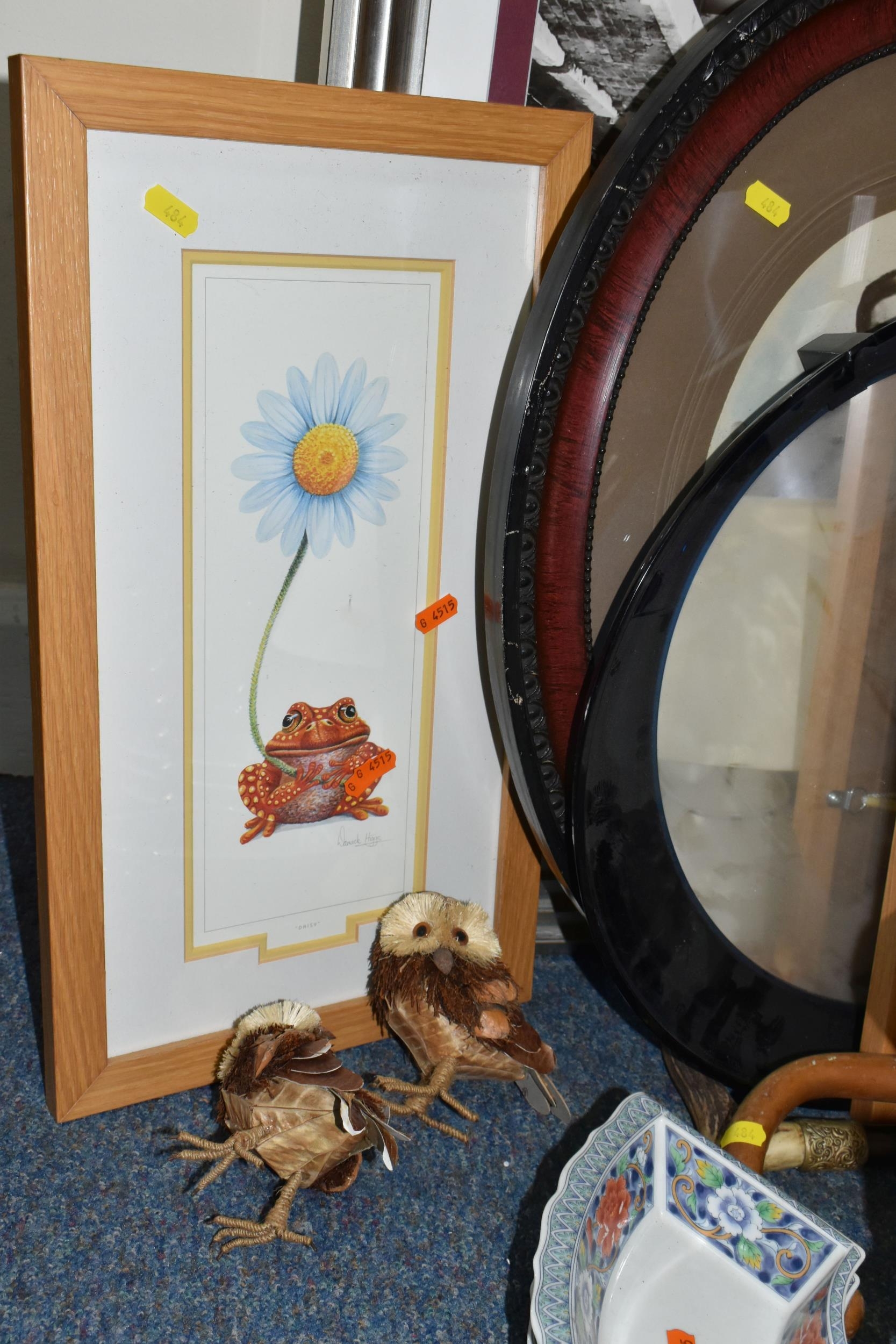 A BOX AND LOOSE CERAMICS, PICTURES, LAMPS AND SUNDRY ITEMS, to include Honiton pottery animal money boxes, a pair of brass candlesticks with twisted stems, a pair of small oriental vases, four table lamps, framed prints, etc (1 box + loose) (sd, lamps untested)