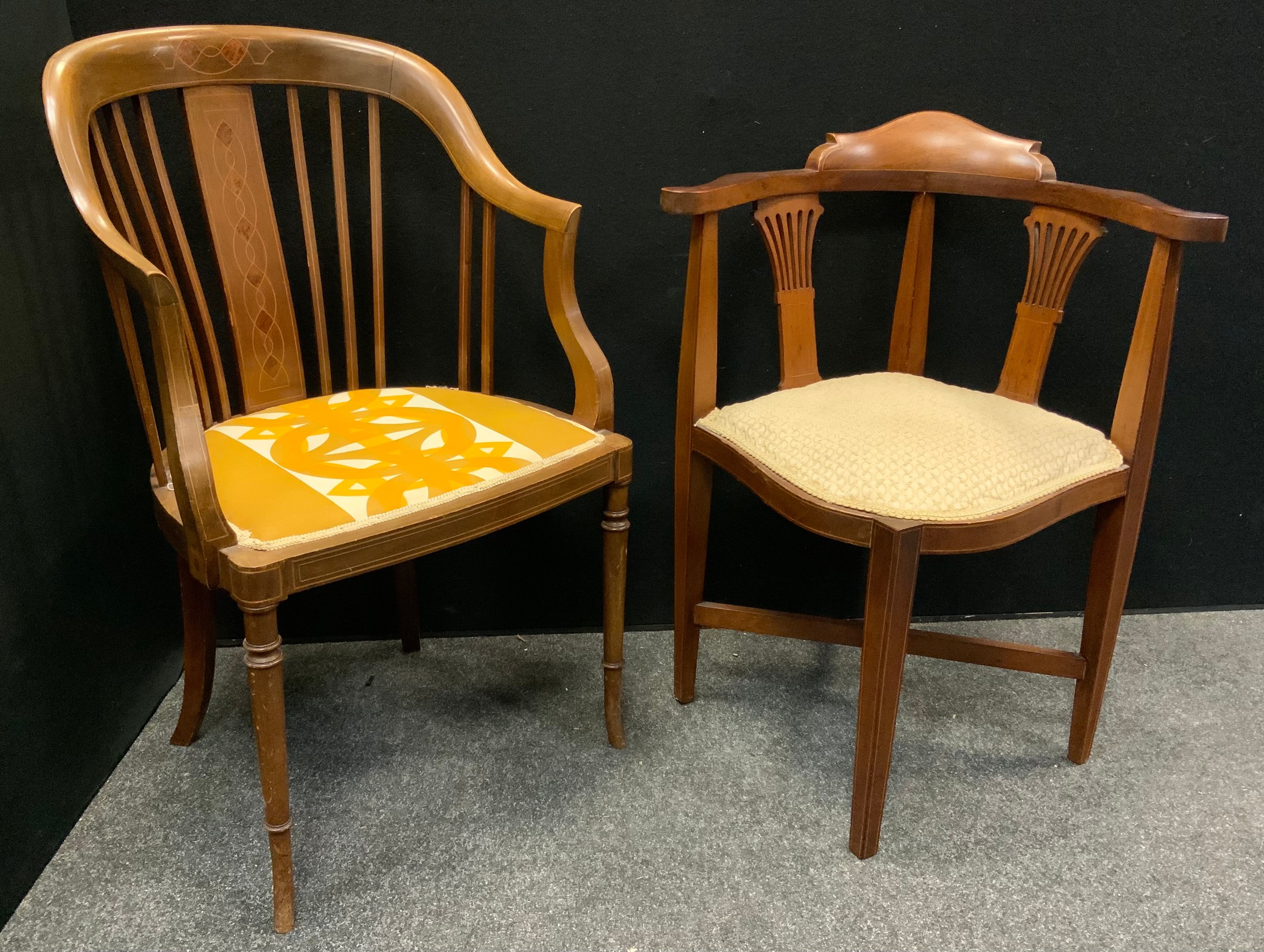 An Edwardian walnut open armchair, spindle back, burr walnut and boxwood inlay, turned legs; an Edwardian mahogany corner bedroom chair, pierced splats, tapering square legs, boxwood stringing throughout, c.1905, (2)