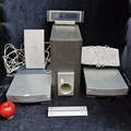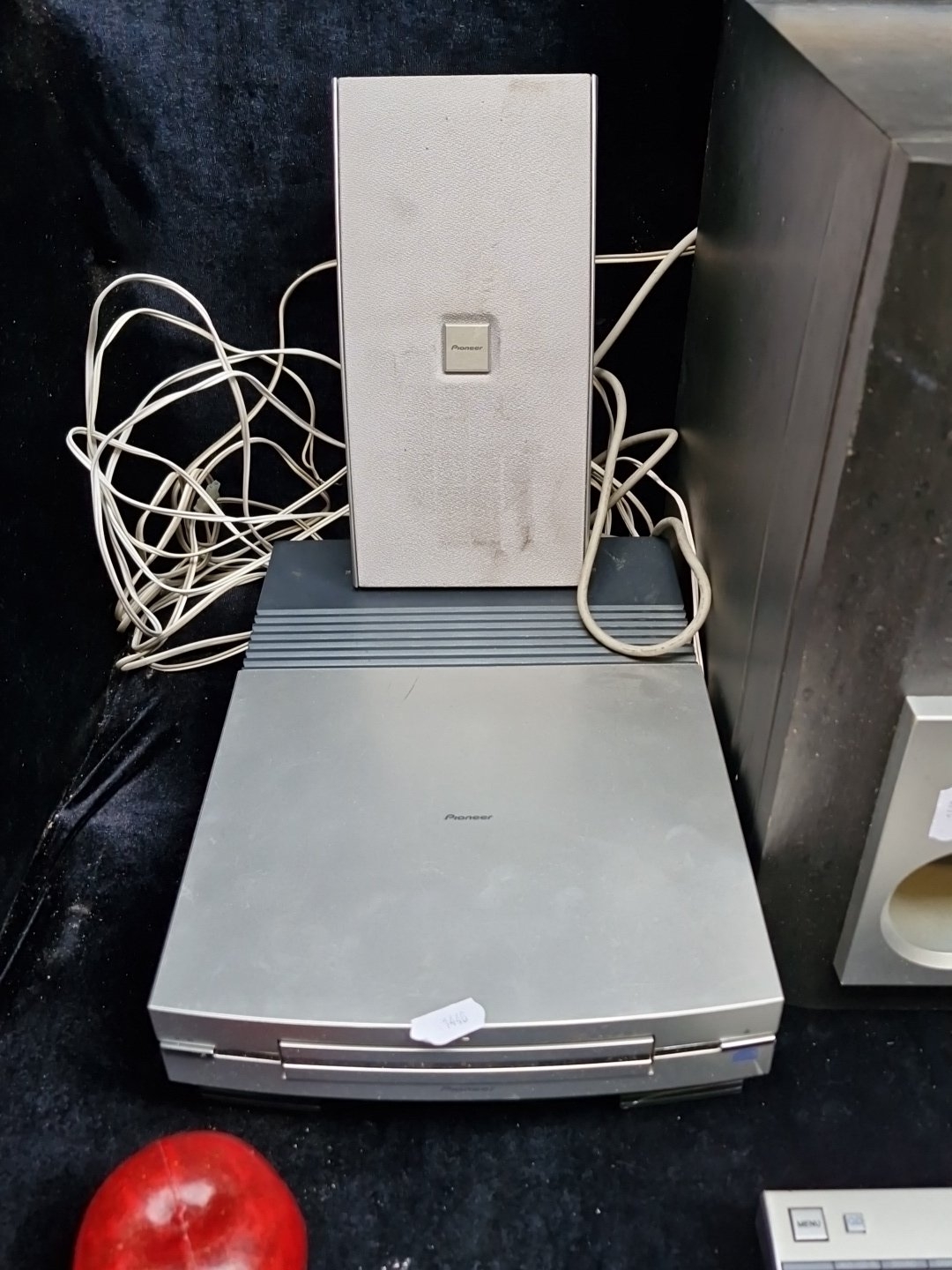 A good surround sound Pioneer silver-finished system, comprising a subwoofer, separate media players, two satellite speakers, a remote control and associated cabling. Very good brand.