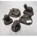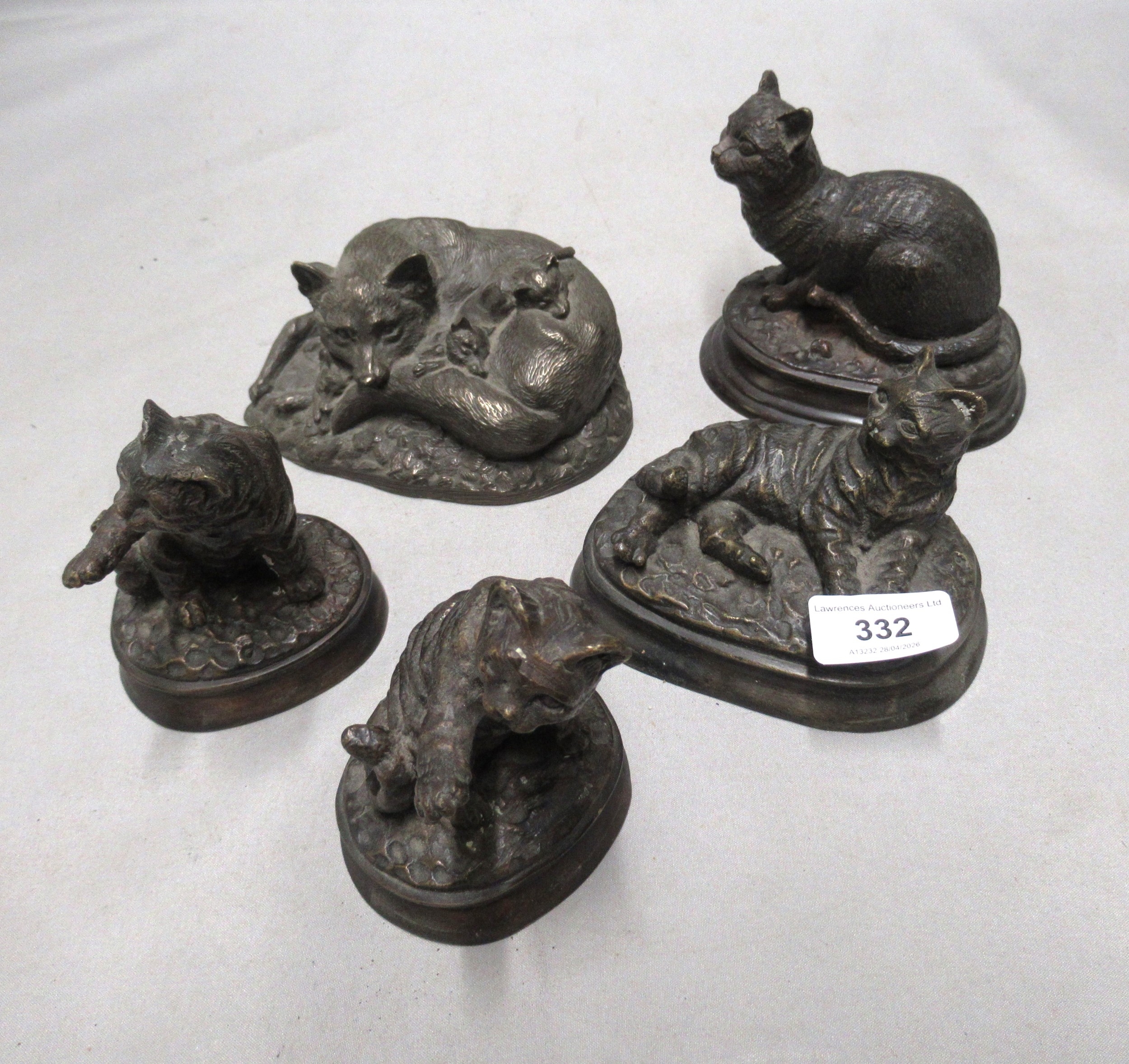 Four various brown patinated metal figures of cats, together with a composite figure of a cat