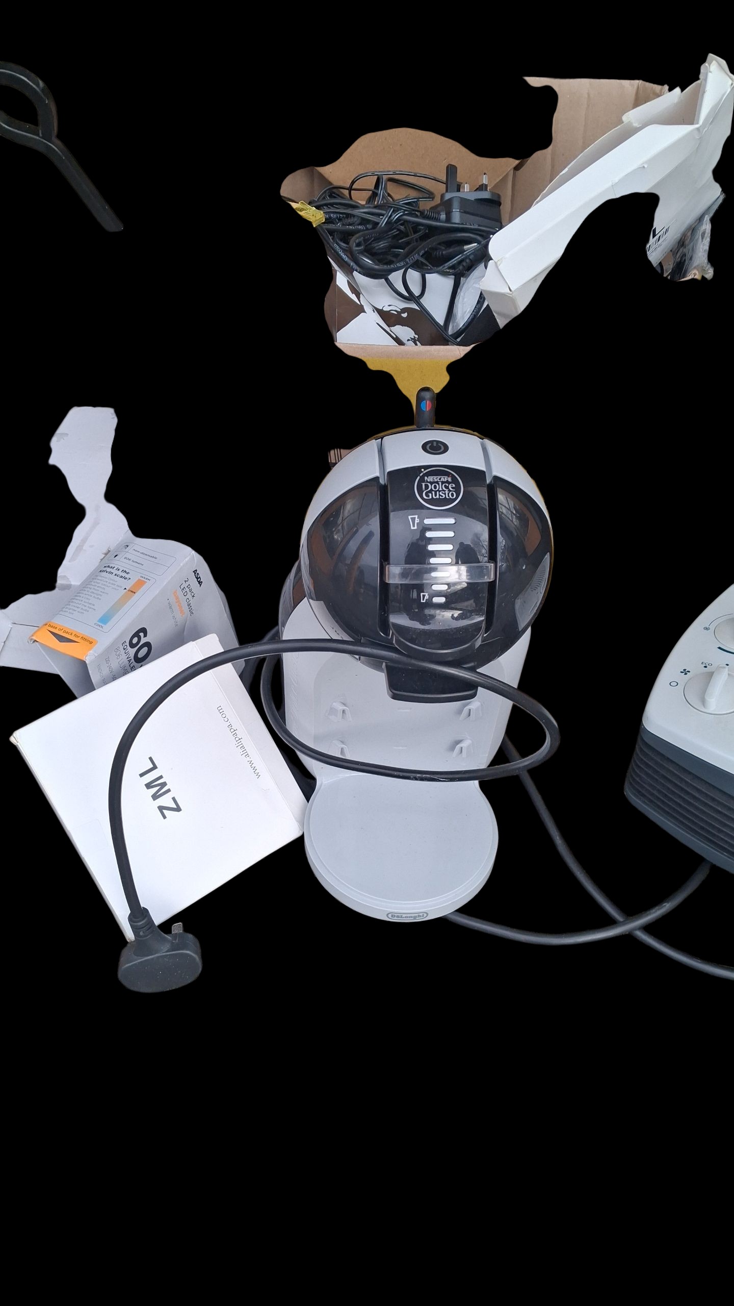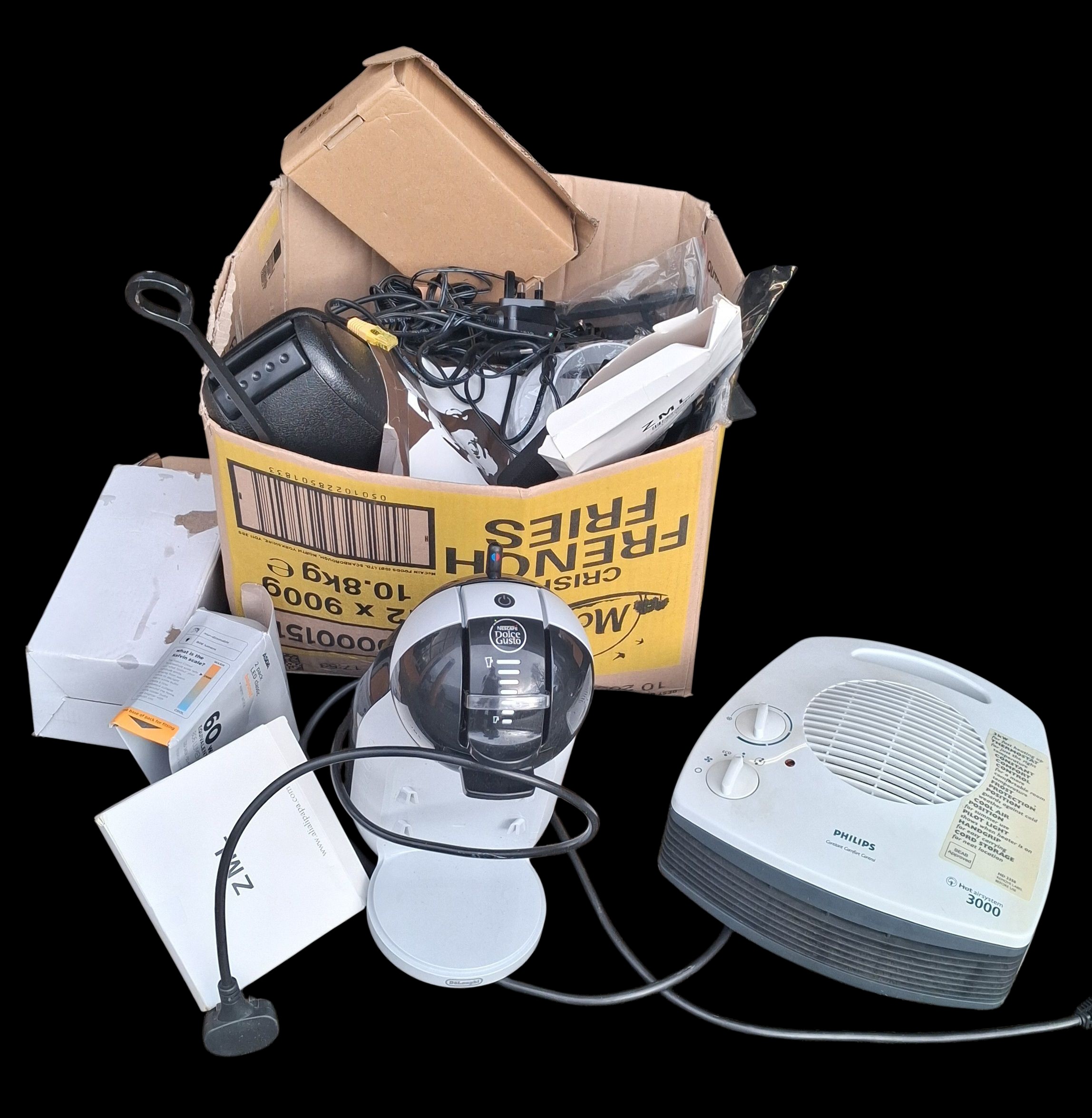 A MIXED BOX OF ELECTRICAL GOODS TO INCLUDE AS NEW COFFEE MACHINE