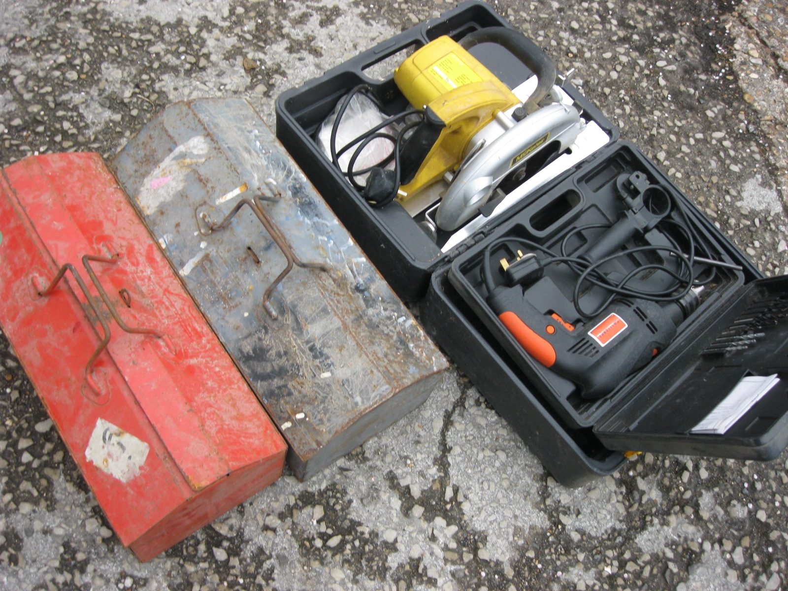 A pair of steel toolboxes, a cased power screwdriver and a cased circular saw