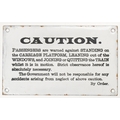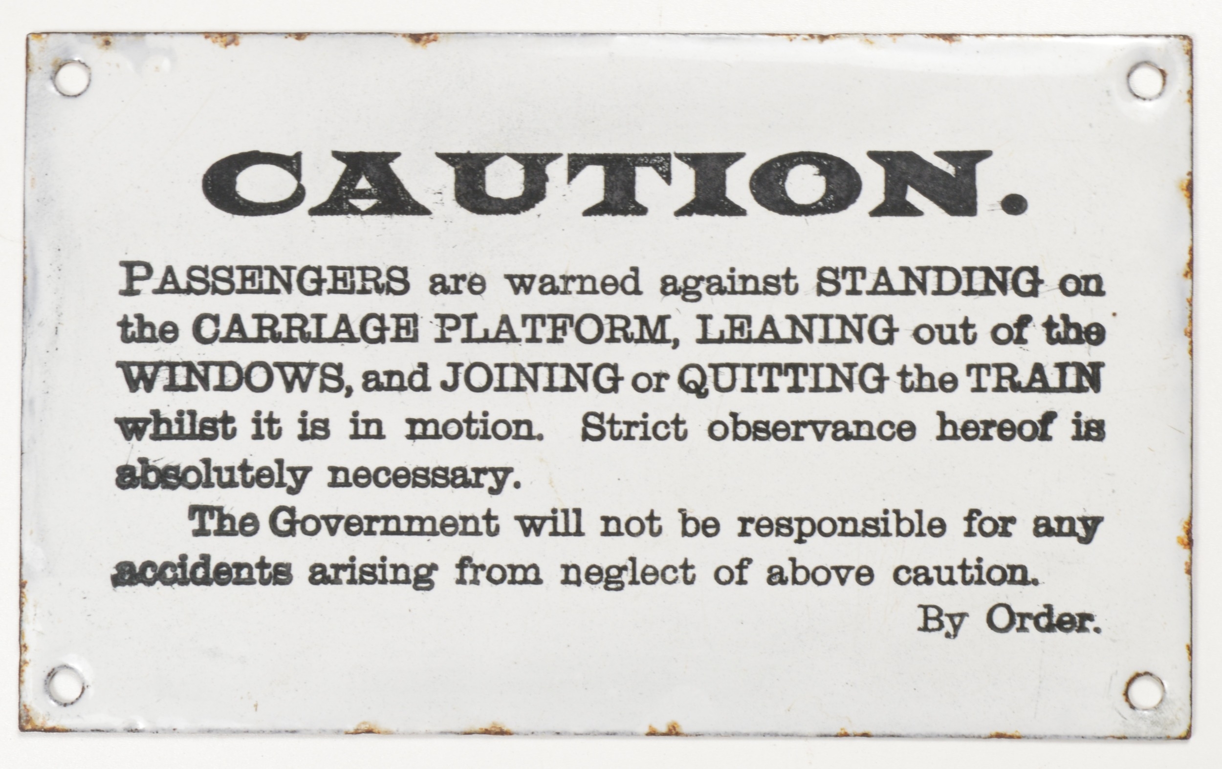 Enamel sign, CAUTION PASSENGERS etc. Unknown railway company, but believed to be of colonial era. Very good condition 8 1/8 x 5 7/8 inches. Shipping band - A.