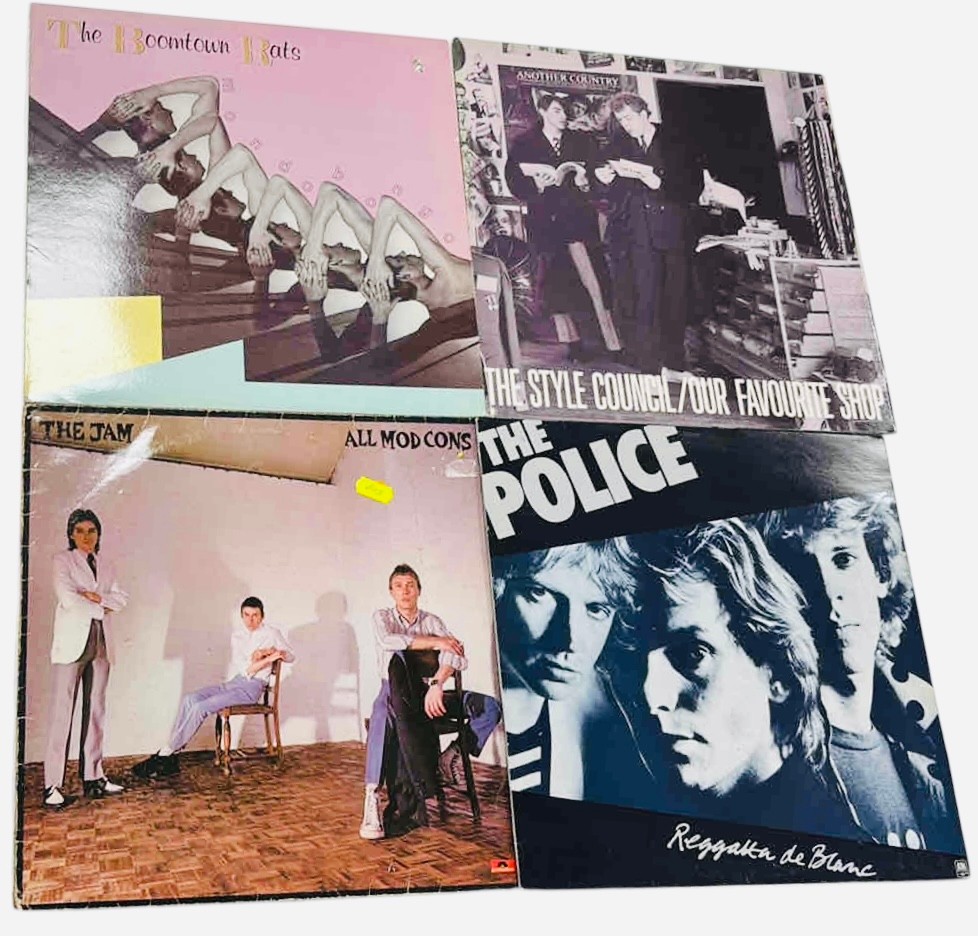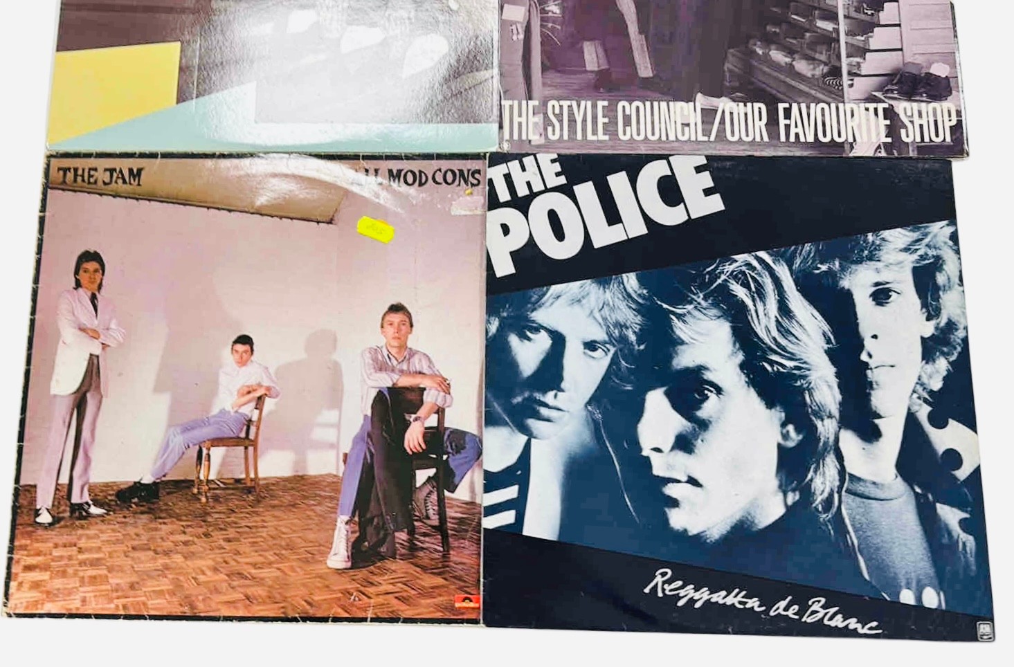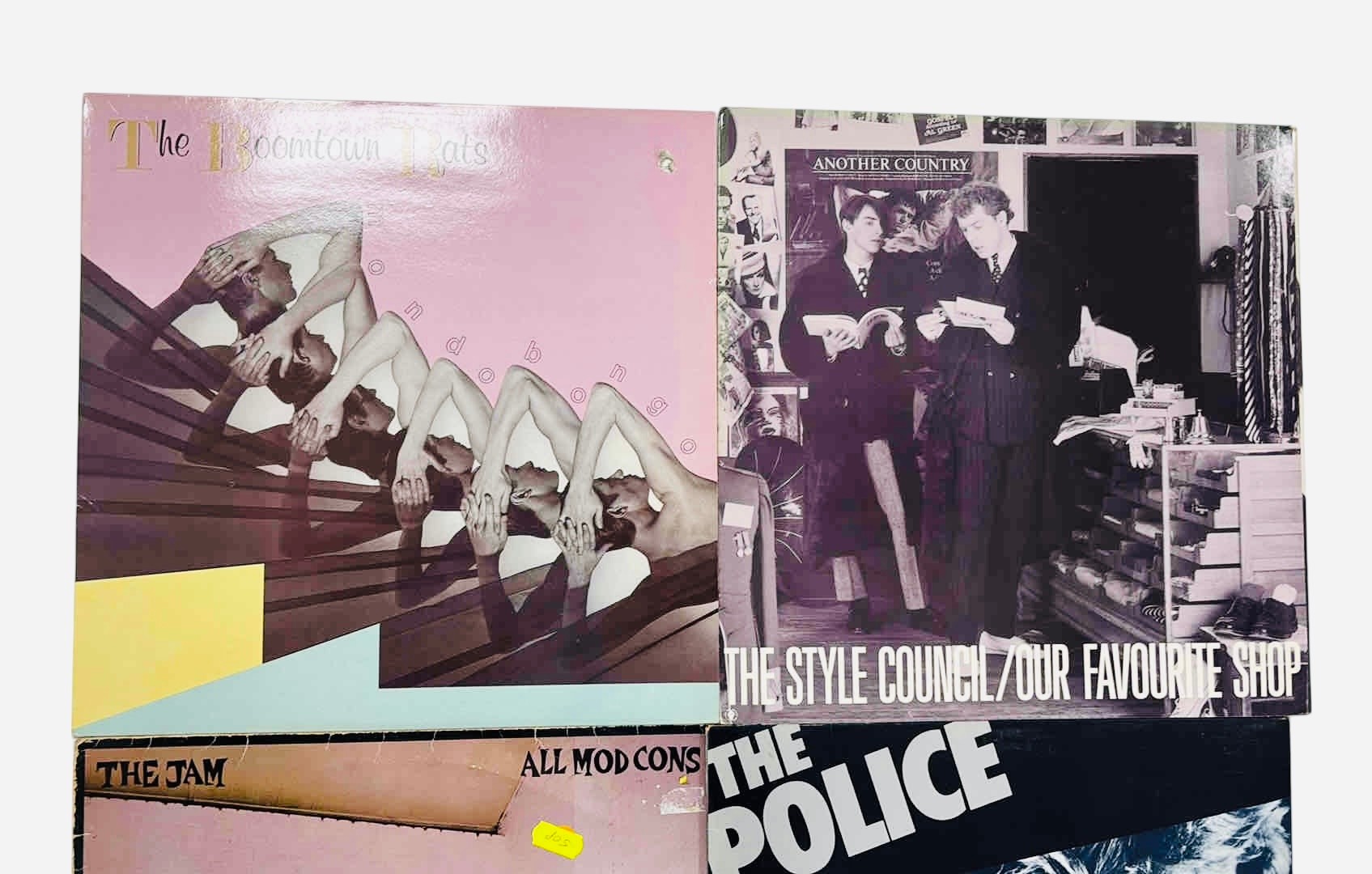 A group of vinyl record albums, including The Jam "All Mod Cons", The Boomtown Rats "Mondo Bongo", The Police "Reggatta de Blanc", and The Style Council "Our Favourite Shop".