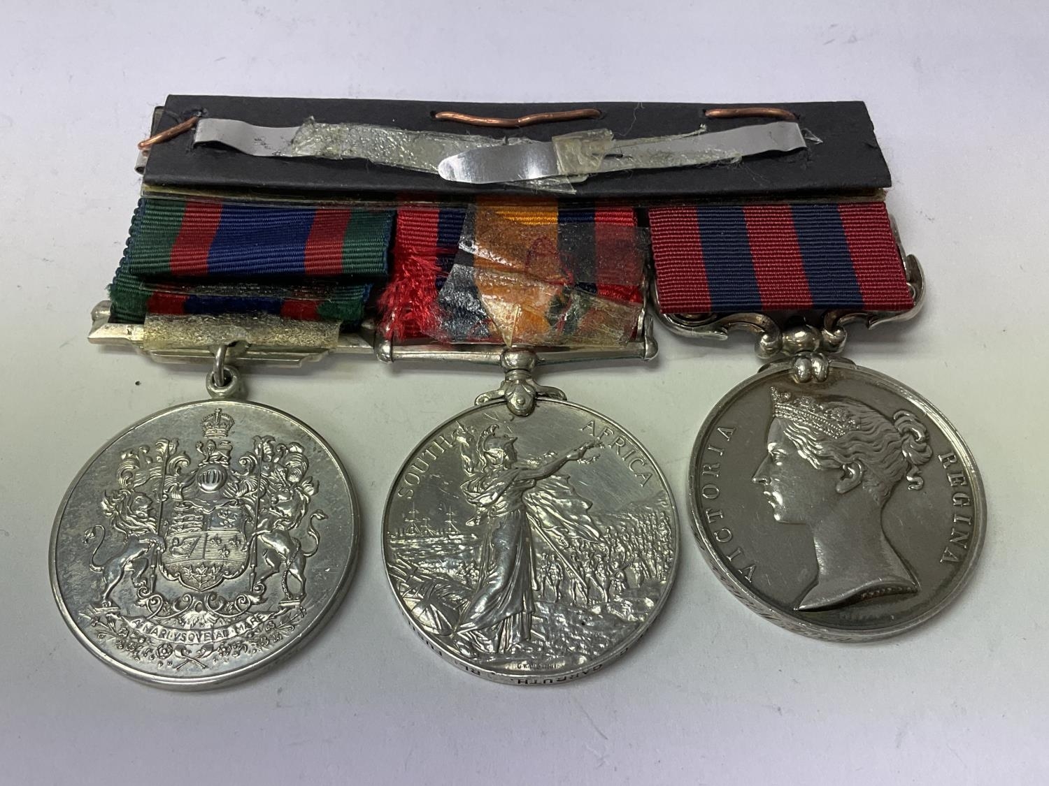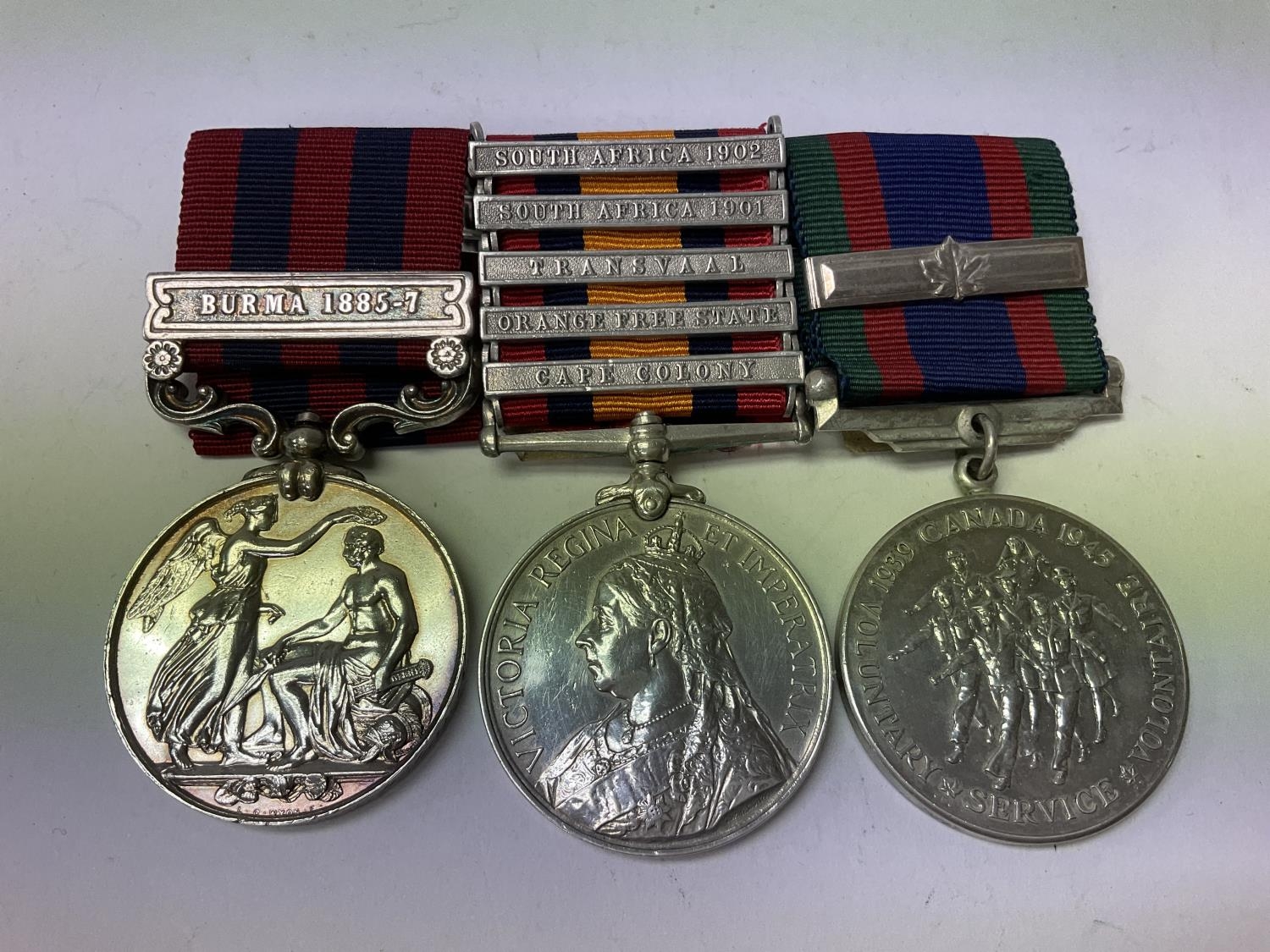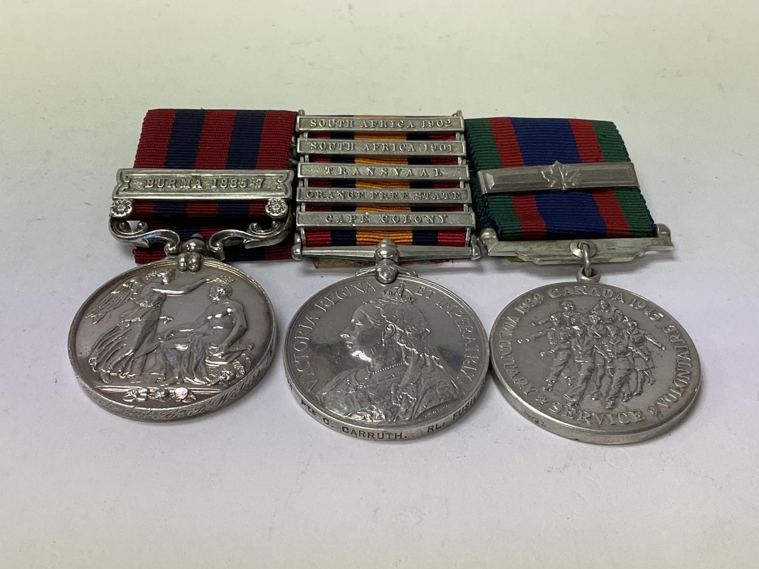 Medal group ( Not matching). India general service medal 1854-1895 with Burma 1885-7 bar awarded to Private Beck 2nd Btn R Surr R., Canada voluntary service 1939-45 medal, Queens South Africa medal with 5 bar awarded to 7398 Pte C Carruth RL Fusilers.