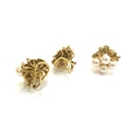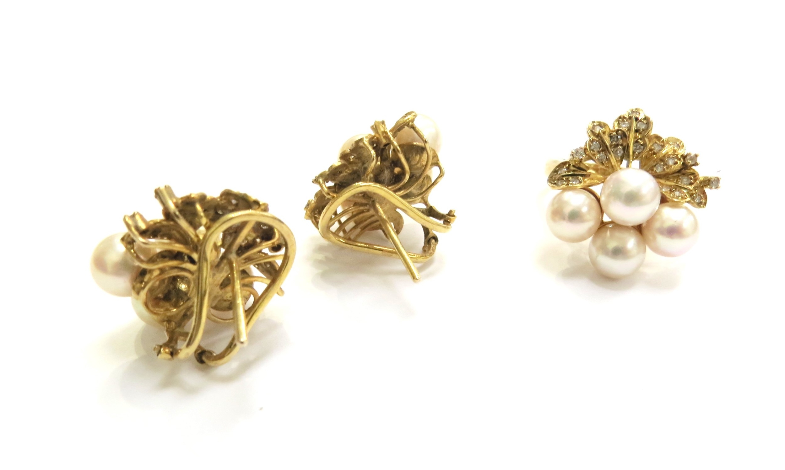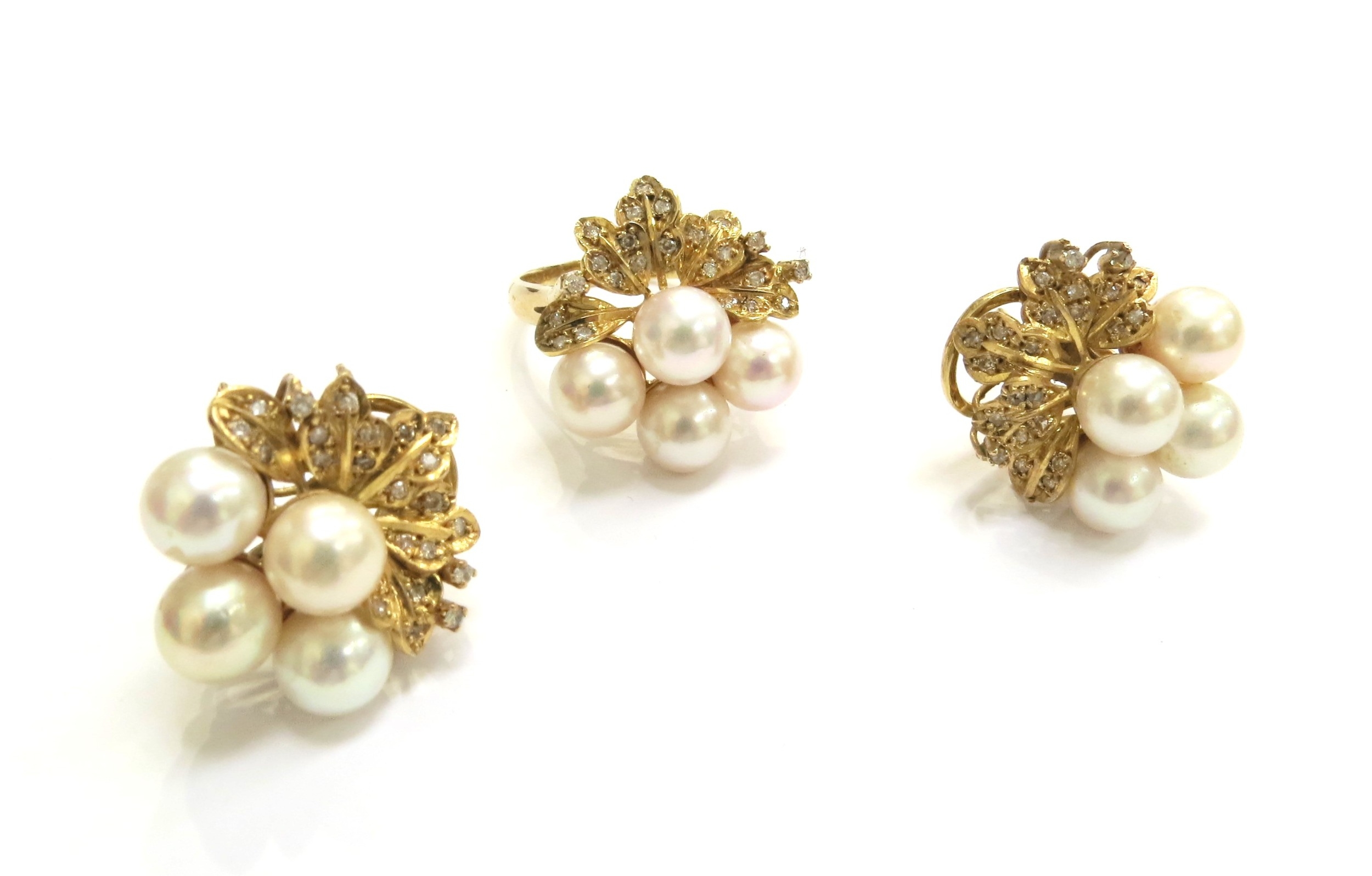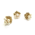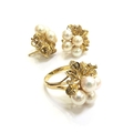 A pearl and diamond cluster ring, stamped 14k. Size M/N and a pair of matching earrings, 16.3g total