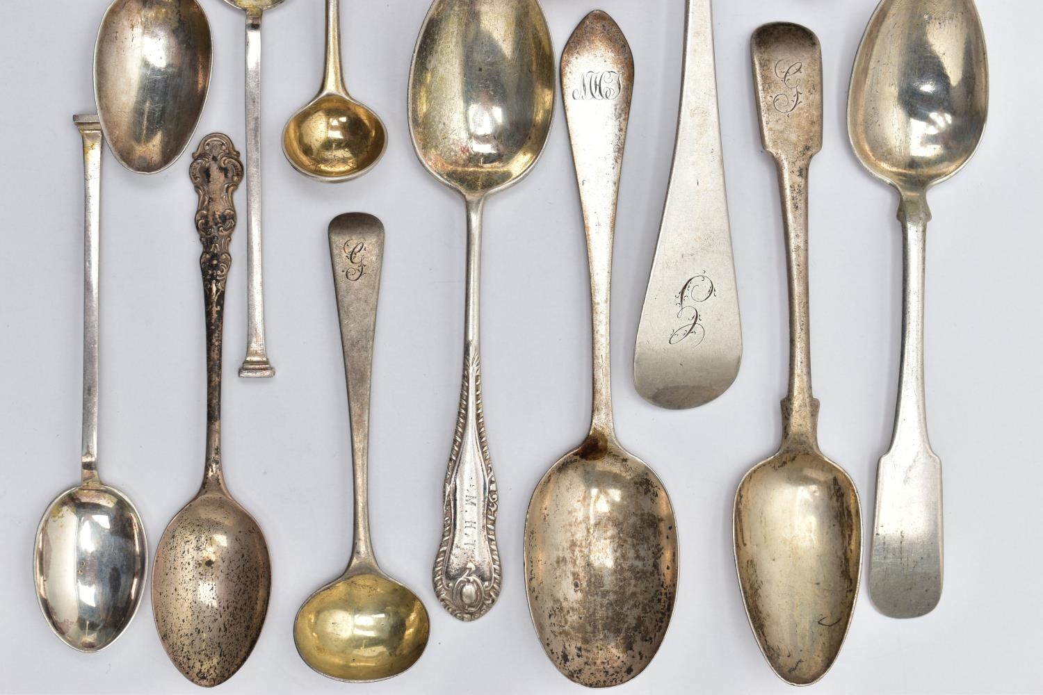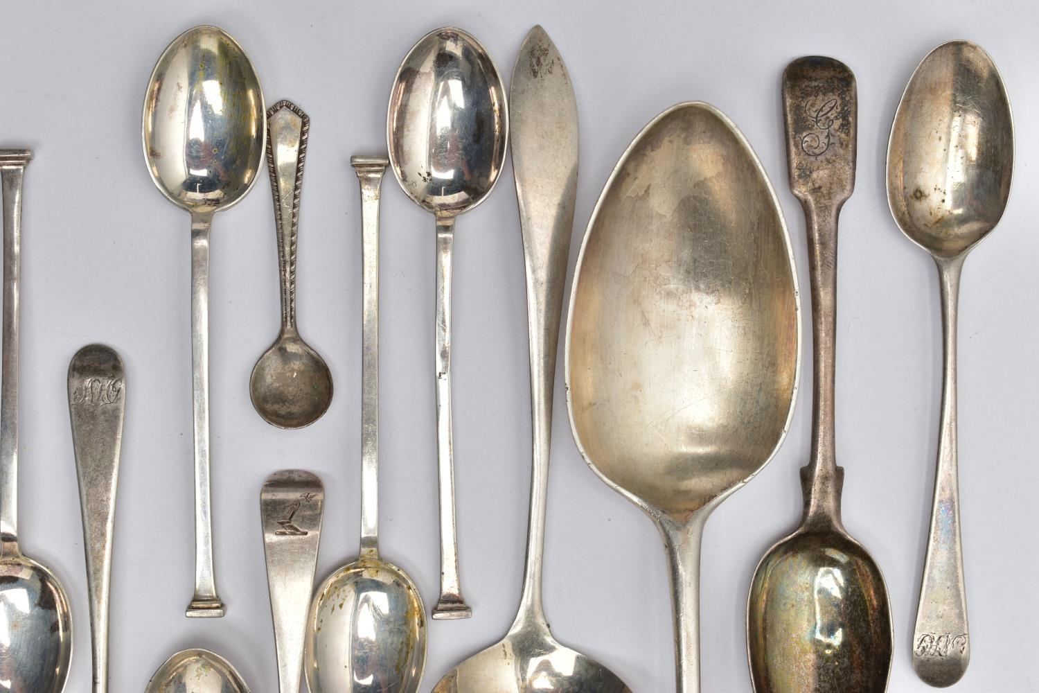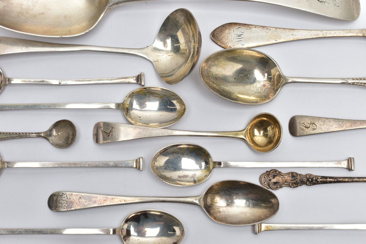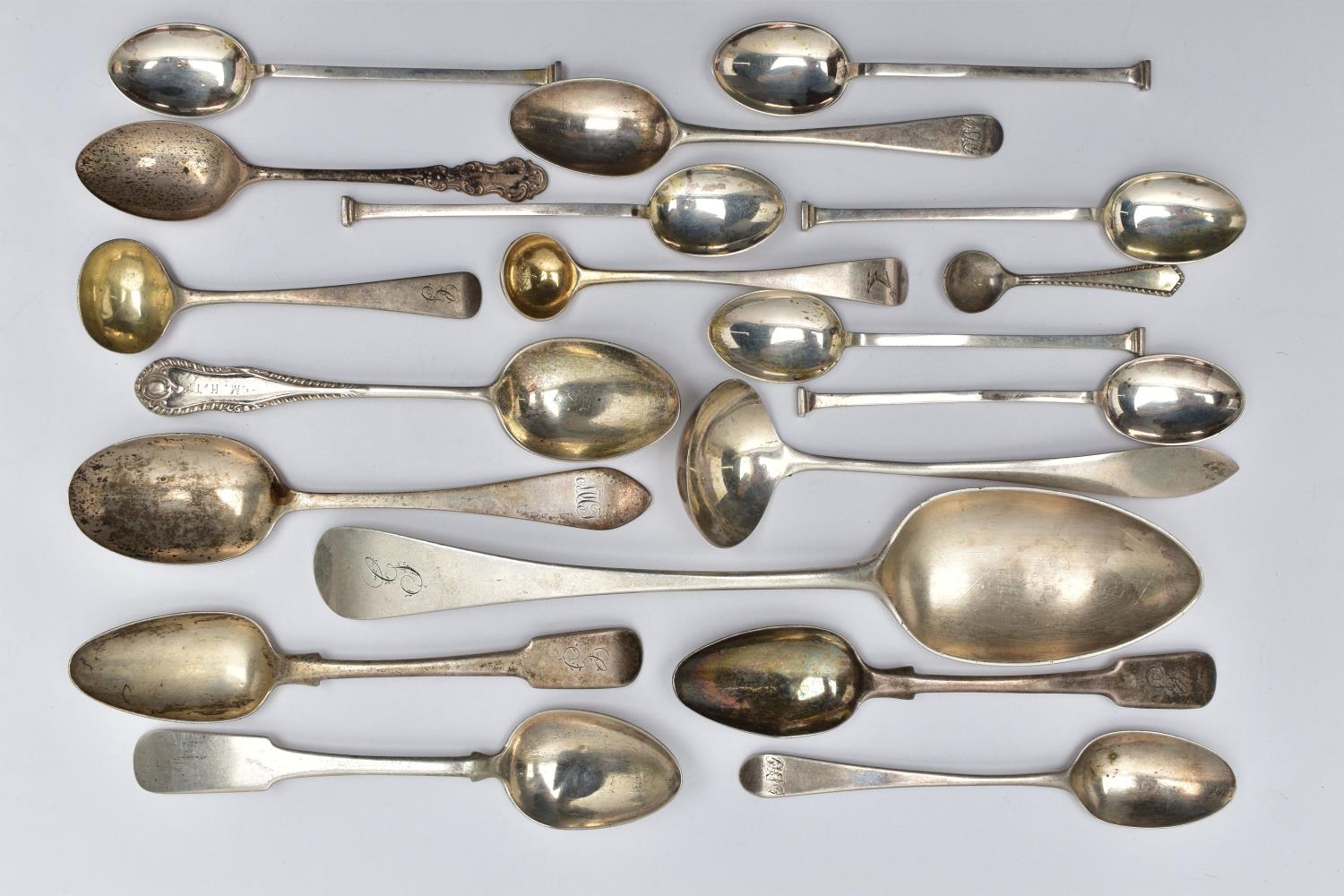 A PARCEL OF ASSORTED LATE 18TH, 19TH AND 20TH CENTURY SILVER SPOONS, including a George III Old English pattern tablespoon, engraved initial G, maker Charles Hougham, London 1792, a sauce ladle stamped Sterling, a pair of Fiddle pattern teaspoons, engraved initial G, no assay office mark but probably Joseph Hicks, Exeter 1812, a set of five seal top coffee spoons, makers Mappin & Webb Ltd, Sheffield 1920, etc, gross weight 9.09ozt, 282.8 grams, together with two silver plated teaspoons (Parcel) (Condition report: in mixed condition overall, with signs of use commensurate with age, some have wear to the hallmarks)