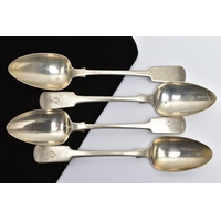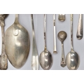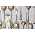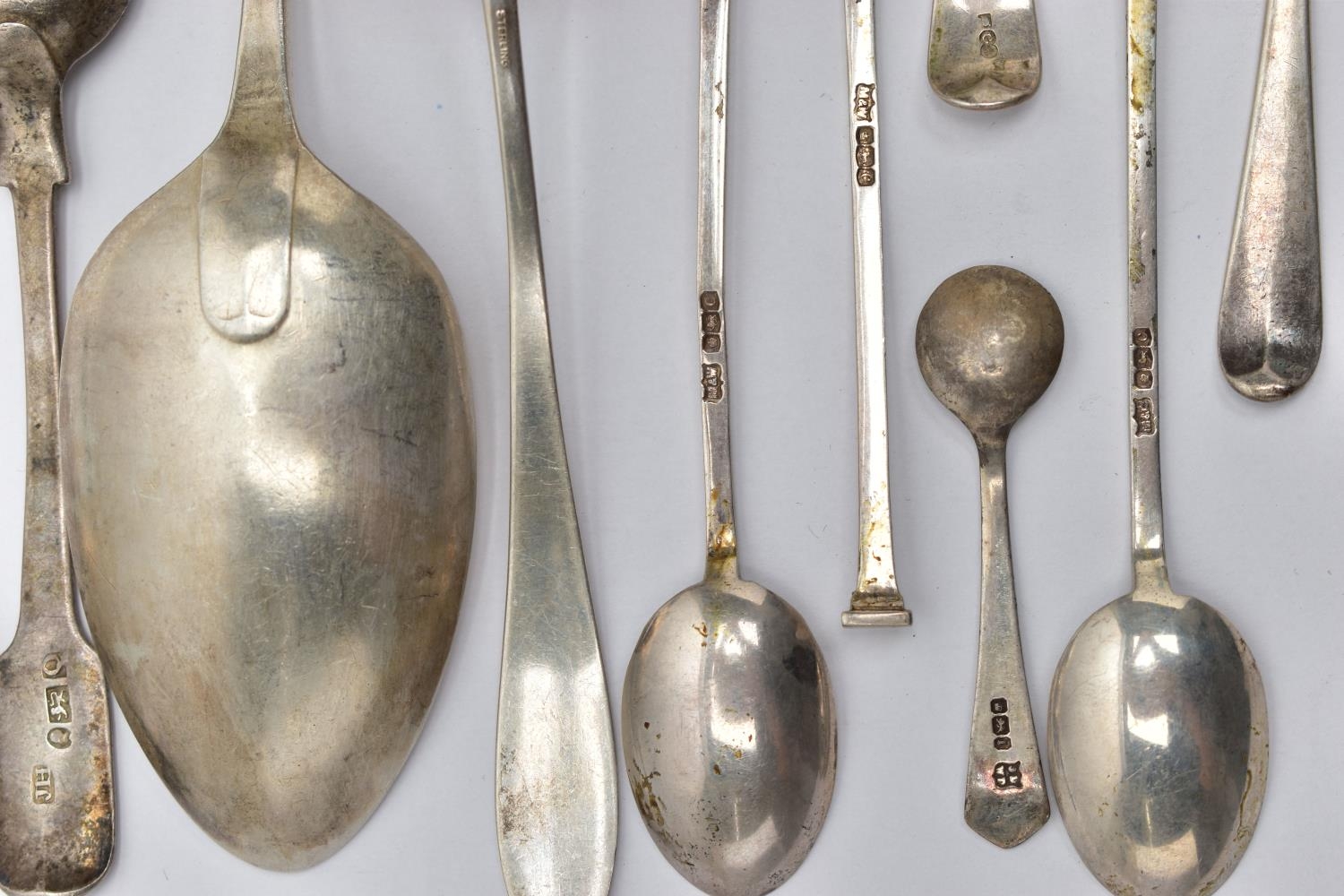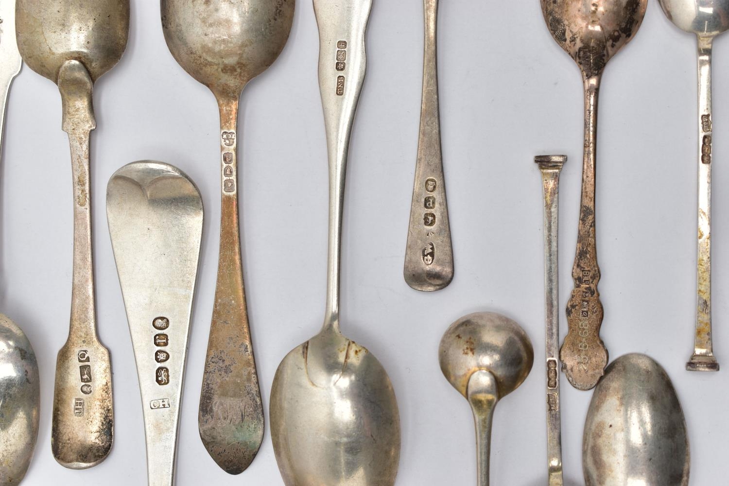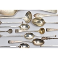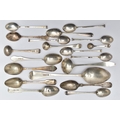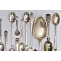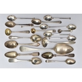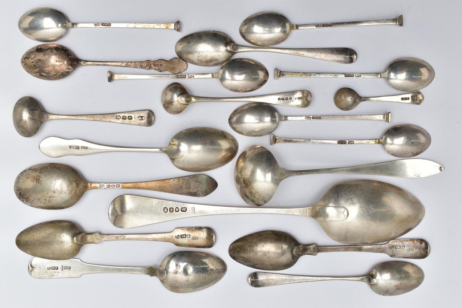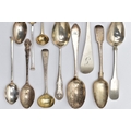 A PARCEL OF ASSORTED LATE 18TH, 19TH AND 20TH CENTURY SILVER SPOONS, including a George III Old English pattern tablespoon, engraved initial G, maker Charles Hougham, London 1792, a sauce ladle stamped Sterling, a pair of Fiddle pattern teaspoons, engraved initial G, no assay office mark but probably Joseph Hicks, Exeter 1812, a set of five seal top coffee spoons, makers Mappin & Webb Ltd, Sheffield 1920, etc, gross weight 9.09ozt, 282.8 grams, together with two silver plated teaspoons (Parcel) (Condition report: in mixed condition overall, with signs of use commensurate with age, some have wear to the hallmarks)