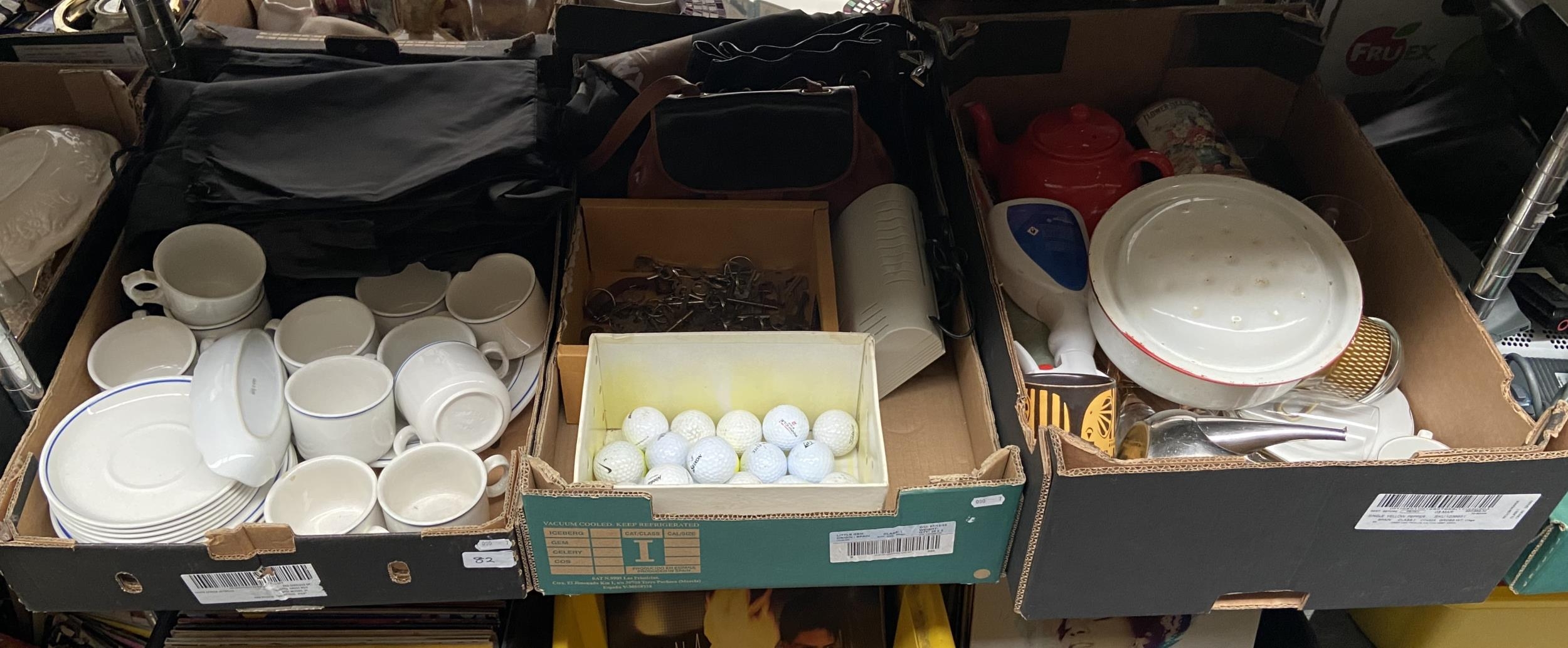 3 Boxes containing flatware, golf balls and keys etc
