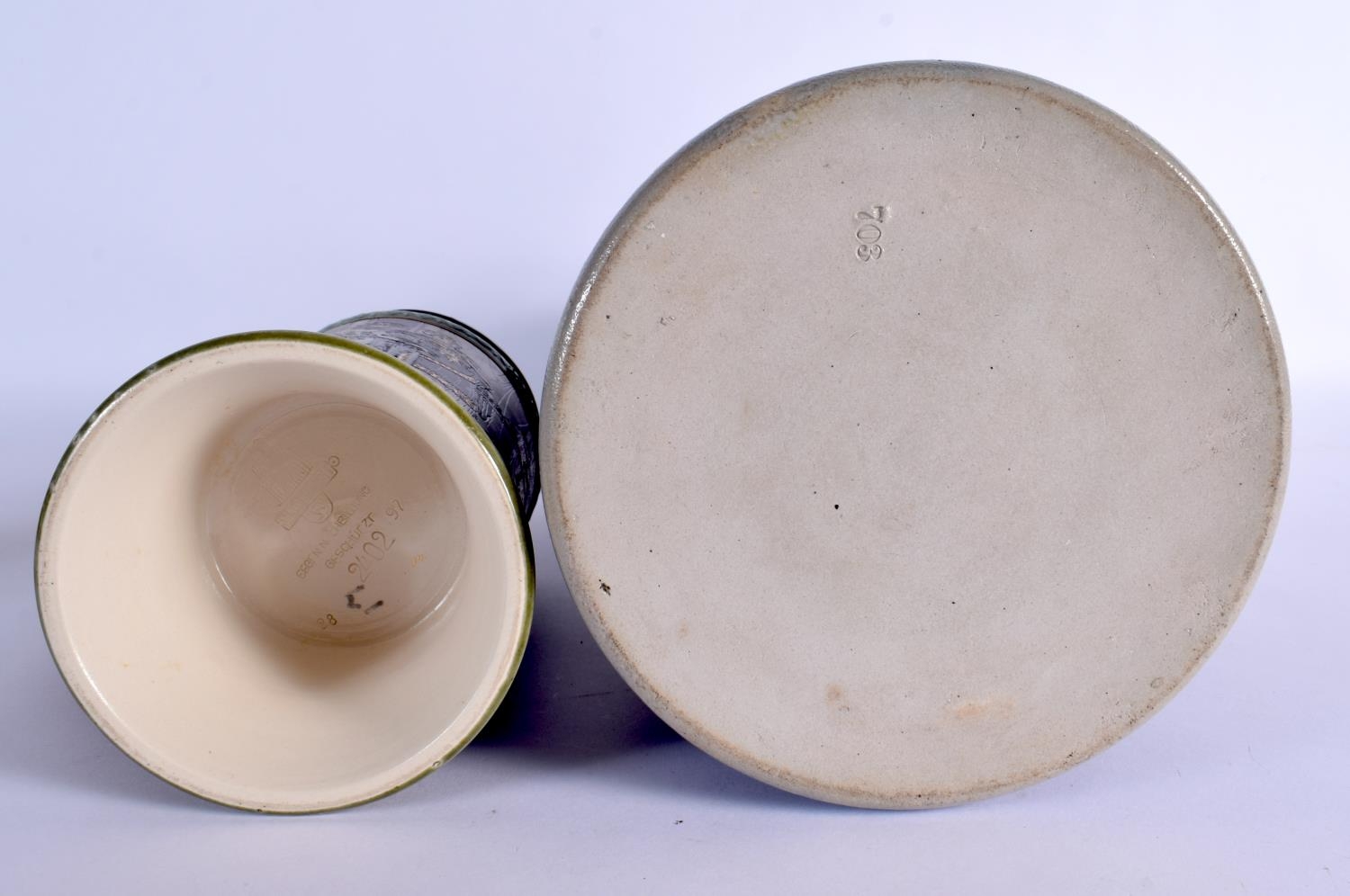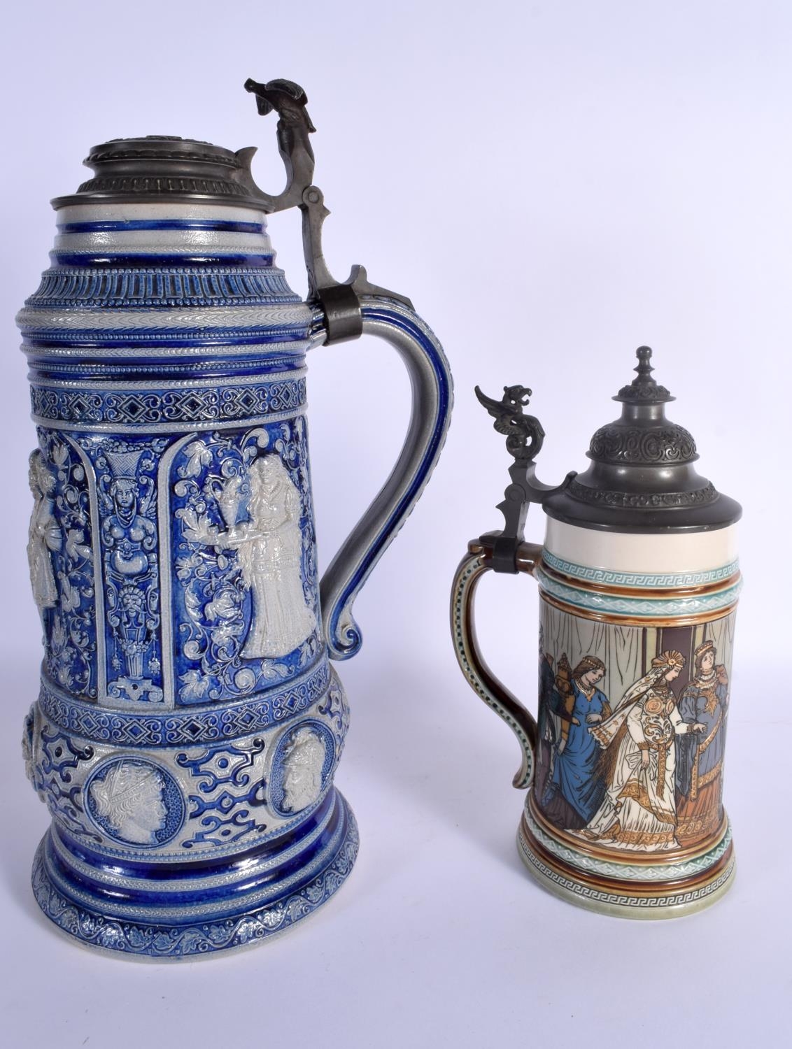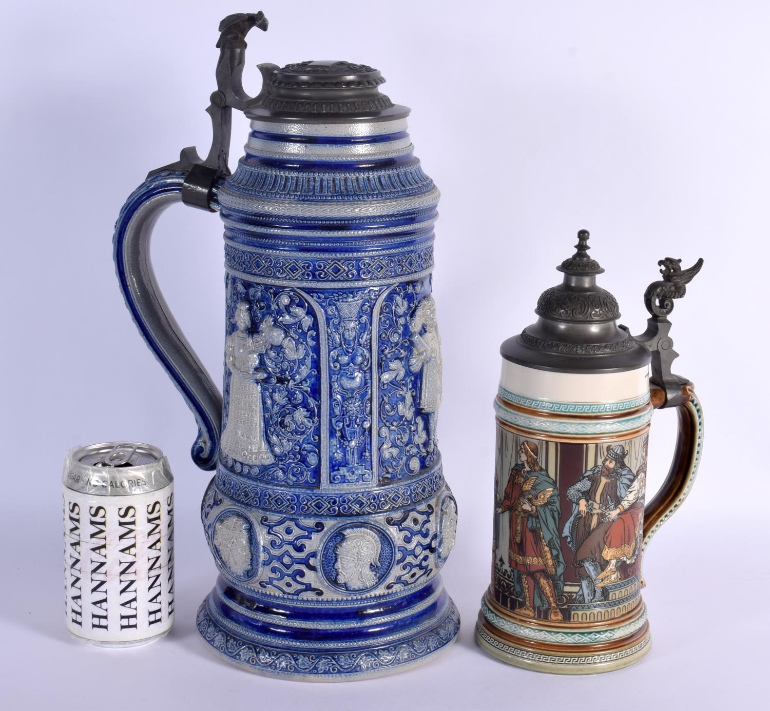 A LARGE GERMAN WESTERVALD TYPE STONEWARE FLAGON together with a smaller Mettlach stein. Largest 40 cm high. (2)