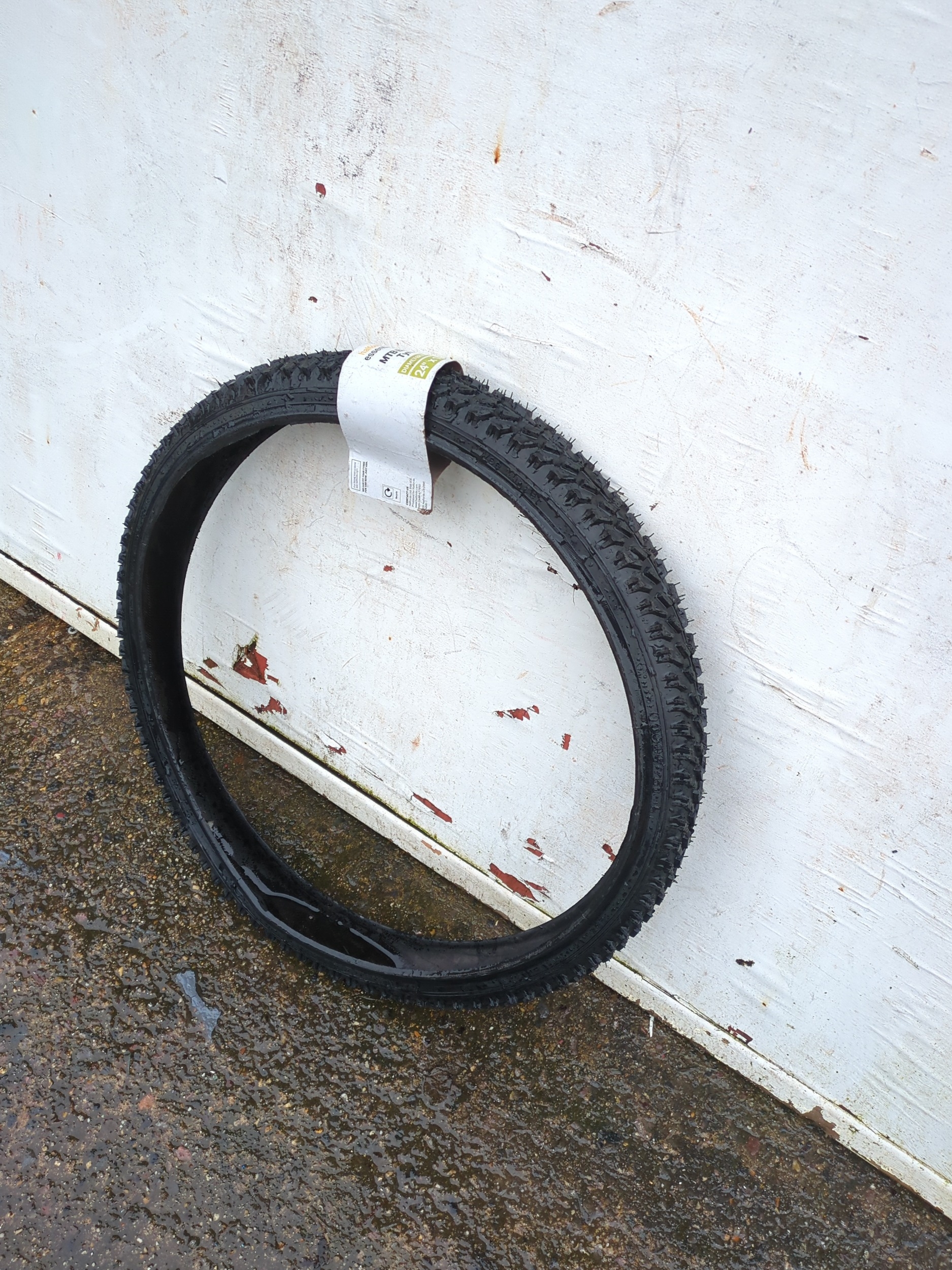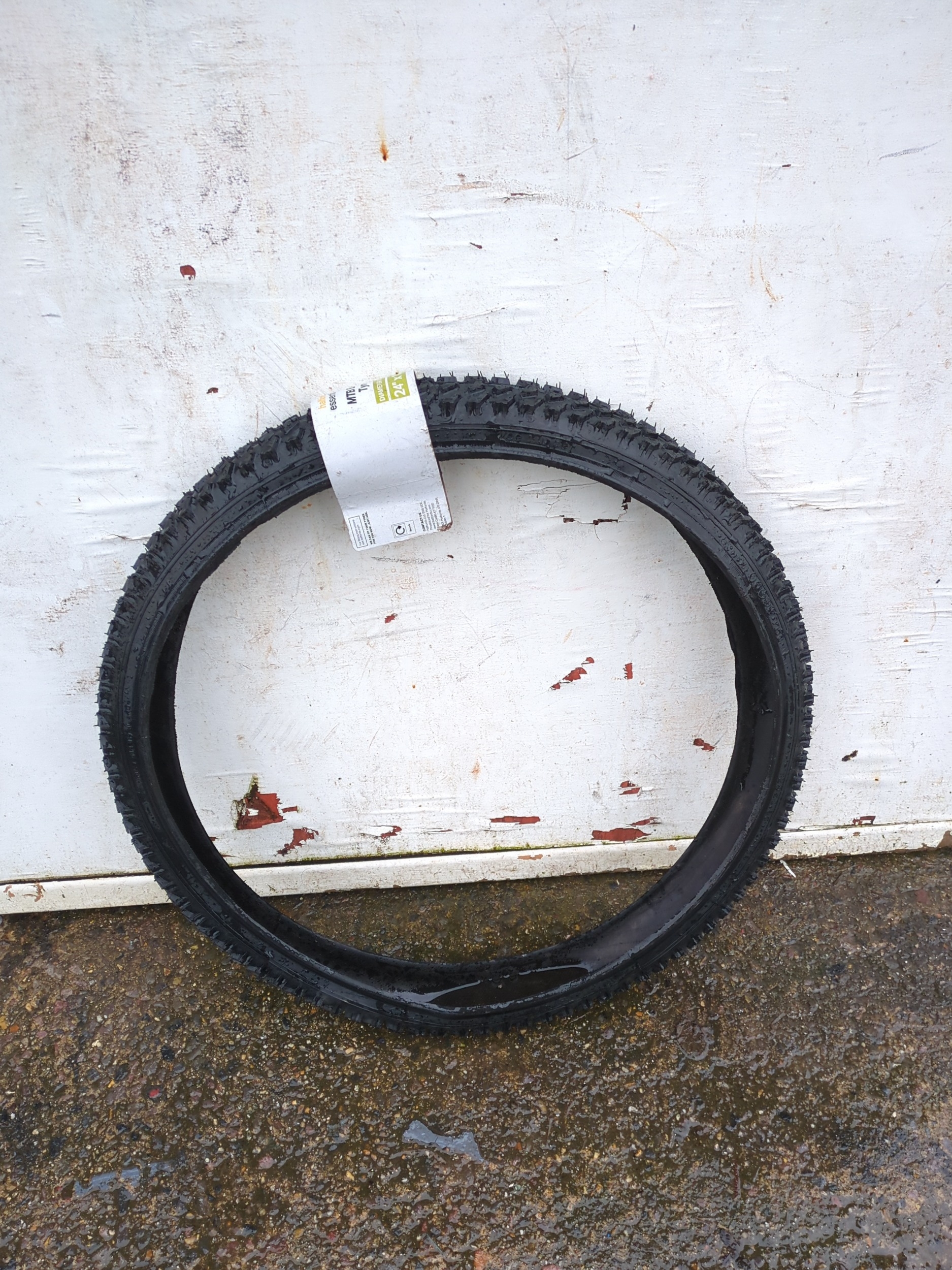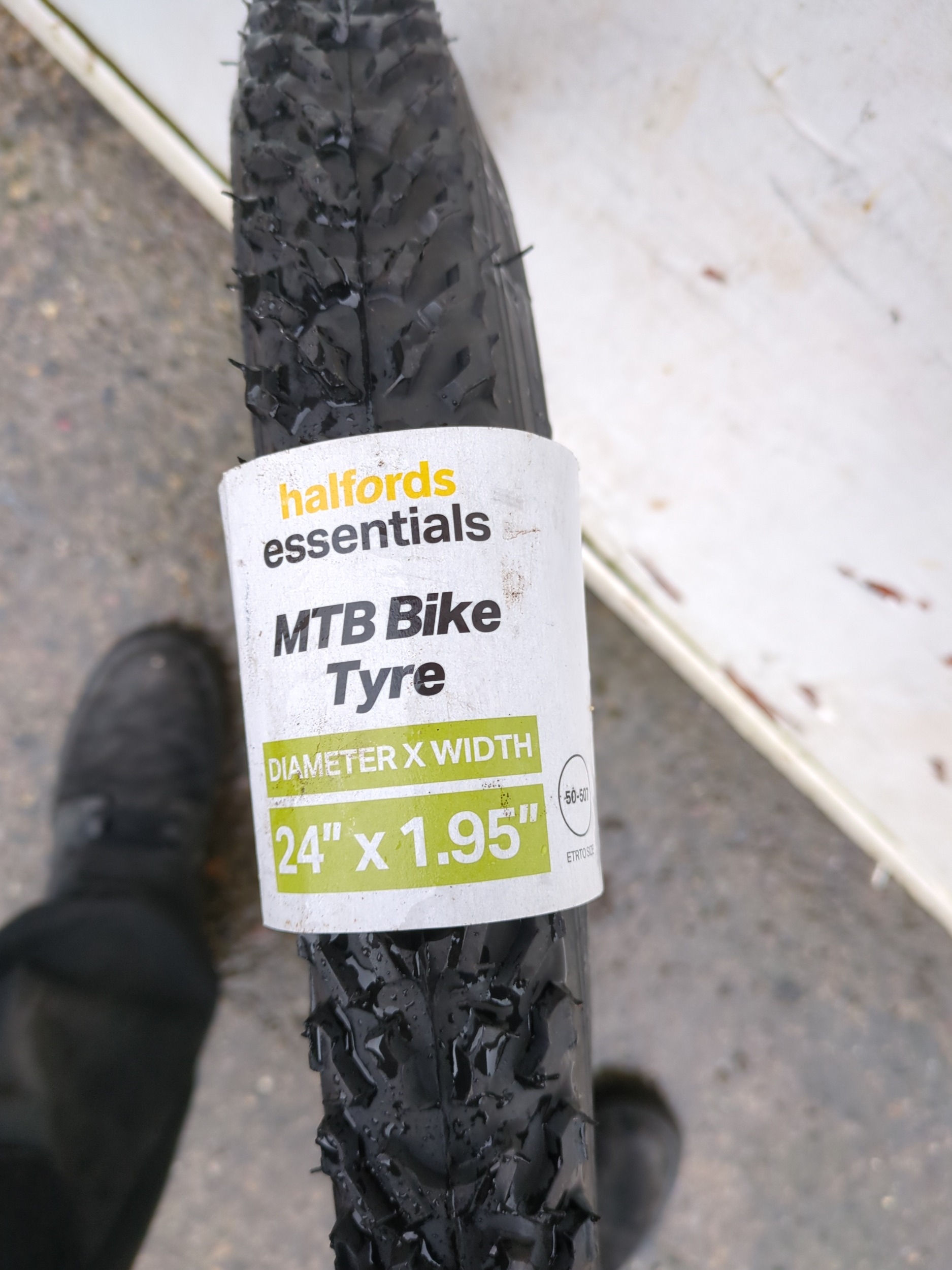 The Halfords Essentials mountain bike tyre has a tread design suitable for off-road cycling. It features a diameter of 24 inches and a width of 1.95 inches, making it ideal for mountain bikes. The tyre is presented with its original tag intact.
