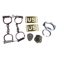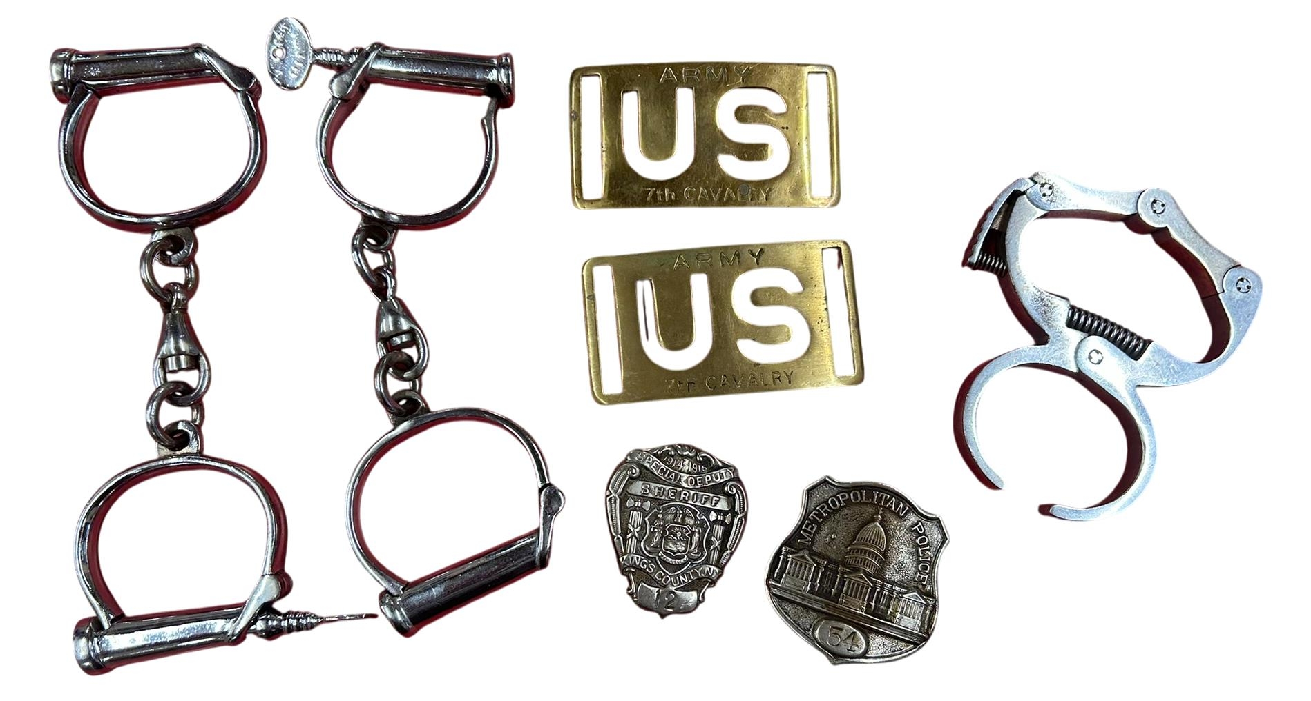 Vintage American Police Force lot - Heid and Roth 'Nipper' wrist clamp, two pairs of handcuffs, '1914-1915 Special Deputy Sheriff' badge, 'Metropolitan Police' badge, pair of US Army 7th Cavalry badges (7)