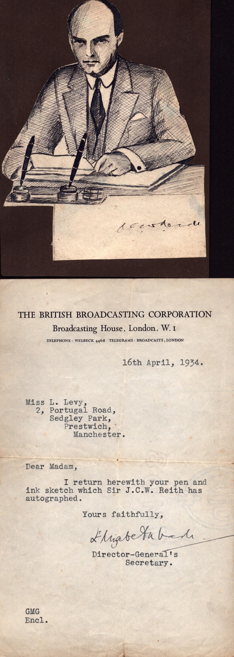 Sir J.C.W. Reith signed sketch with accompanying BBC TLS dated 16th April 1934.