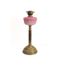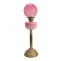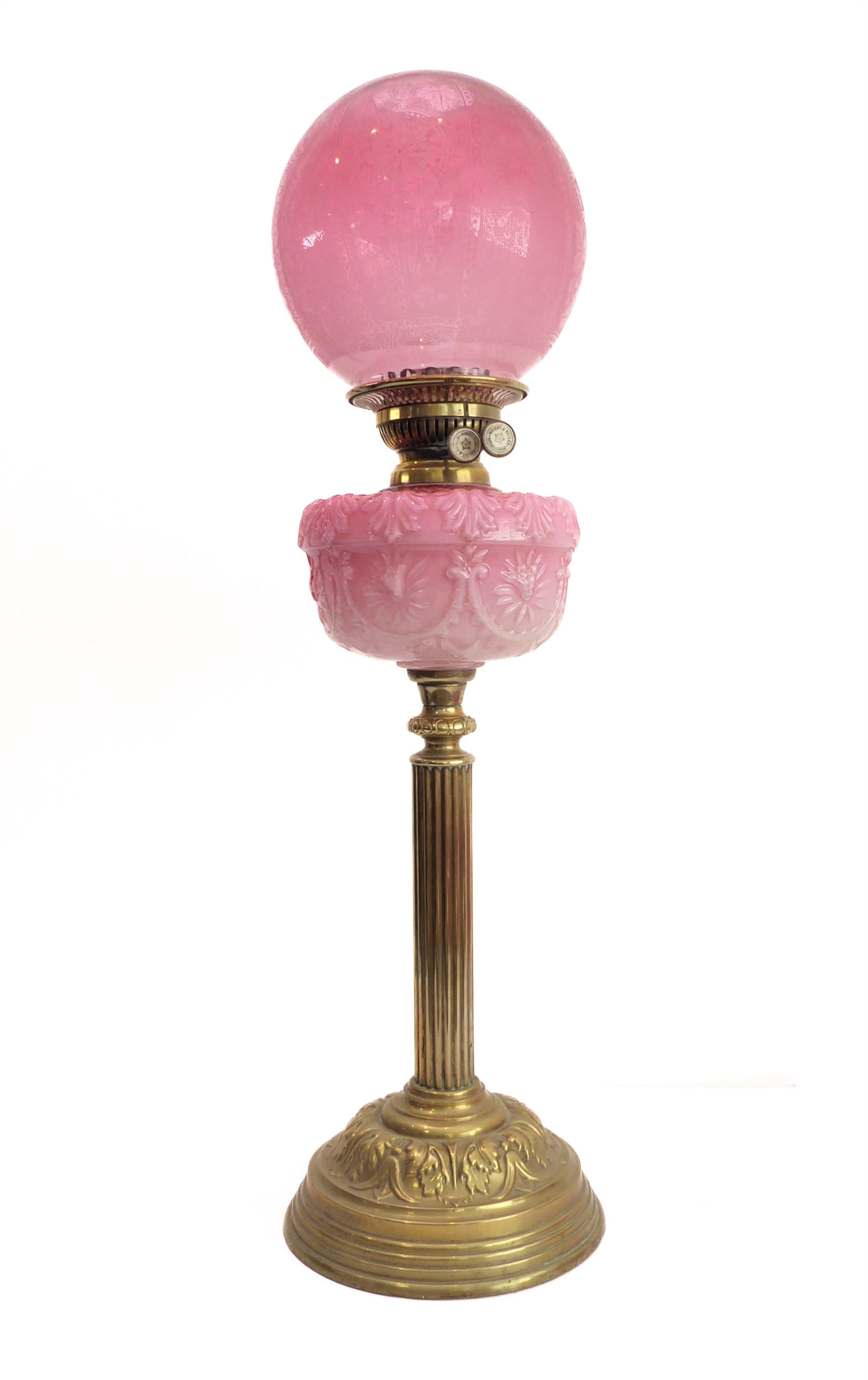A 19th century brass and opaline glass mounted oil lamp: the spherical etched shade above an opaline glass reservoir decorated in high relief with acanthus leaves (70 cm high)