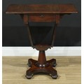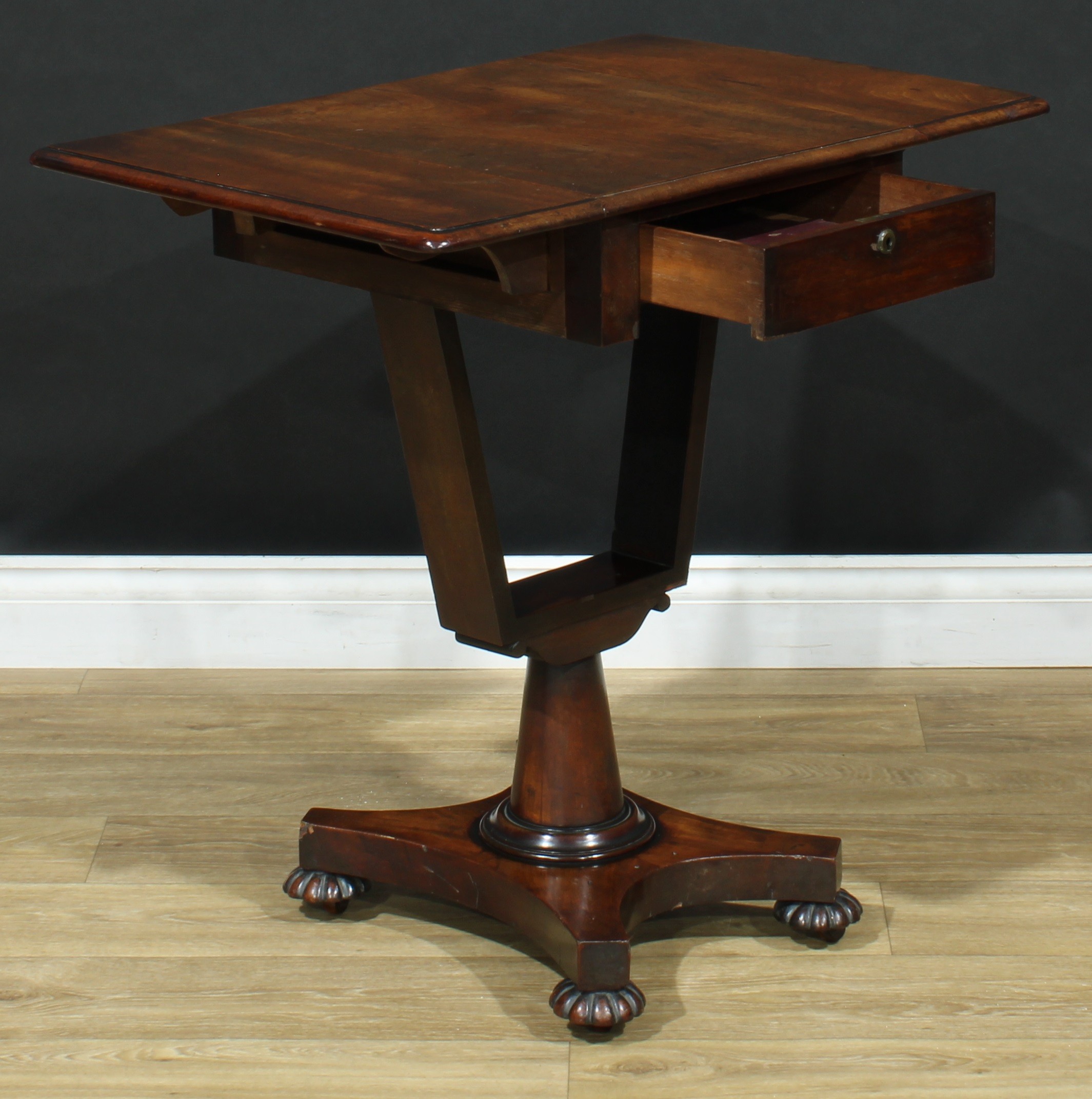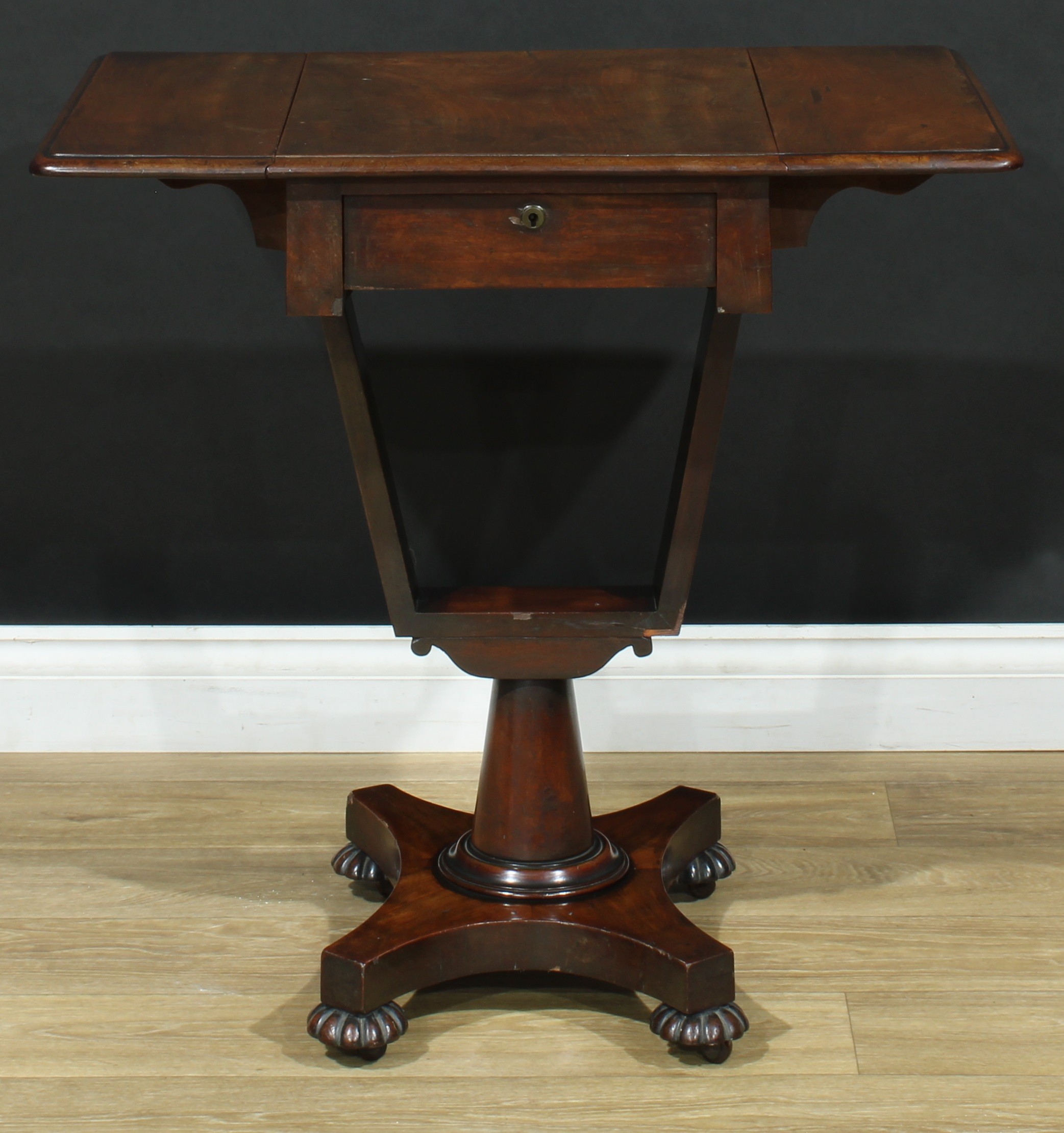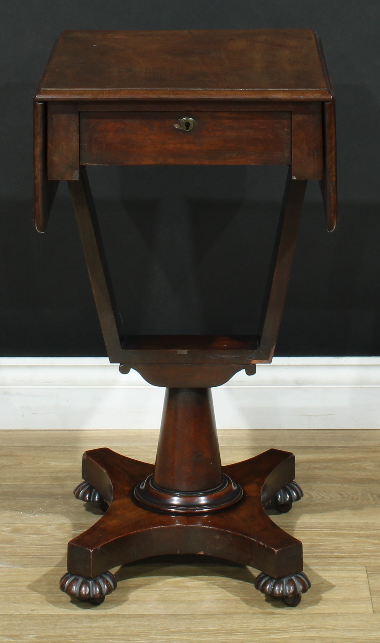 A William IV mahogany work table, rectangular top with fall leaves above a single frieze drawer, 72.5cm high, 39cm opening to 73.5cm wide, 51cm deep