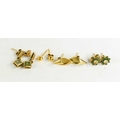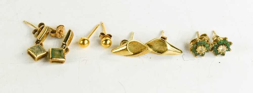 Four pairs of 9ct gold stud earrings, including a pair of flowerhead examples set with emeralds and diamond to the centres, 4.8g.