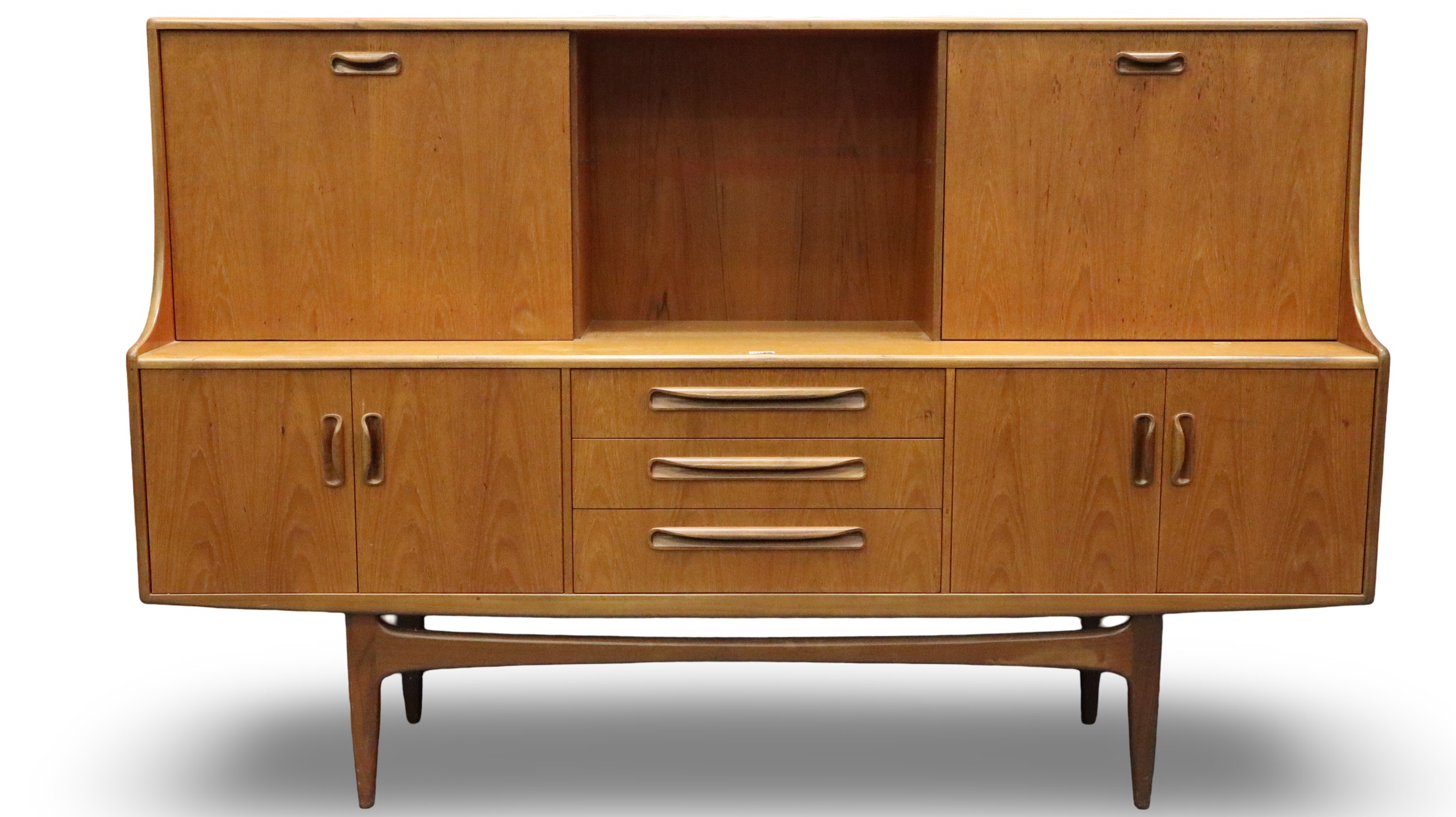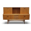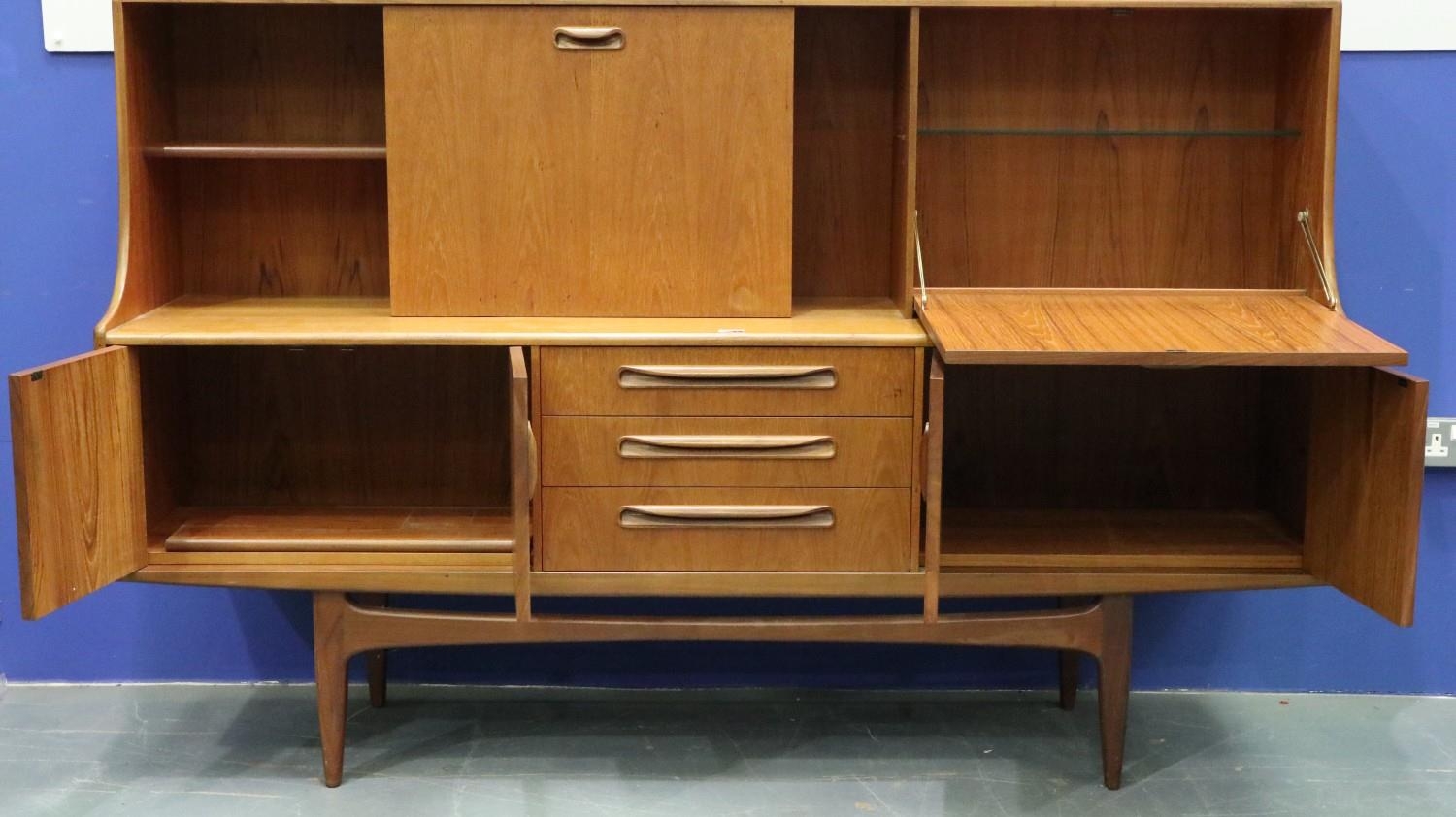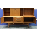 G-Plan Fresco teak combination cocktail cabinet and sideboard, with drop-front and sliding-door cabinets above a base of cupboards and drawers, 188 x 46 x 122cmH. Not available for in-house P&P