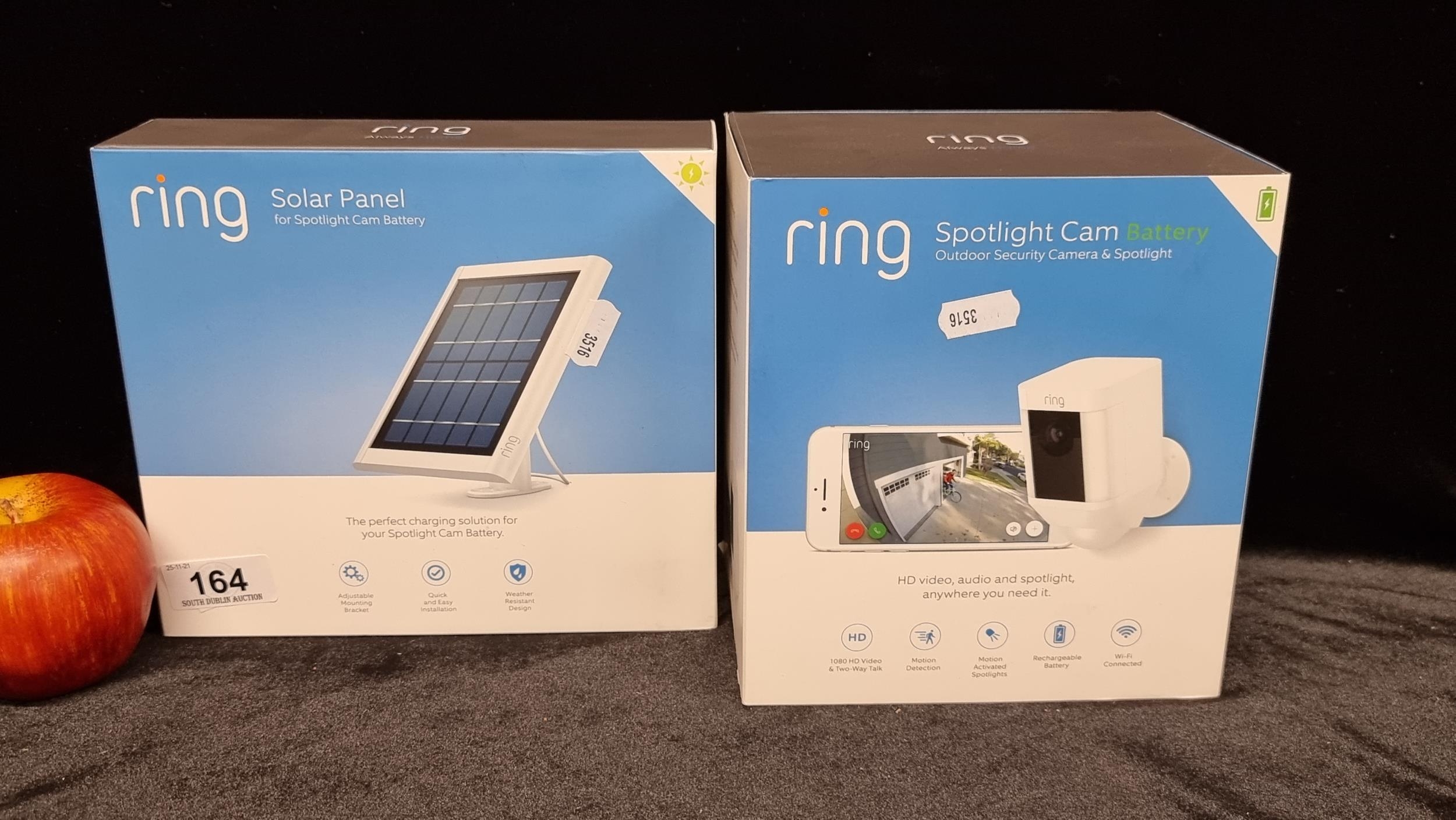 A Ring Spotlight Cam Battery operated outdoor security camera and Ring Spotlight Solar Panel charger. Both in original boxes. Great quality product, lots of features, such as adjustable wall mount, wire free, connects to mobile phone, motion sensor and alarm.