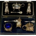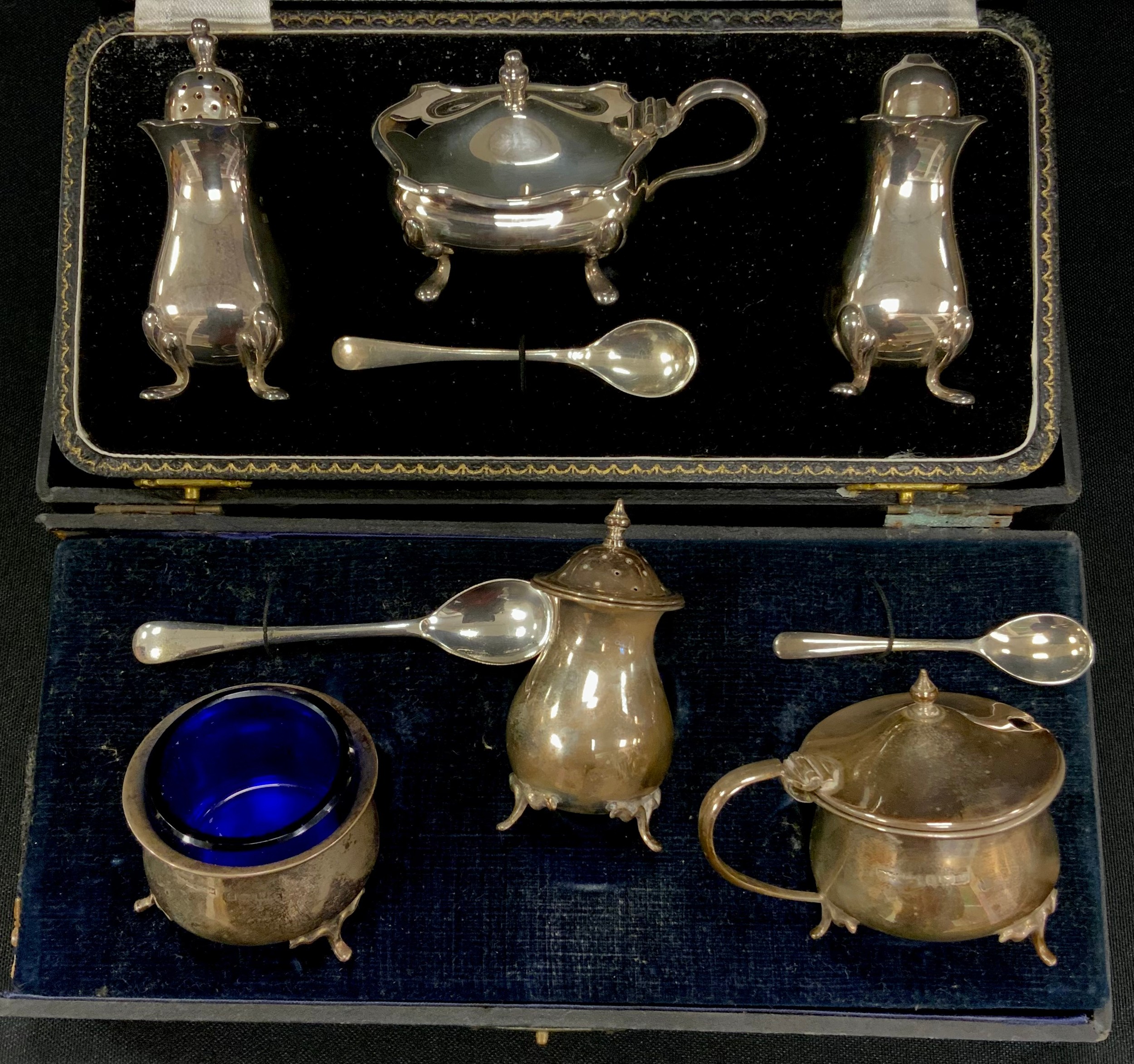 A William Suckling silver cruet set including mustard pot, salt and pepper shaker, case, Birmingham, 1959; another, Birmingham, 1946, total weighable silver 240 grams