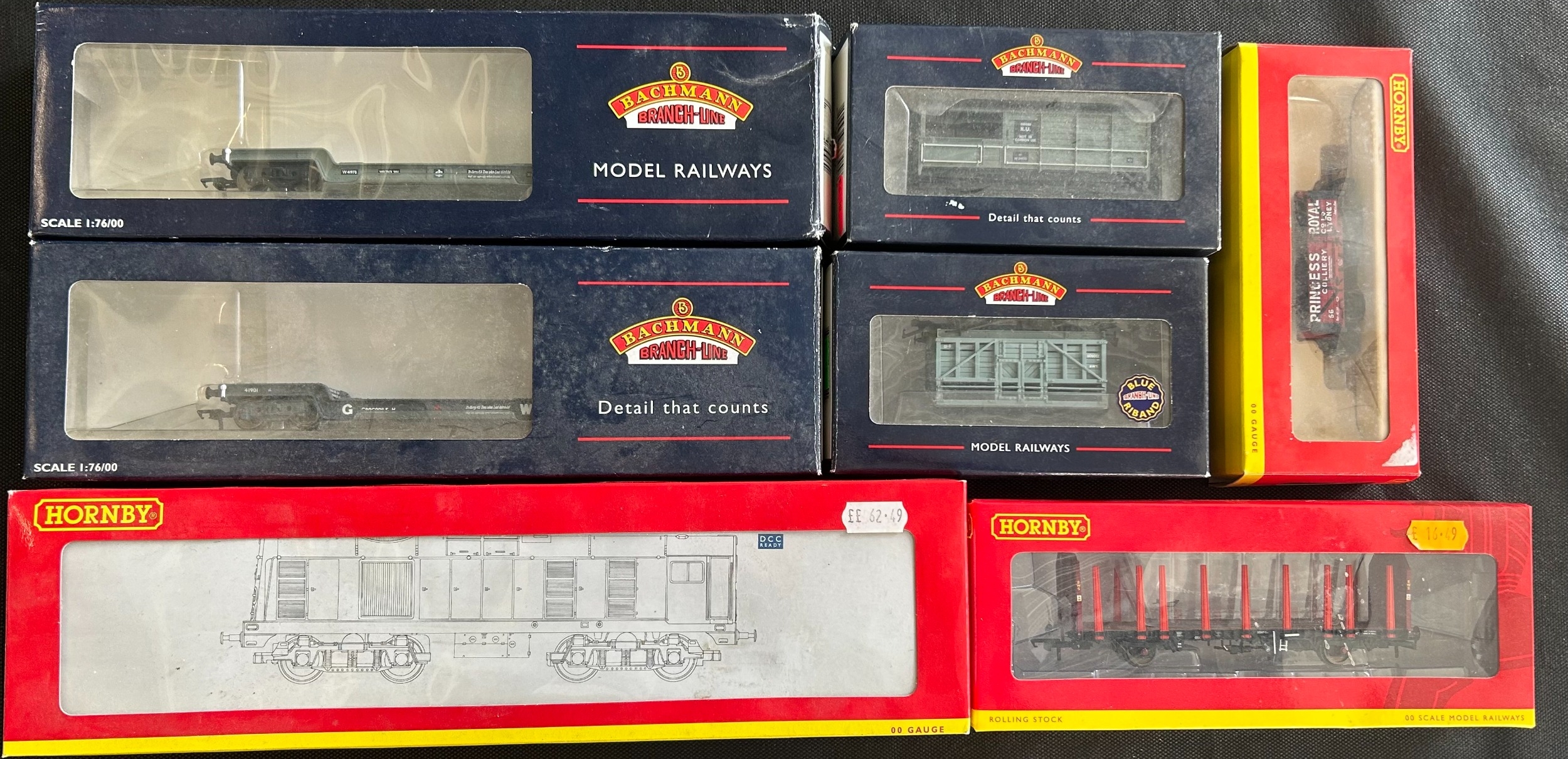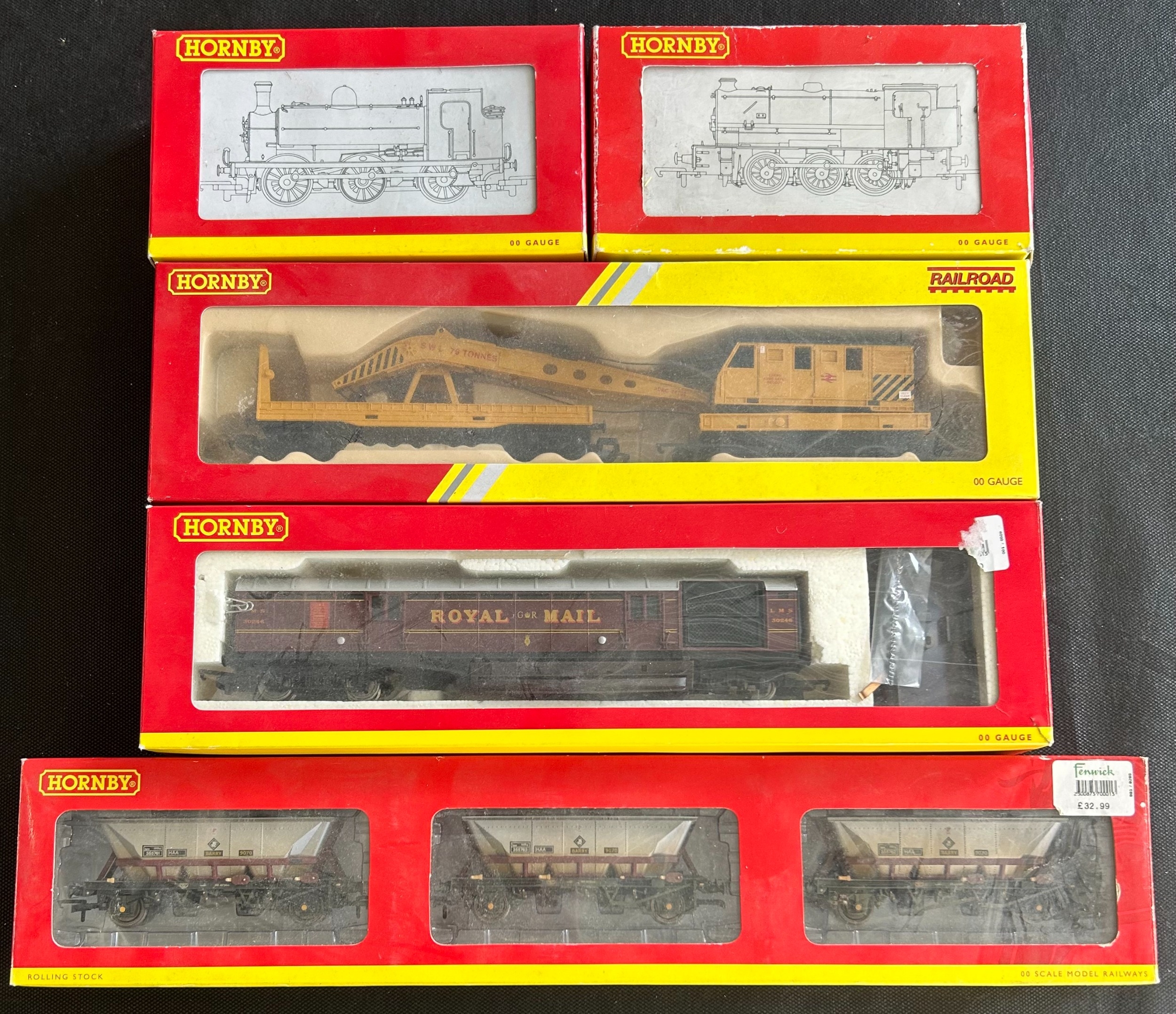 A quantity of Hornby and Bachmann OO Railway. 3 Hornby locomotives - A BR Class J94 0-6-0 saddle tank 68074 (R.2326). An LNER Class J52 0-6-0 saddle tank 3975 (R.2400A). Plus a BR Technical Services Class 20 Bo-Bo diesel electric loco 2169 (R.2763). An LMS Operating Royal Mail Coach Set. Breakdown Crane. A 3 pack MGR Coal Hoppers and an OTA Timber Wagon, etc. Plus 4 Bachmann including 2 Well Wagons and a Toad Brake Van etc. All boxed, minor wear/cleaning required. Contents GC-VGC. One buffer broken to Class 20. (12).