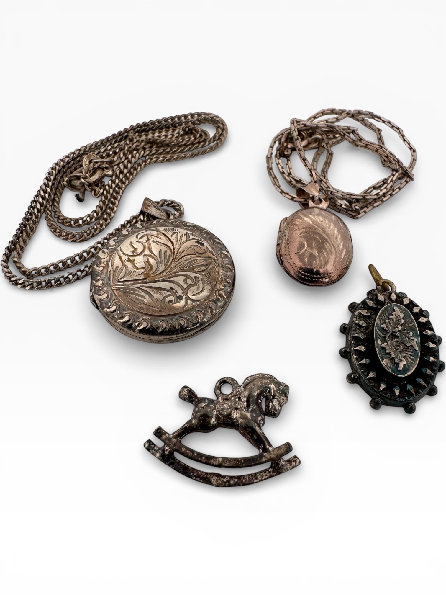 Two Silver Photograph Lockets on Chains with Other Silver Items. 14.42g