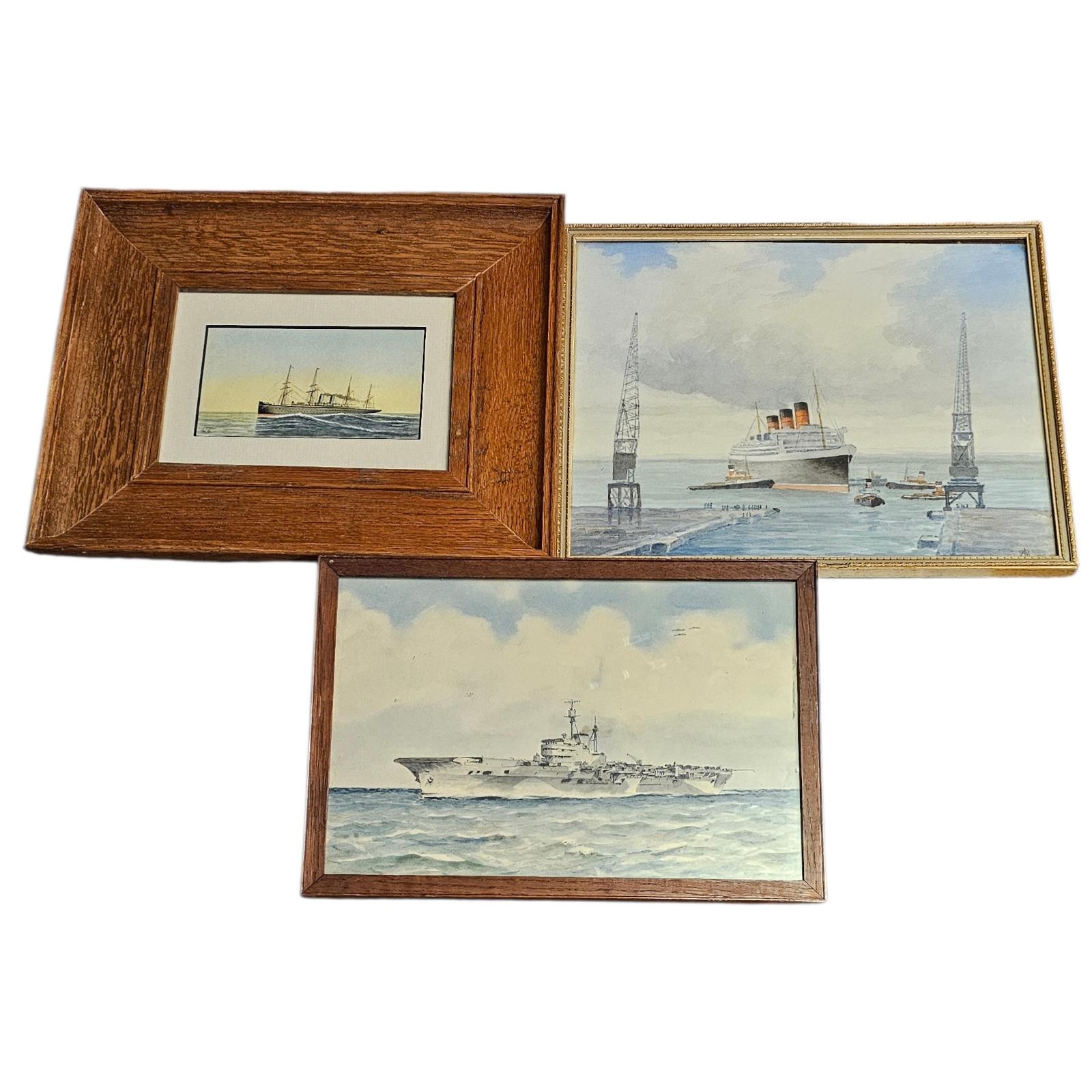 Comprising a study of an Aircraft Carrier, WWII-era Illustrious-class, at sea, the RMS Queen Mary entering dock with tugs and cranes, initialled 'W.J.S.’, a three masted steamship at sea, initialled 'W.J.S.’, all framed and glazed, various sizes.