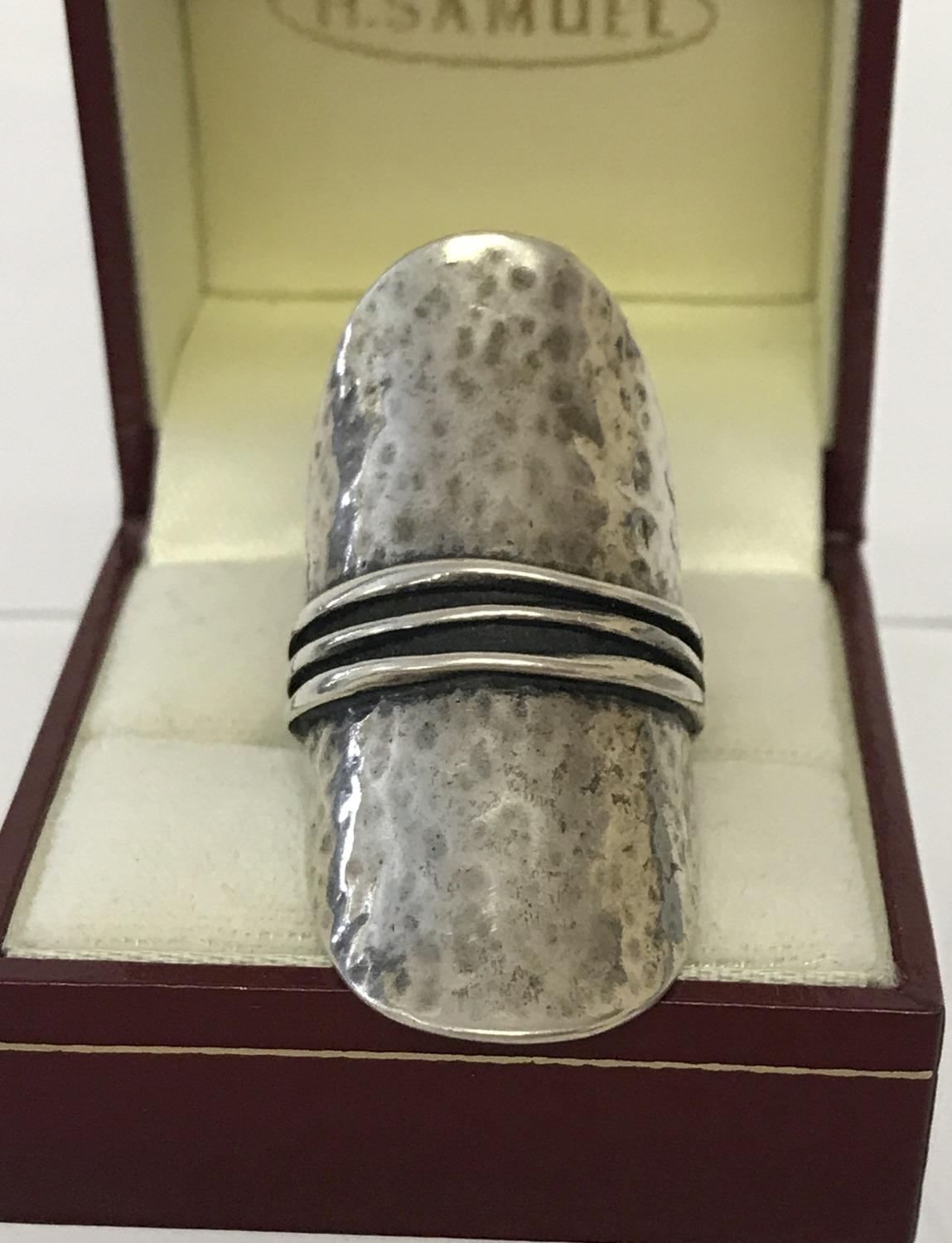 A modern design large silver ring with hammered effect finish. Ring size P. Total weight approx. 11.6g.