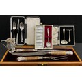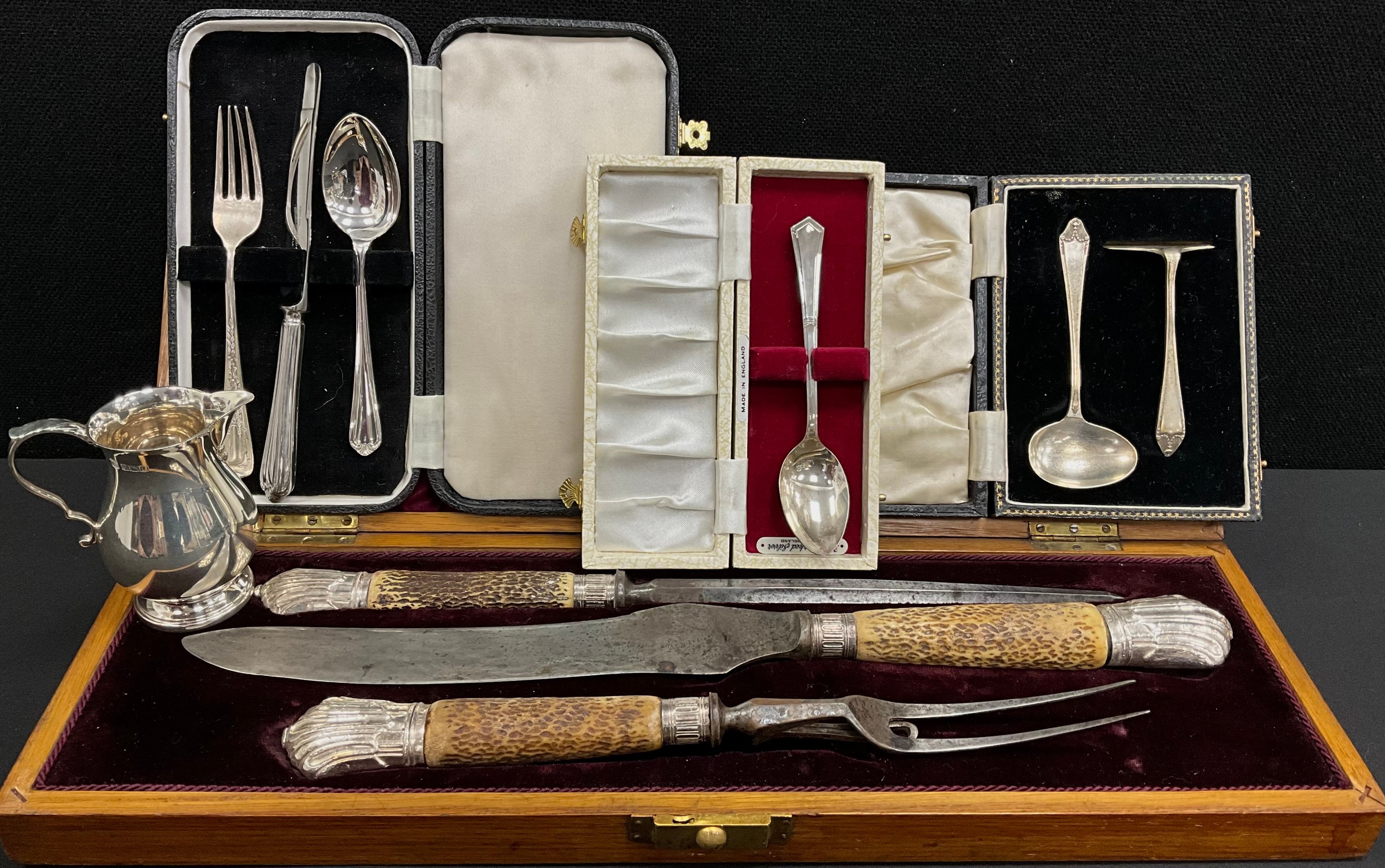 Silver & Plate - a Victorian silver mounted horn handled three piece carving set, Sheffield 1893, oak case, silver cream jug, Birmingham 1969, silver fork, and spoon, 4.8ozt (3) silver plated baby feeding spoon and food pusher, boxed etc
