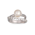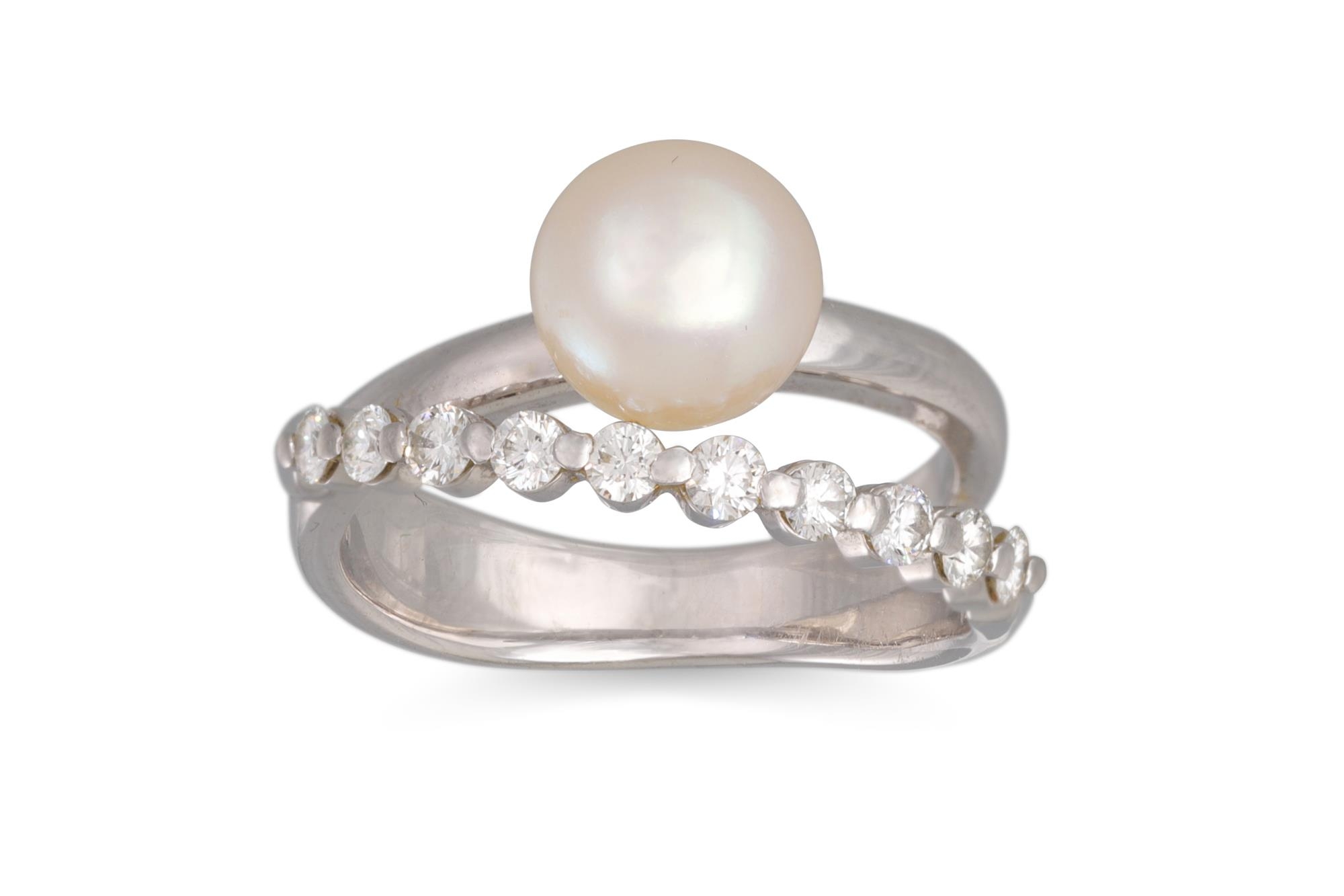 A PEARL AND DIAMOND TWO ROW DRESS RING, mounted in platinum, size L - M