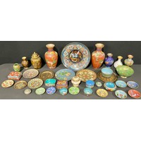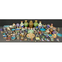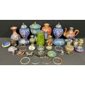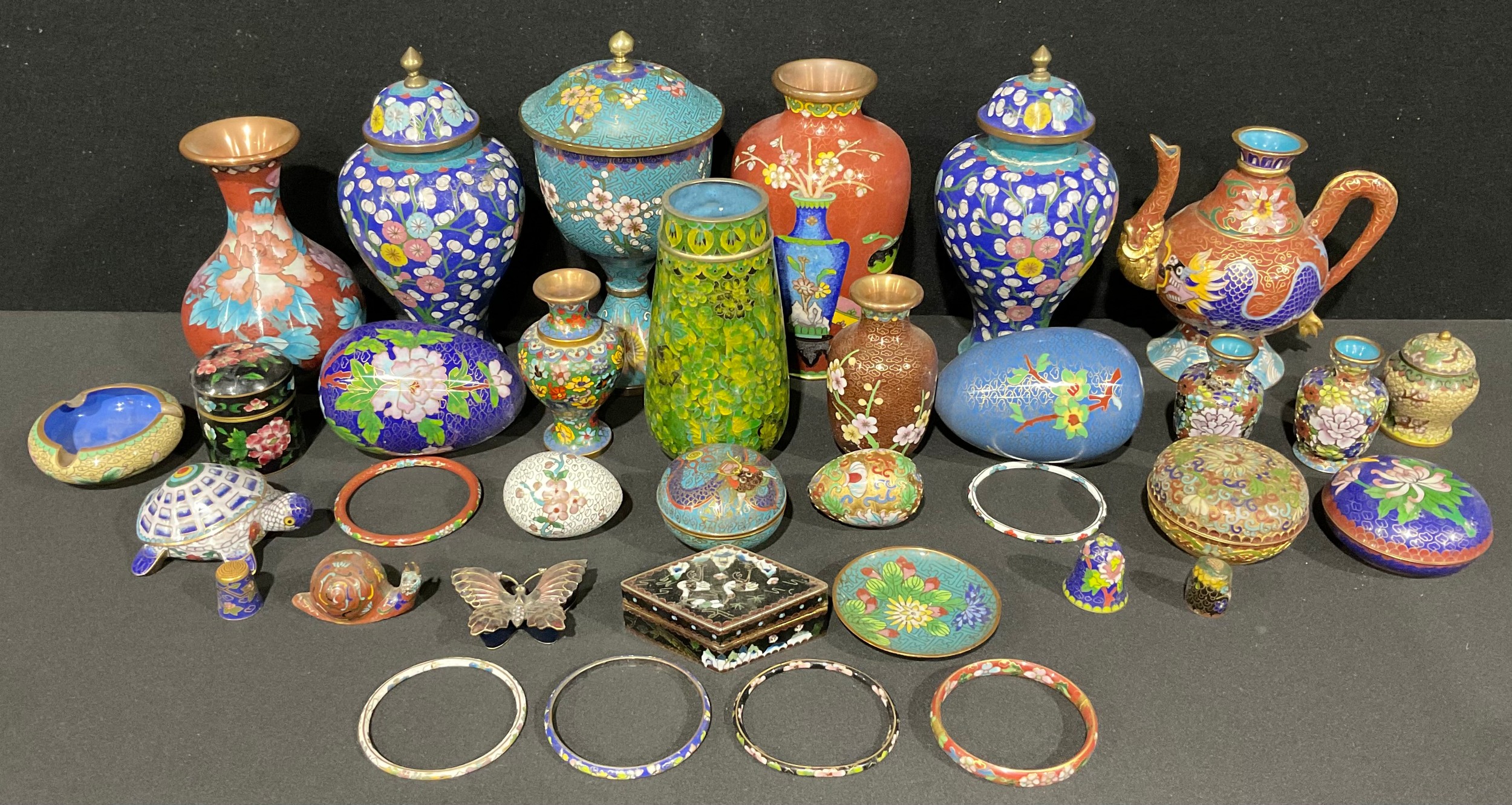 A pair of Chinese cloisonné enamel ginger jars and covers, blossoming prunus patterns on blue grounds within Ruyi borders, spearhead finials, 20cm high overall each; others similar including vases, bangles, coffee pot, etc (qty)