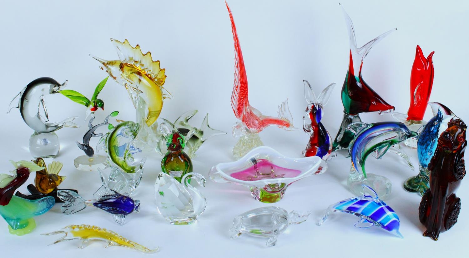 Selection of Murano and other glass fish, birds and animal figures etc. Tallest H39cm