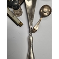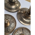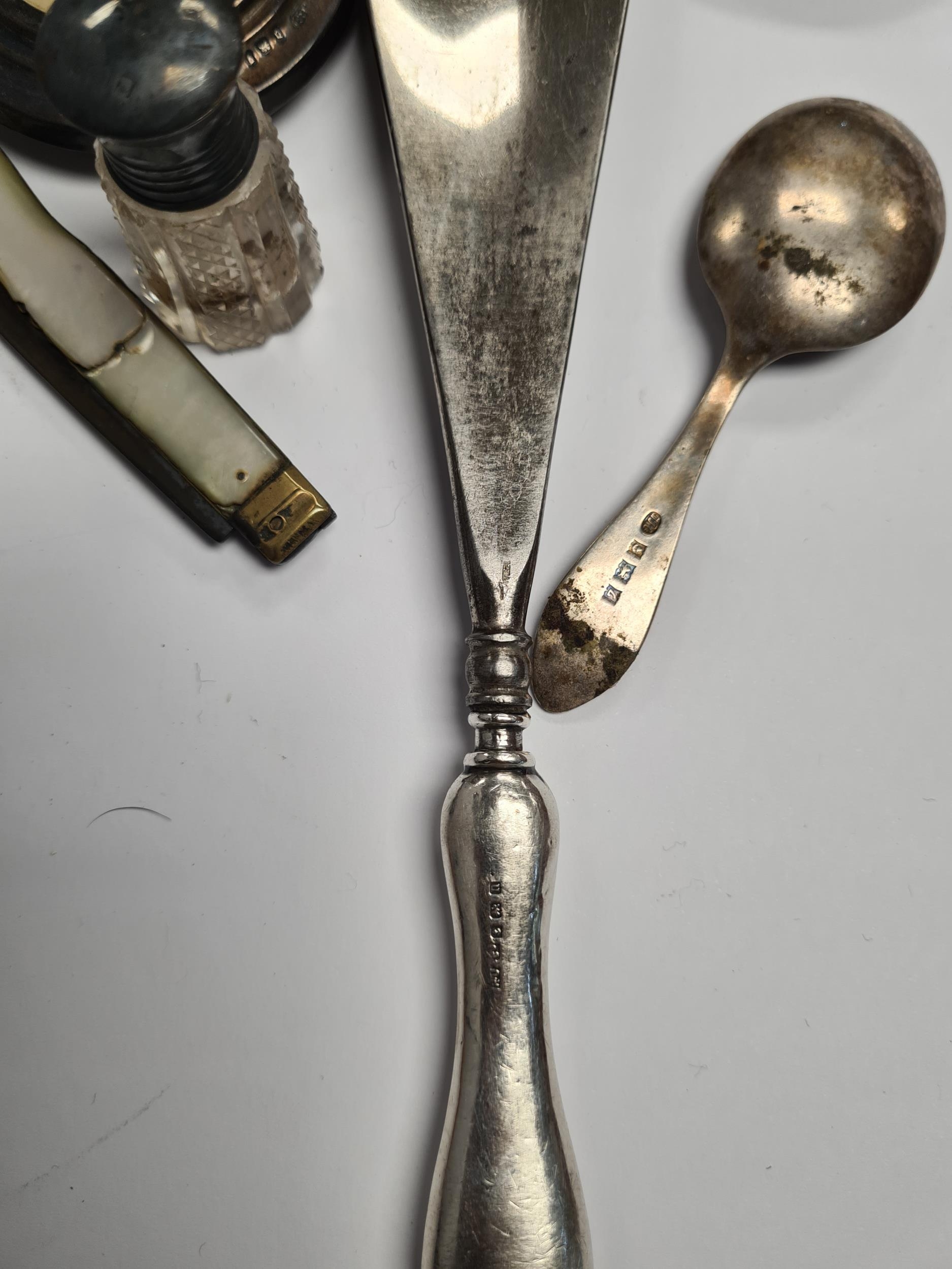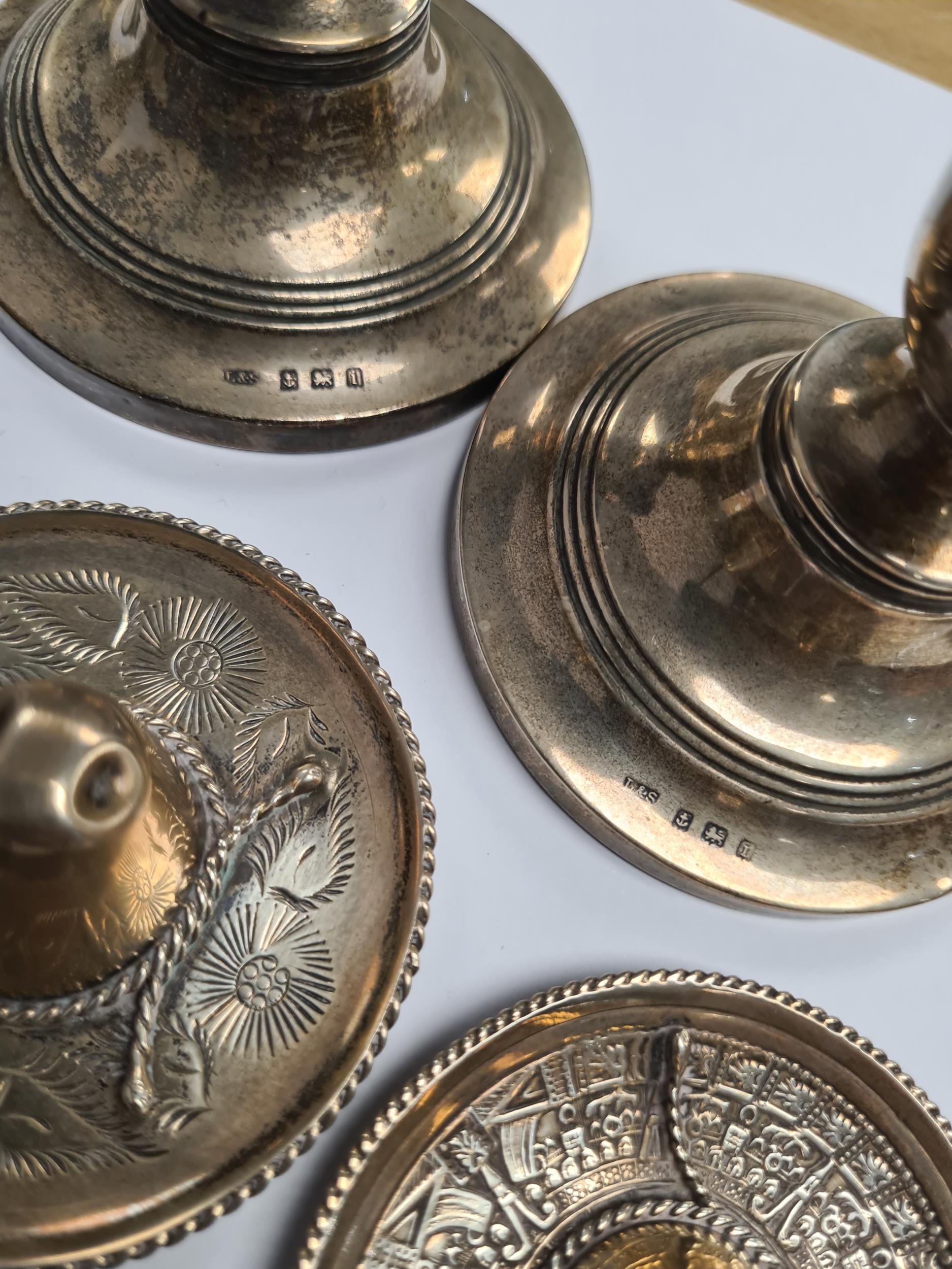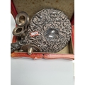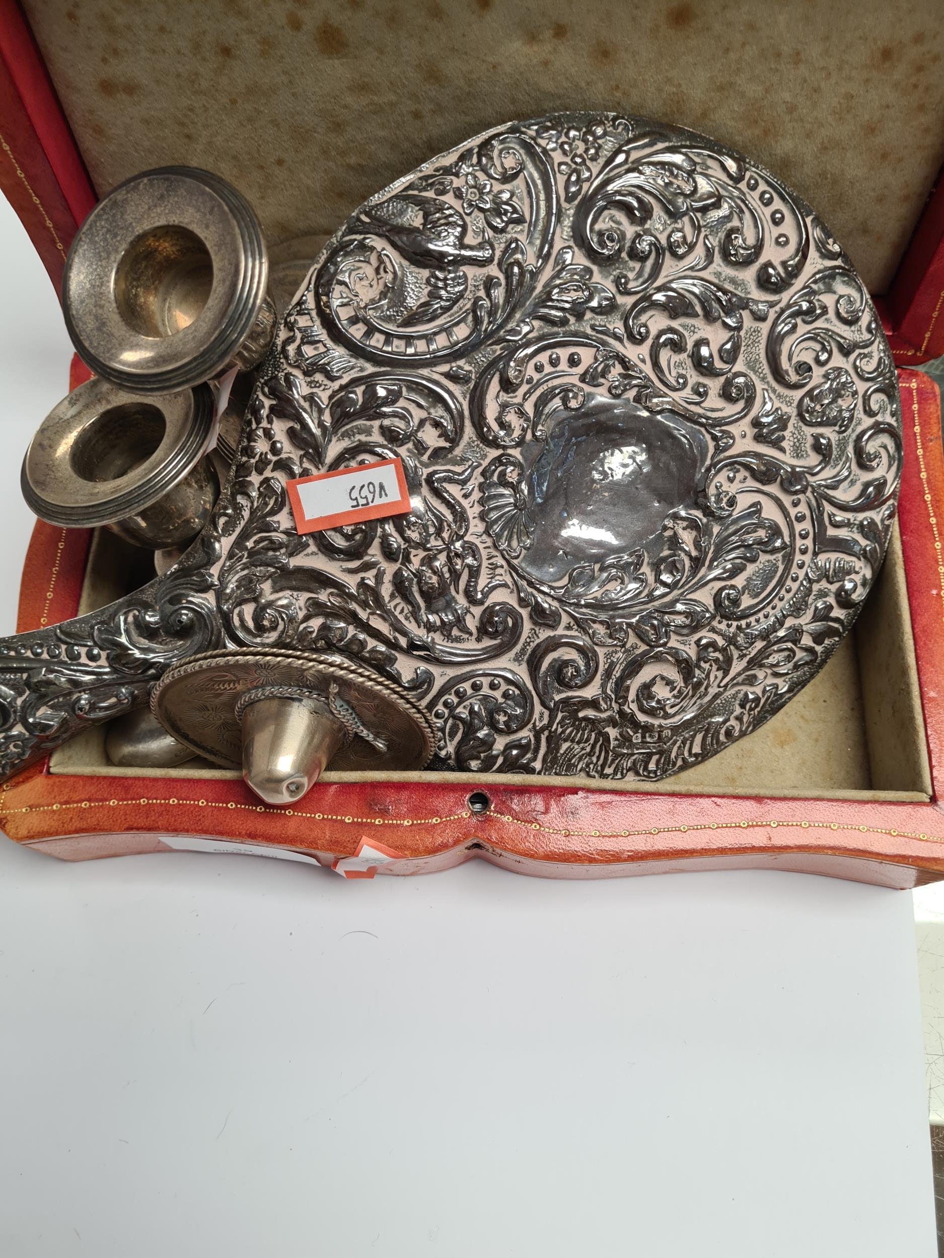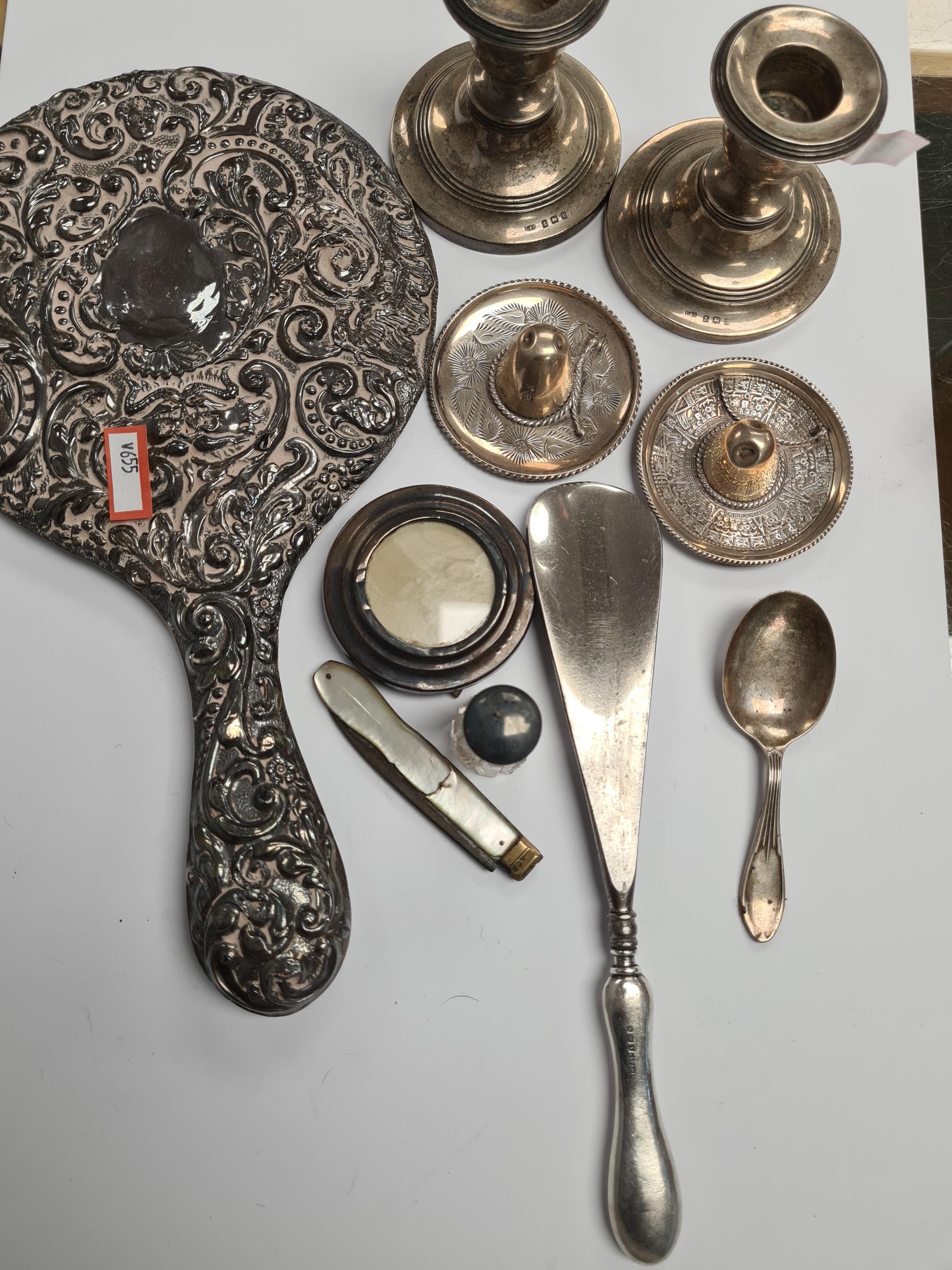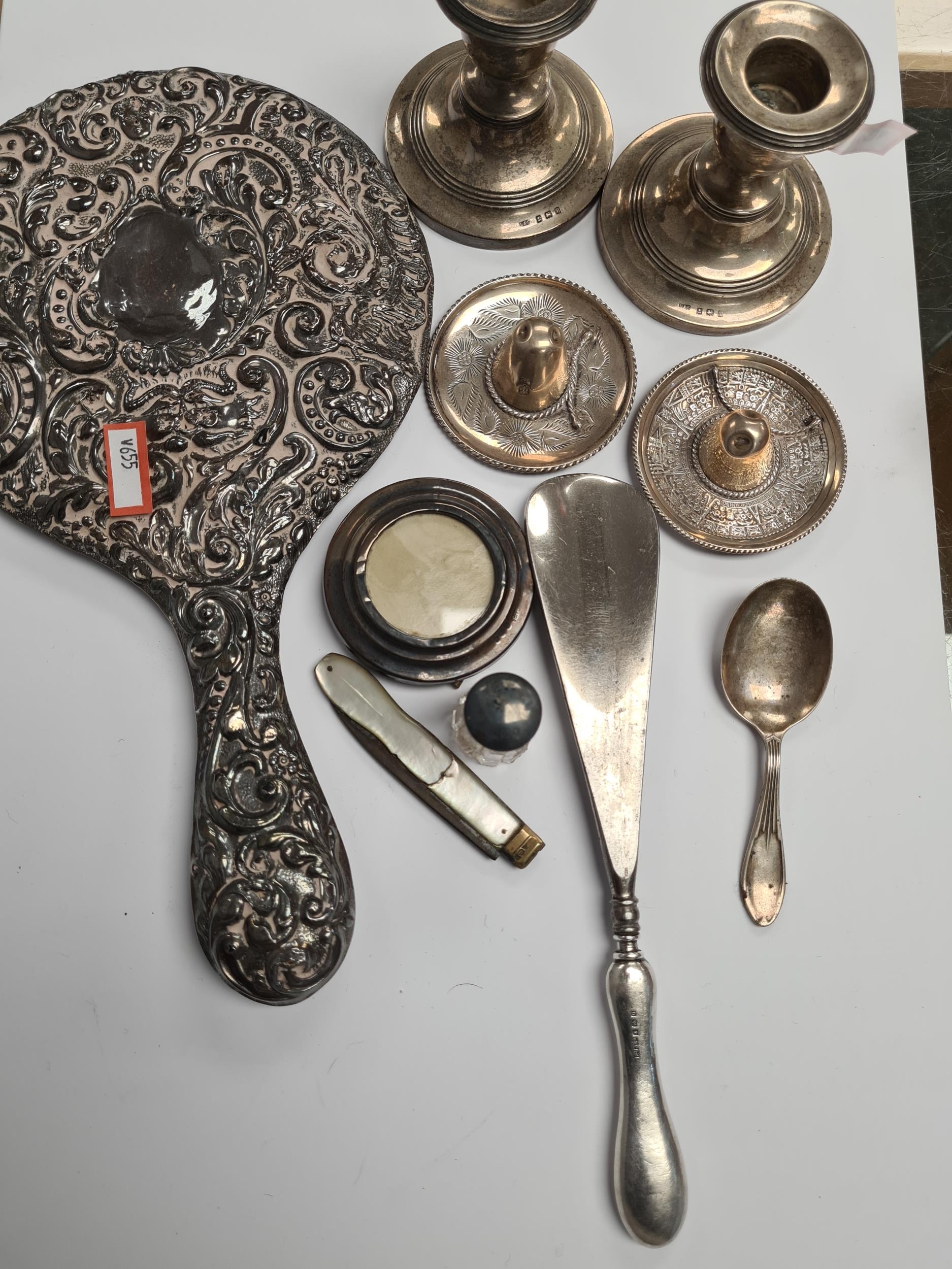 A silver heavily embossed back mirror. Hallmarked Birmingham 1912, W J Myatt and Co. A pair of miniature candlesticks, photo frame, pocket knife, shoe horn. Condition Report: some ware