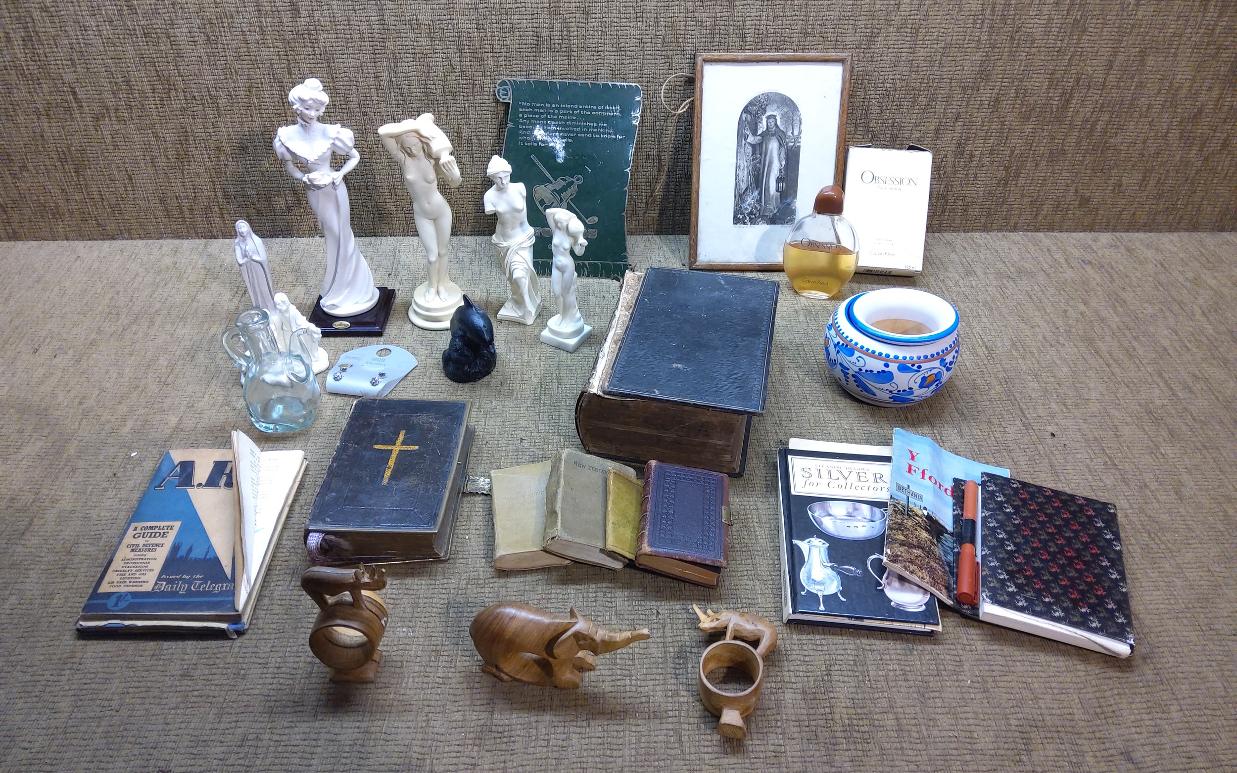 Collectable items including treen ornaments, a Family Bible dated 1815 and a half bottle of Obsession for men.