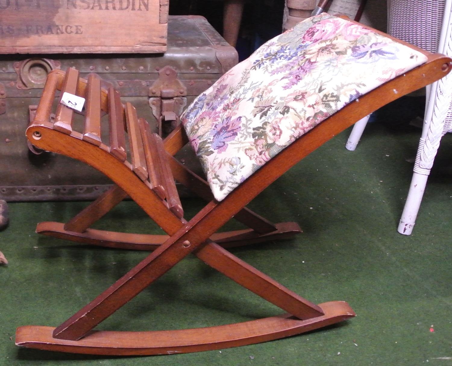 A rocking foot stool with decorative upholstery.