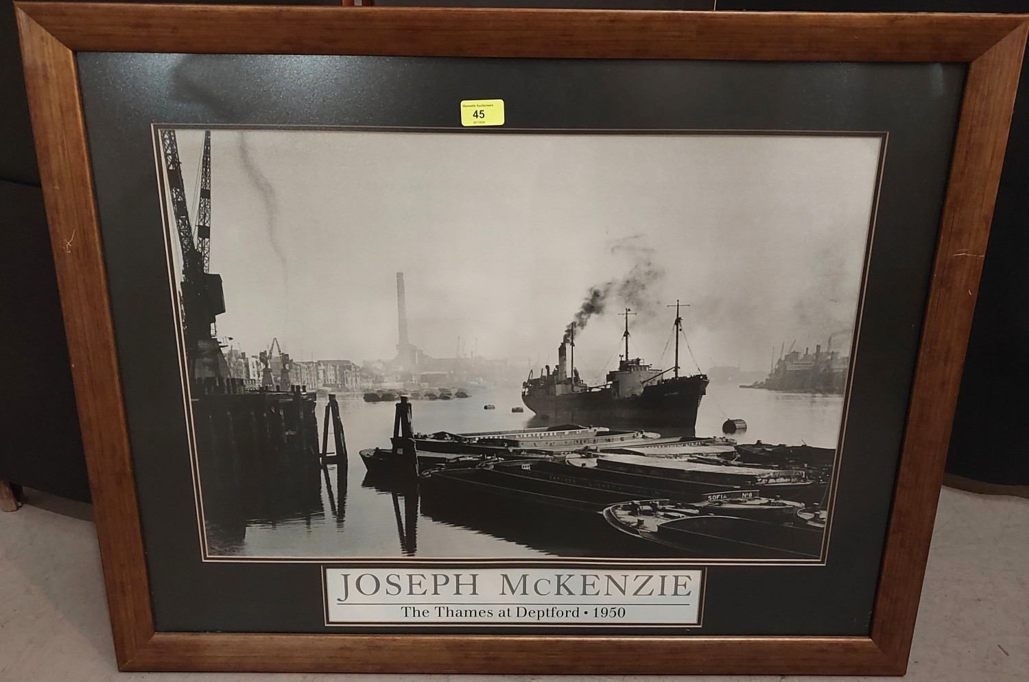 The Joseph McKenzie, Deptford 1950 print of steam boat etc., reproduction prints framed and glazed and a small watercolour of the Queen Mary.