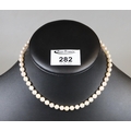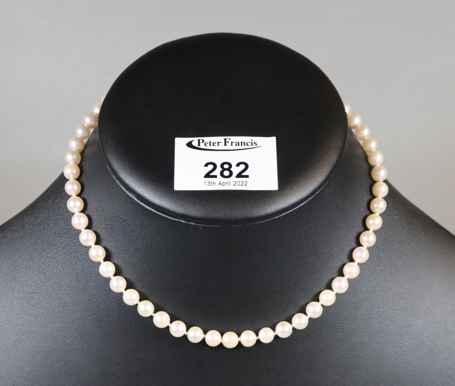 String of cultured pearls with 9ct gold pearl set clasp.(B.P. 21% + VAT)
