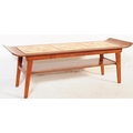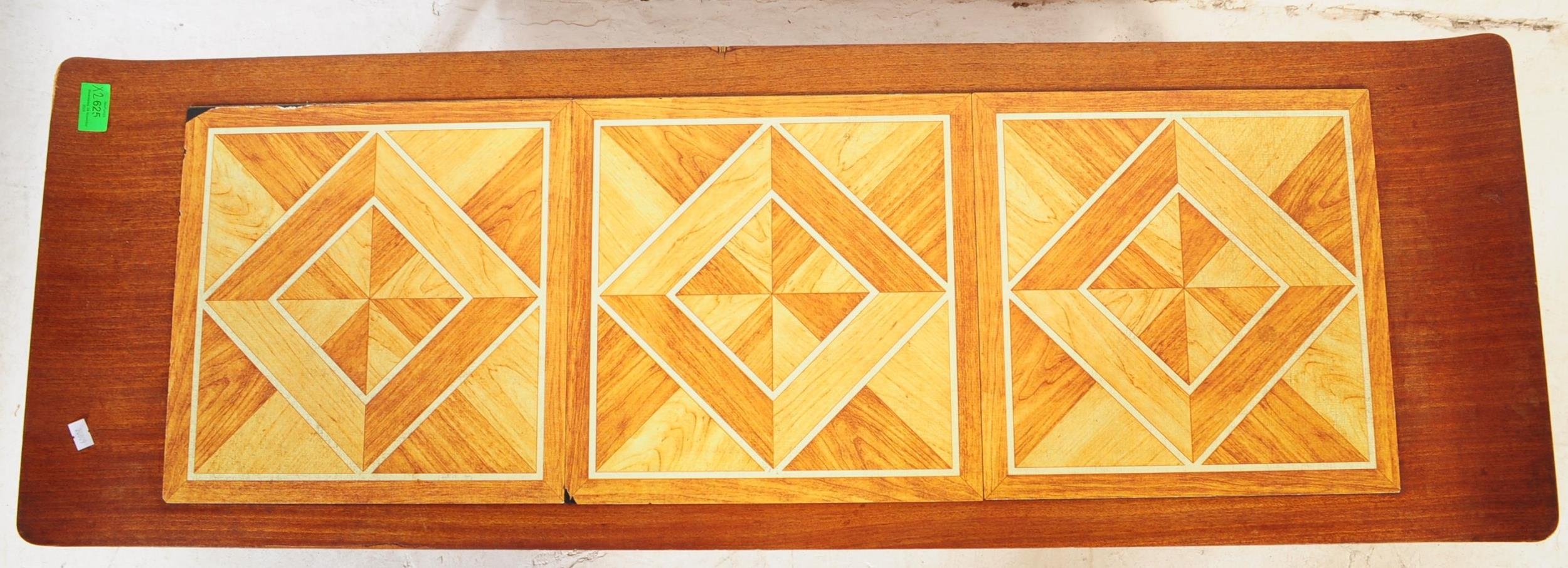 Two retro mid 20th century teak coffee tables / occasional tables to include a drop leaf example alongside another with faux marquetry inlay to the top.