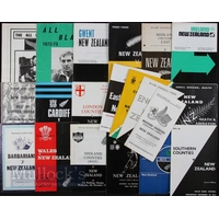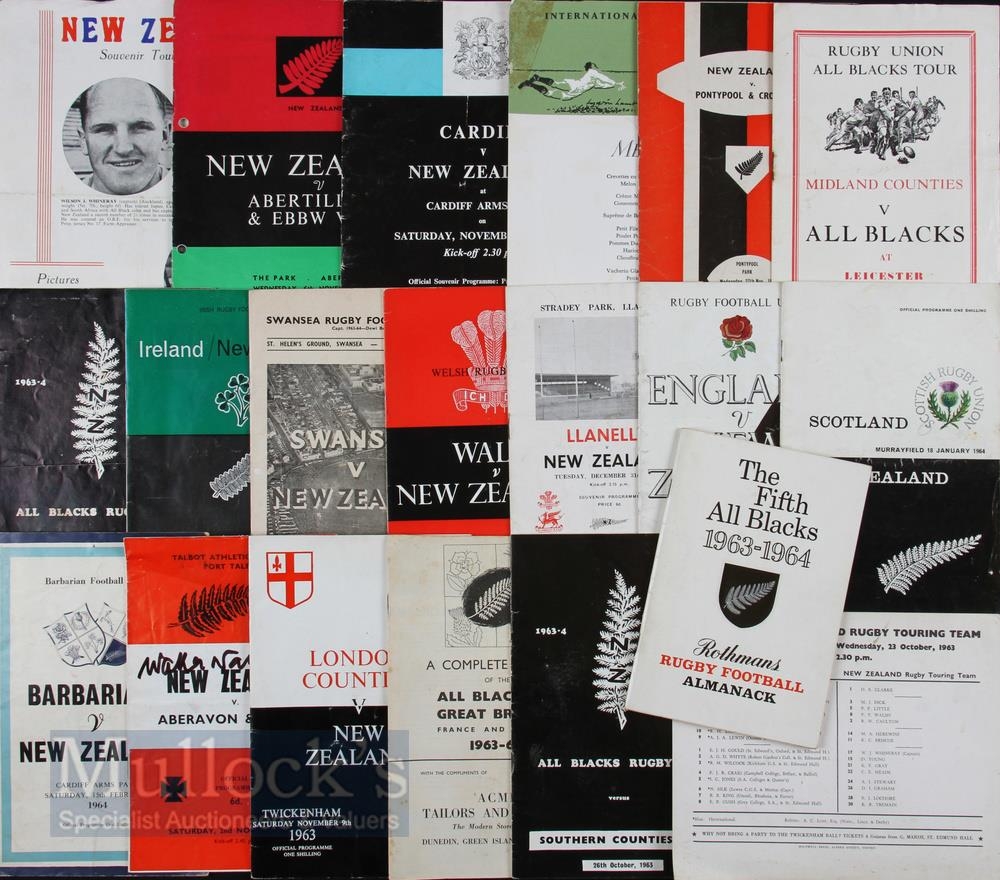 1963-4 NZ All Blacks Tour Rugby Programmes etc (20): Fifteen issues inc all tests in the UK & Ireland from this tour when only one game was lost; plus the Rothmans Rugby Almanack for the tour, an Itinerary, a souvenir picture brochure, a pirate as well as official issue for the Midland s game and a Gala Dinner card with the Scots test. Waka Nathan has boldly signed the Aberavon/Neath issue. Great selection, generally VG