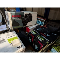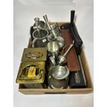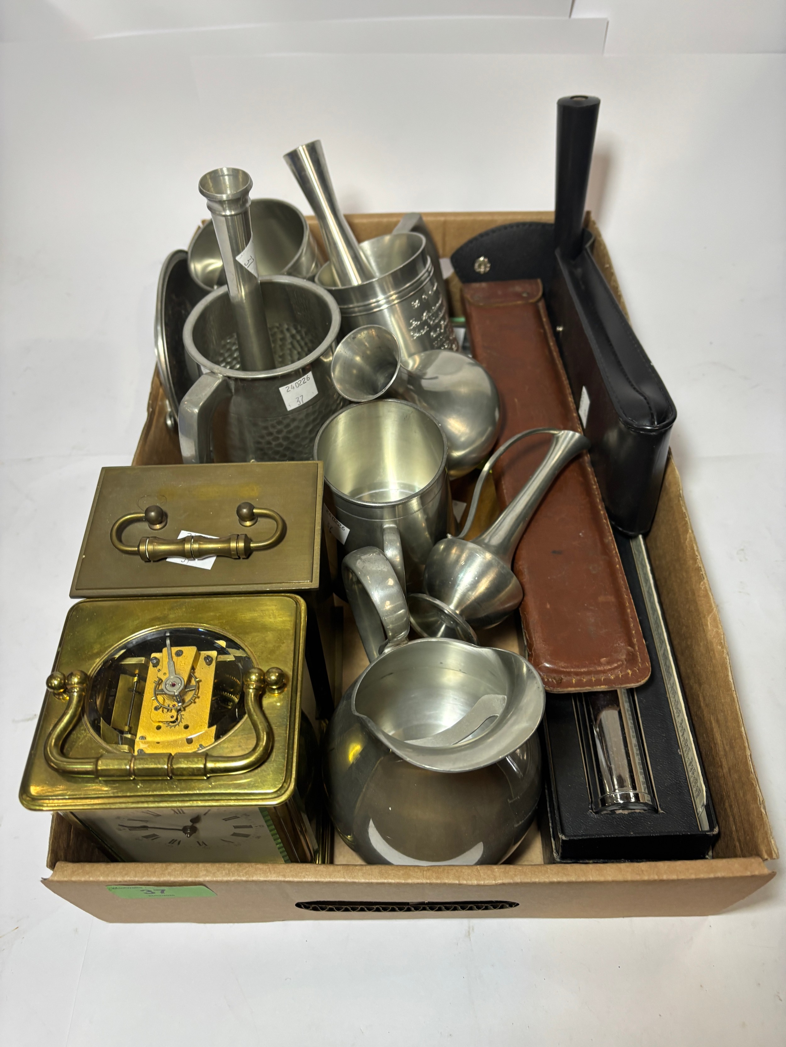A large brass carriage clock, another, Otis calculator, pewter tankard etc.