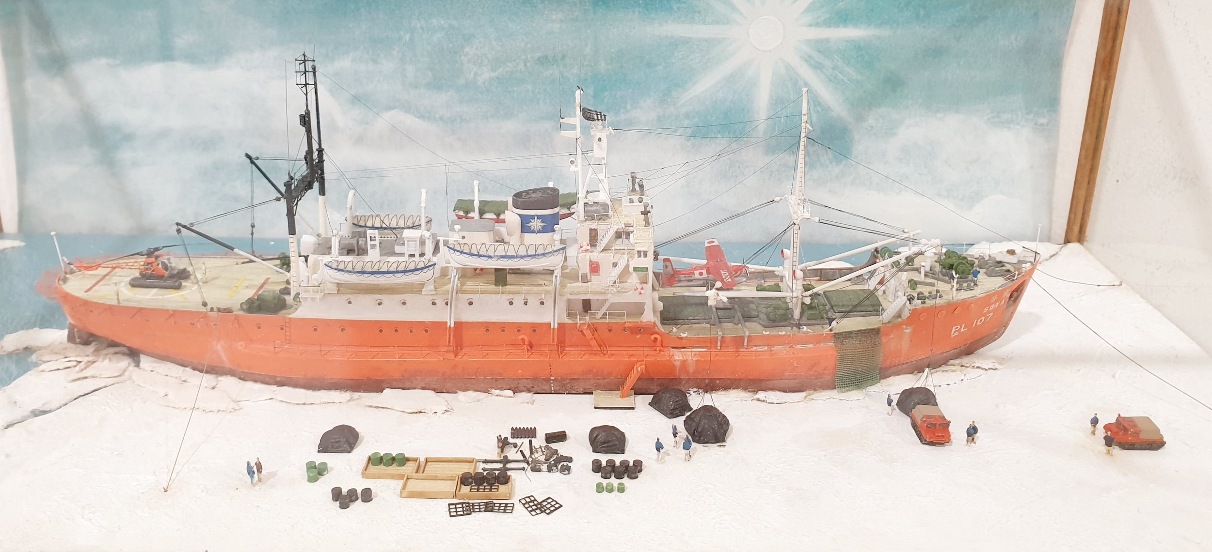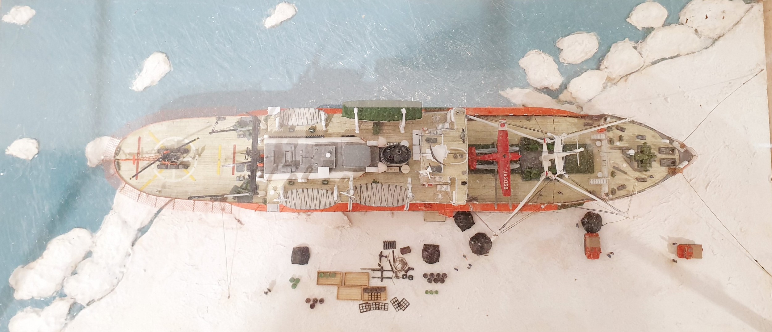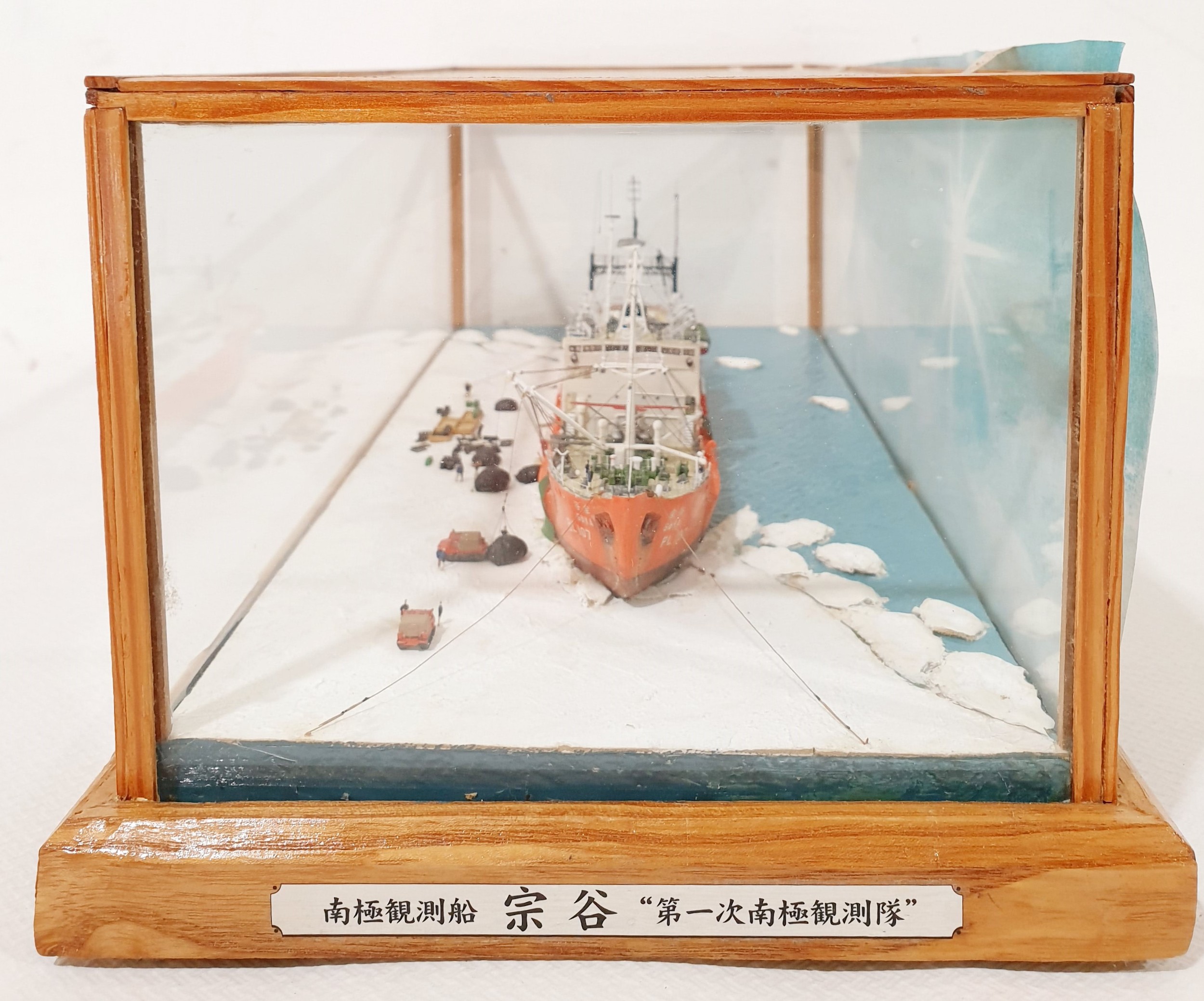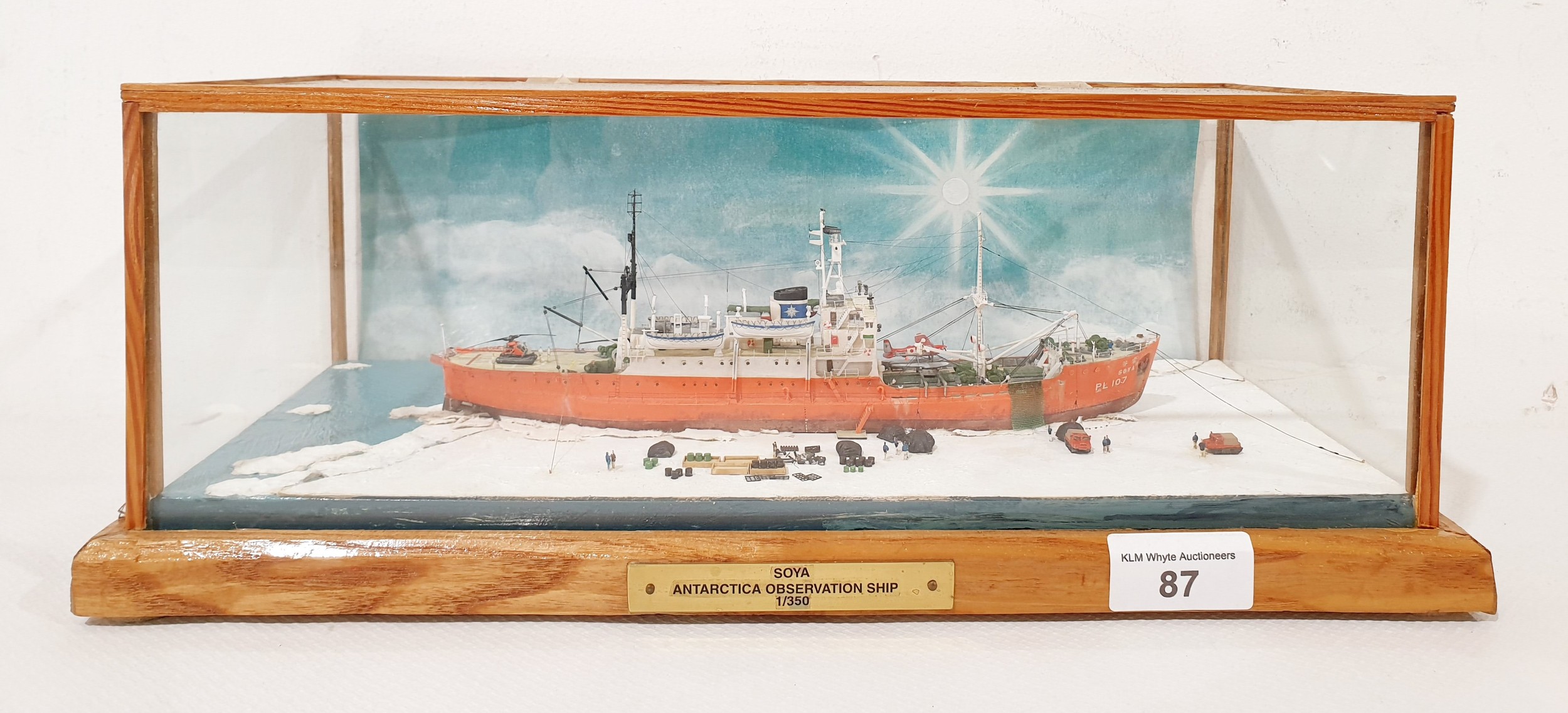 A 1:350 scale model diorama of 'Soya' Antarctica Observation Ship in wood and glass case, 37x18.5x14cm. No Shipping. Arrange collection or your own packer and shipper, please.